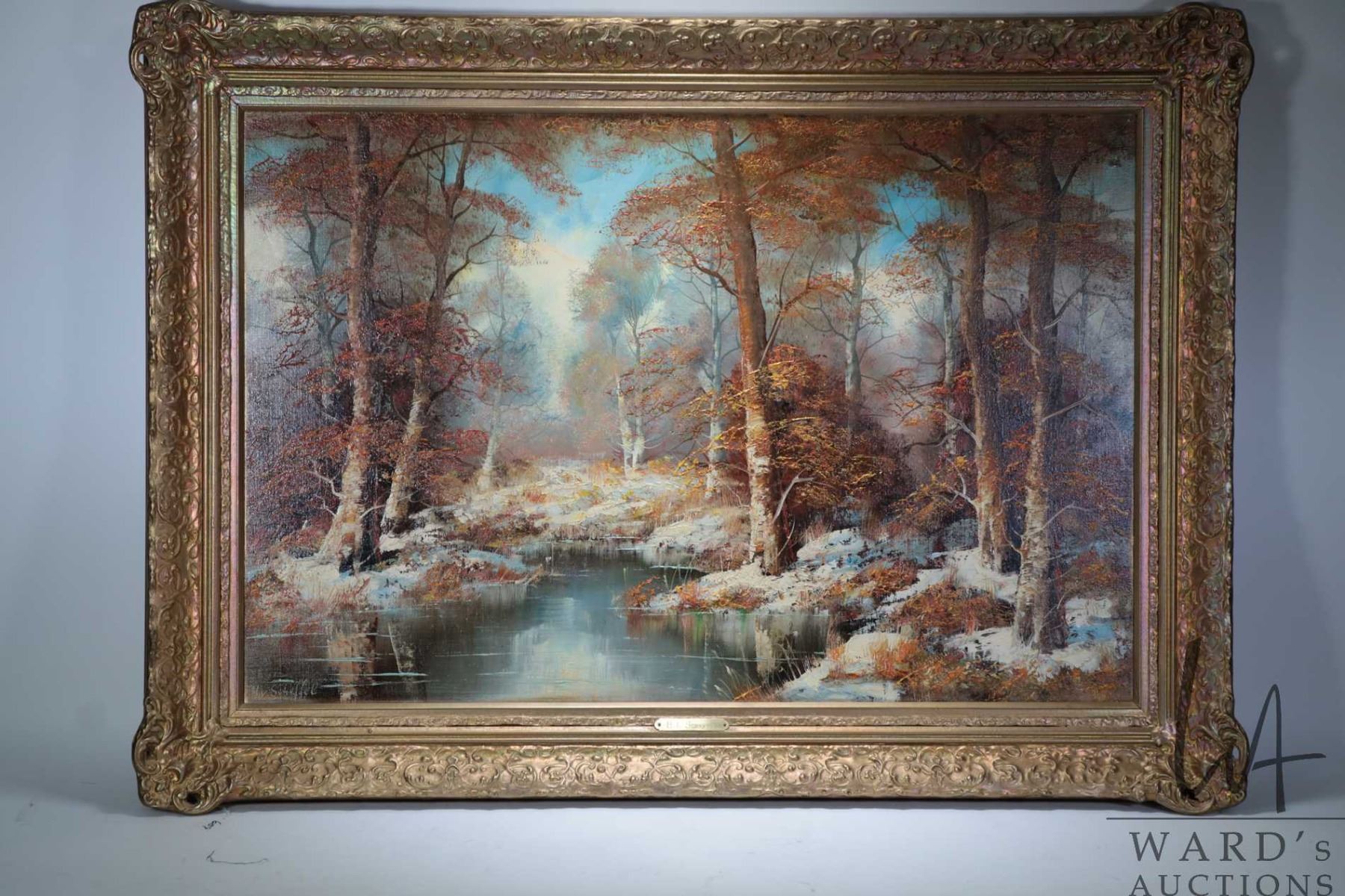 Gilt framed oil on canvas painted autumnal forest scene, signed by artist H. L. Scheffel, 24" X 36". Note: Not available for shipping. Local pickup only