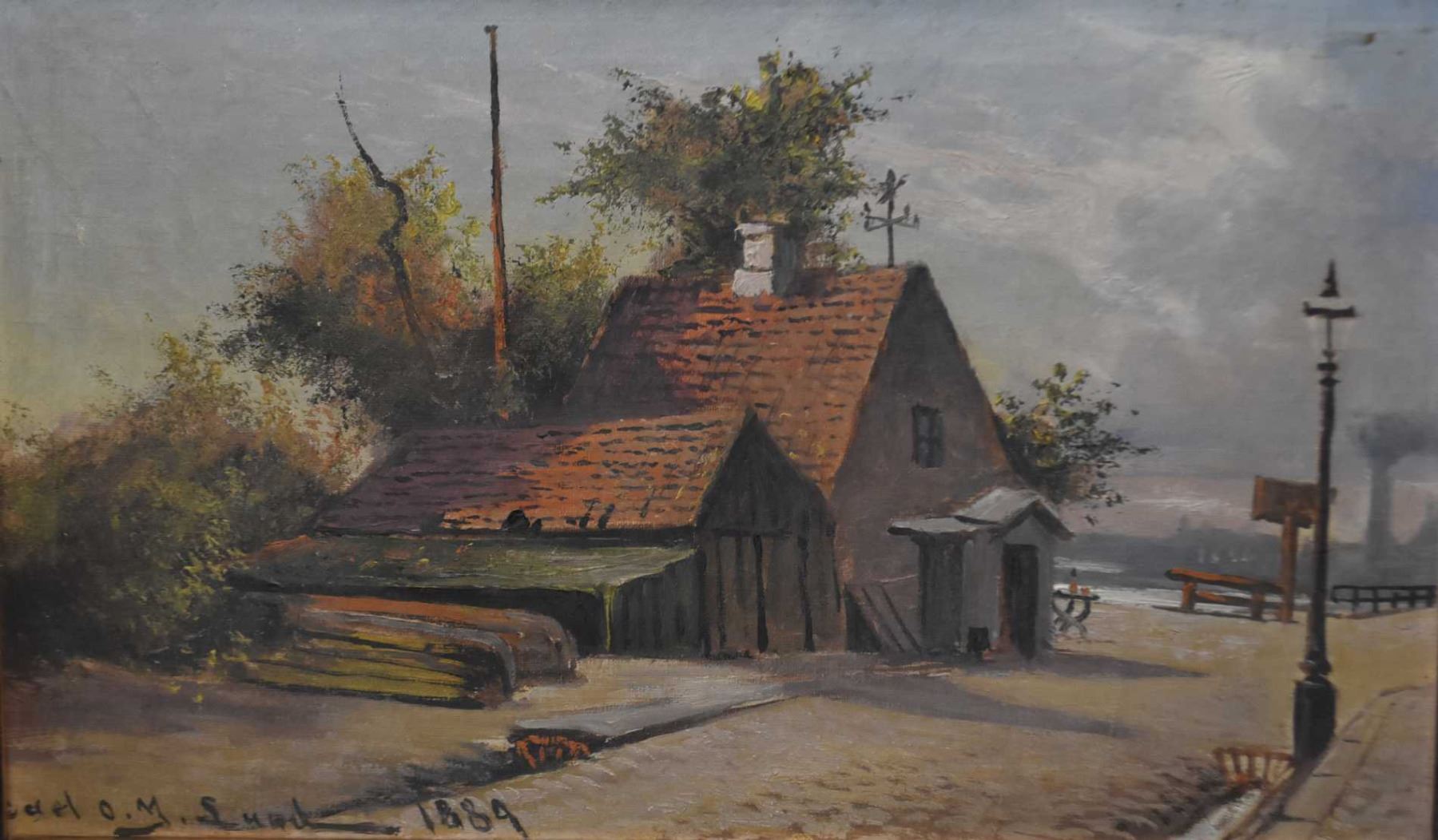 Gilt framed oil on canvas painting of a Copenhagen city scape, dated 1889 and signed by artist Carl Lund (1857-1936), 17" X 11"