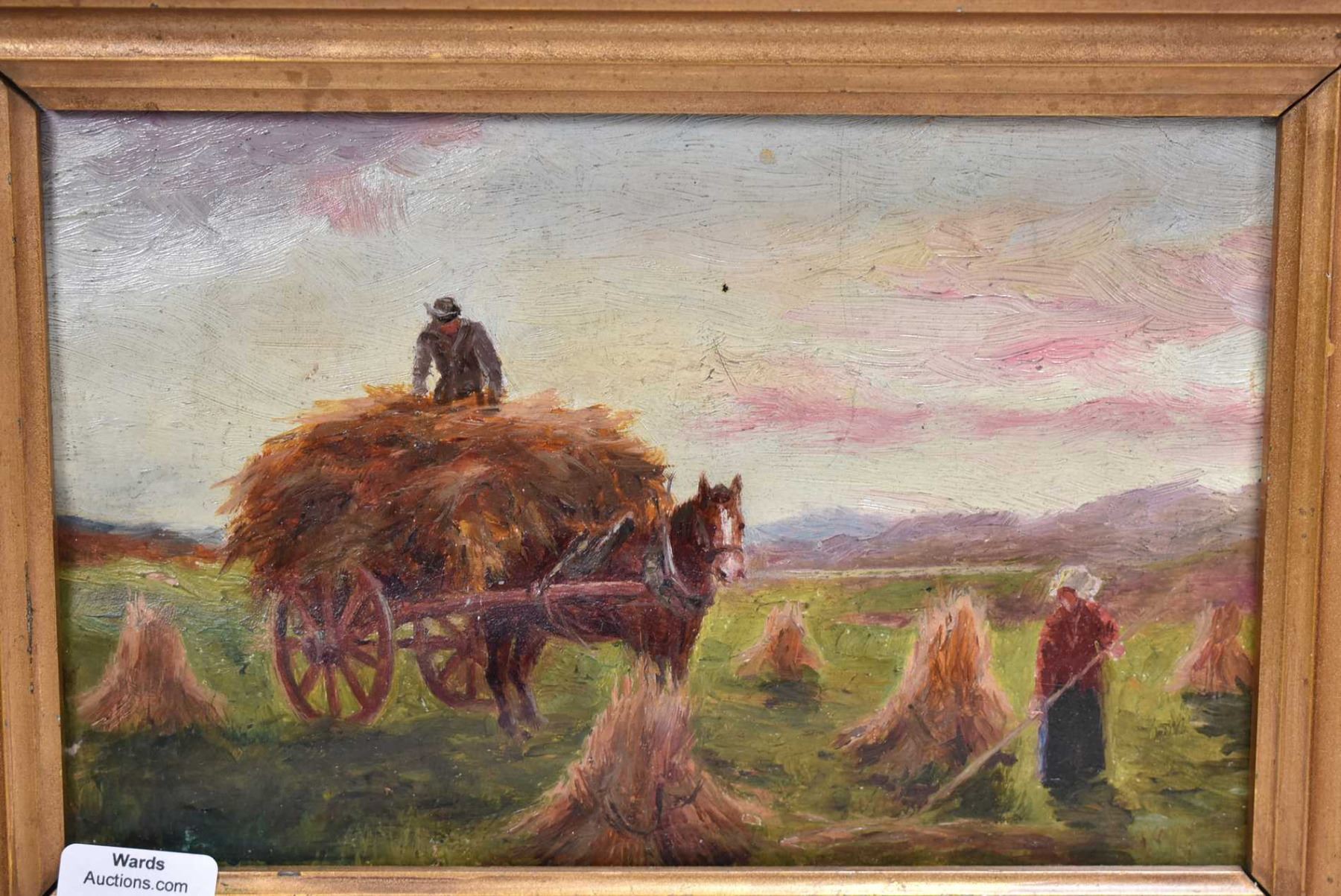 Gilt framed oil on canvas painting of a Dutch windmill, no artist signature seen, 18" X 12" and a small gilt framed oil paper painting of hayfield workers 5" X 8"