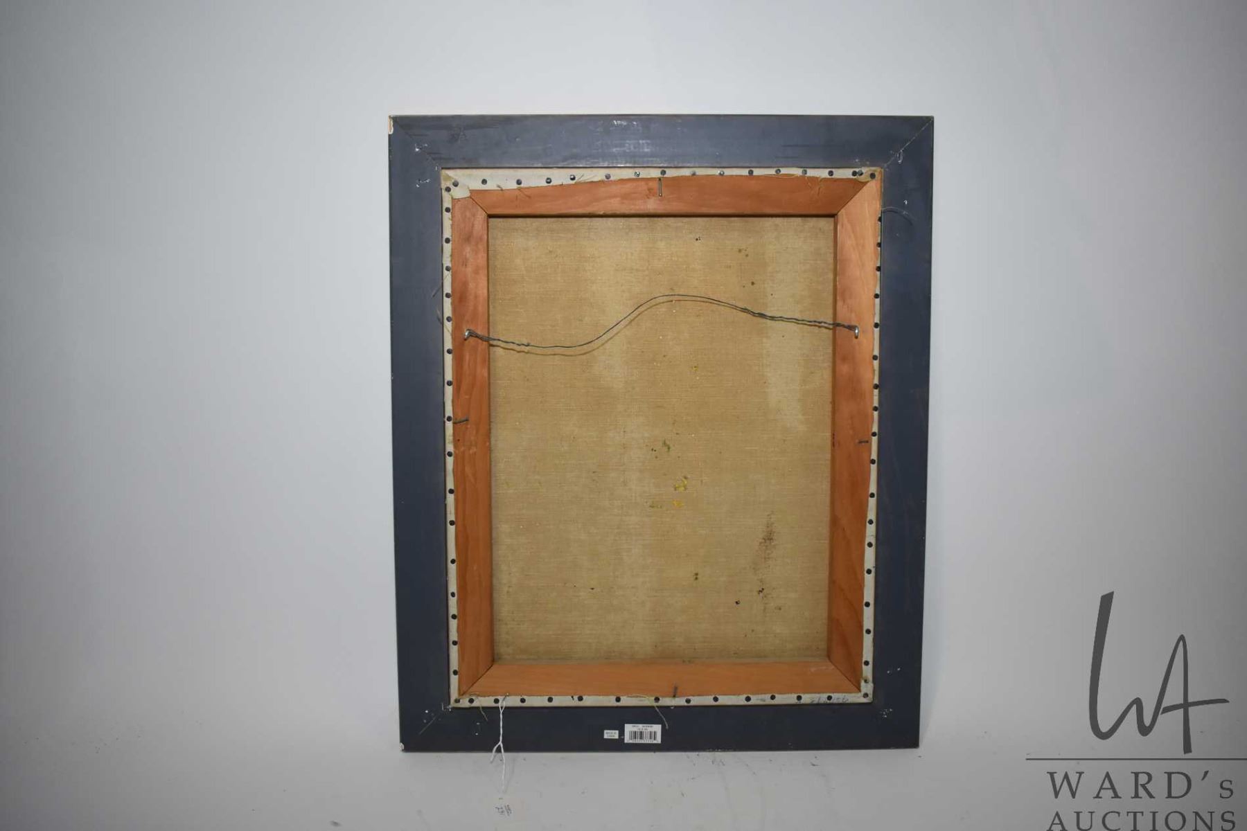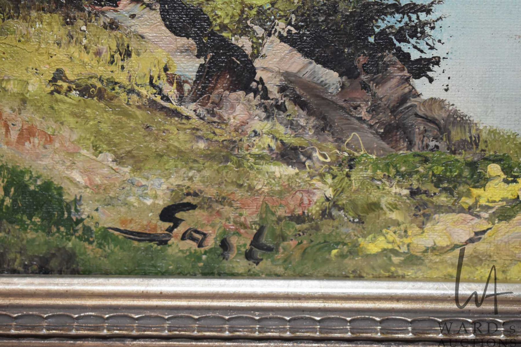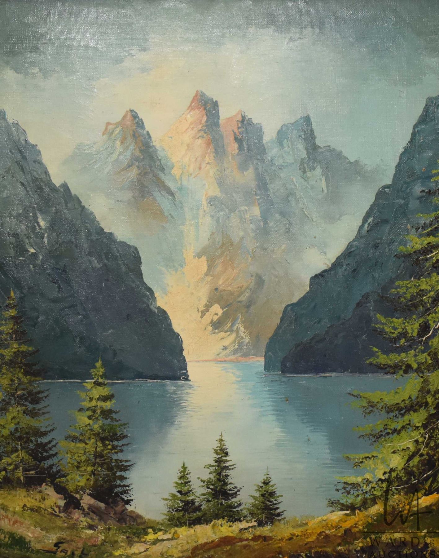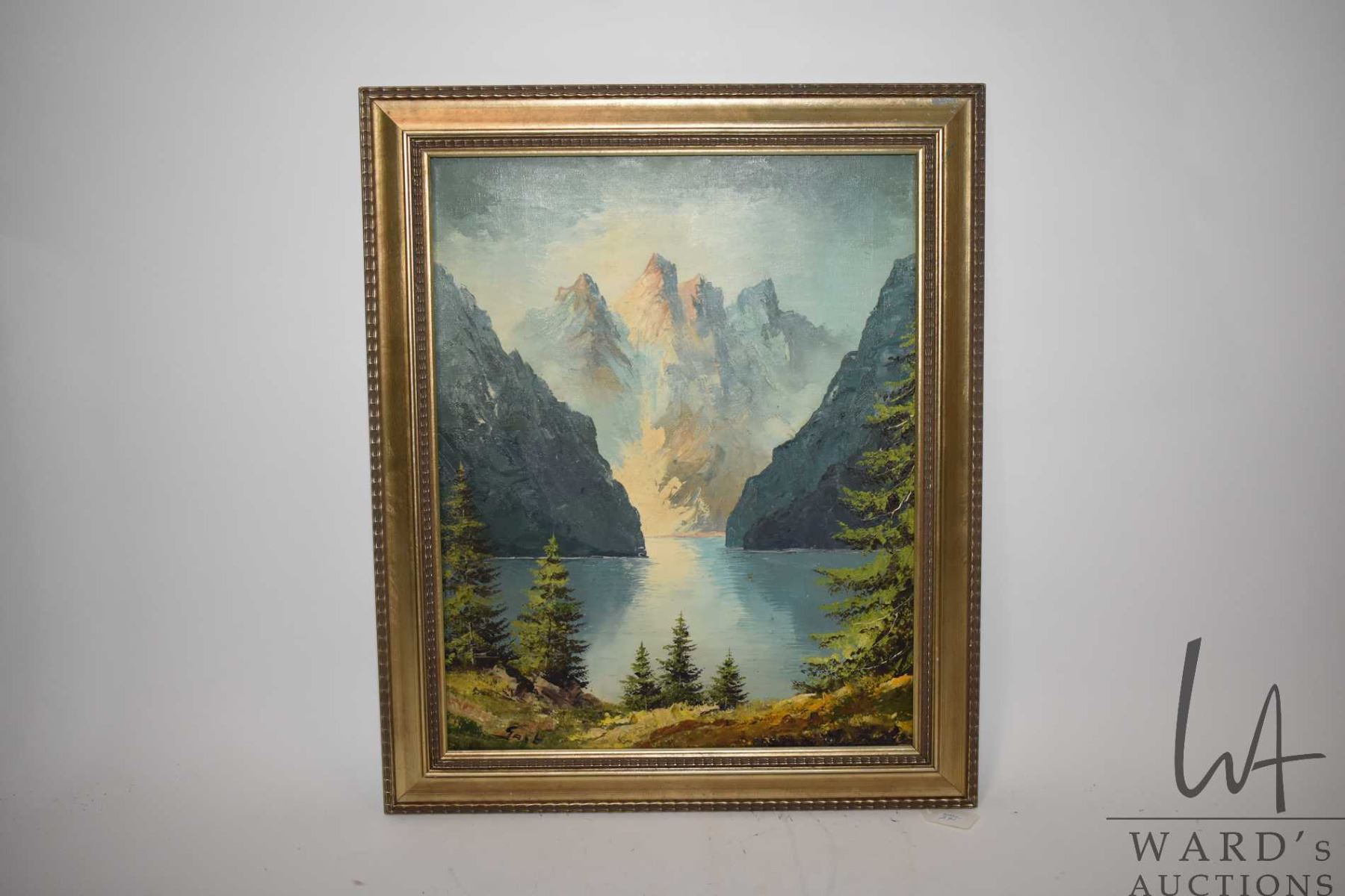 Gilt framed oil on canvas painting of a mountain lake scene, signed by artist Gast, 20" X 16". Note: Artwork shipments cannot be insured. Local pickup recommended