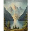 Gilt framed oil on canvas painting of a mountain lake scene, signed by artist Gast, 20" X 16". Note: