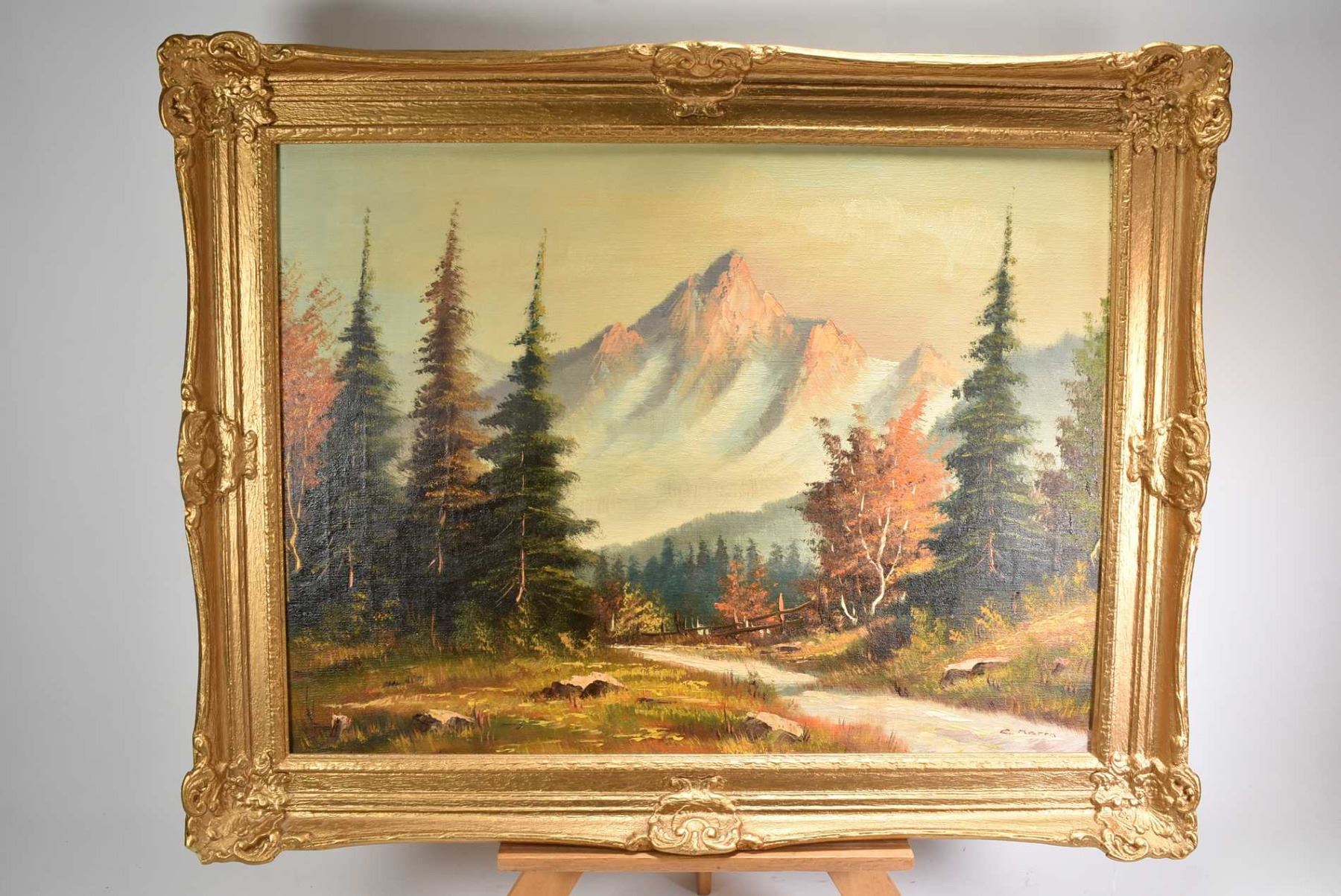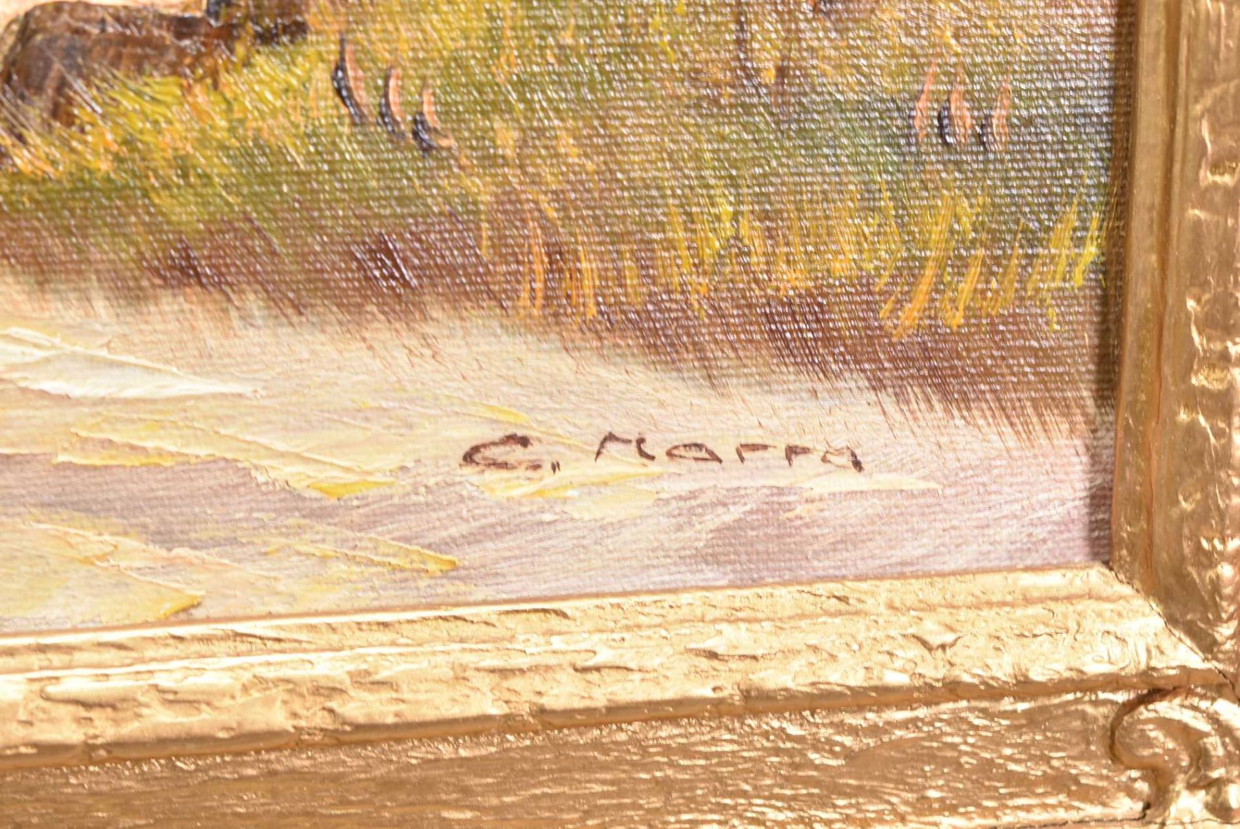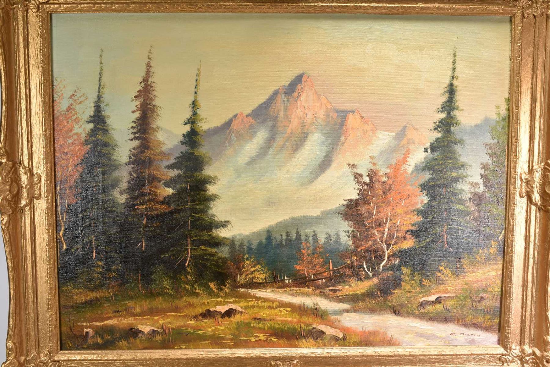 Gilt framed oil on canvas painting of a mountainscape by artist. C.Marra, 18 "X 24"