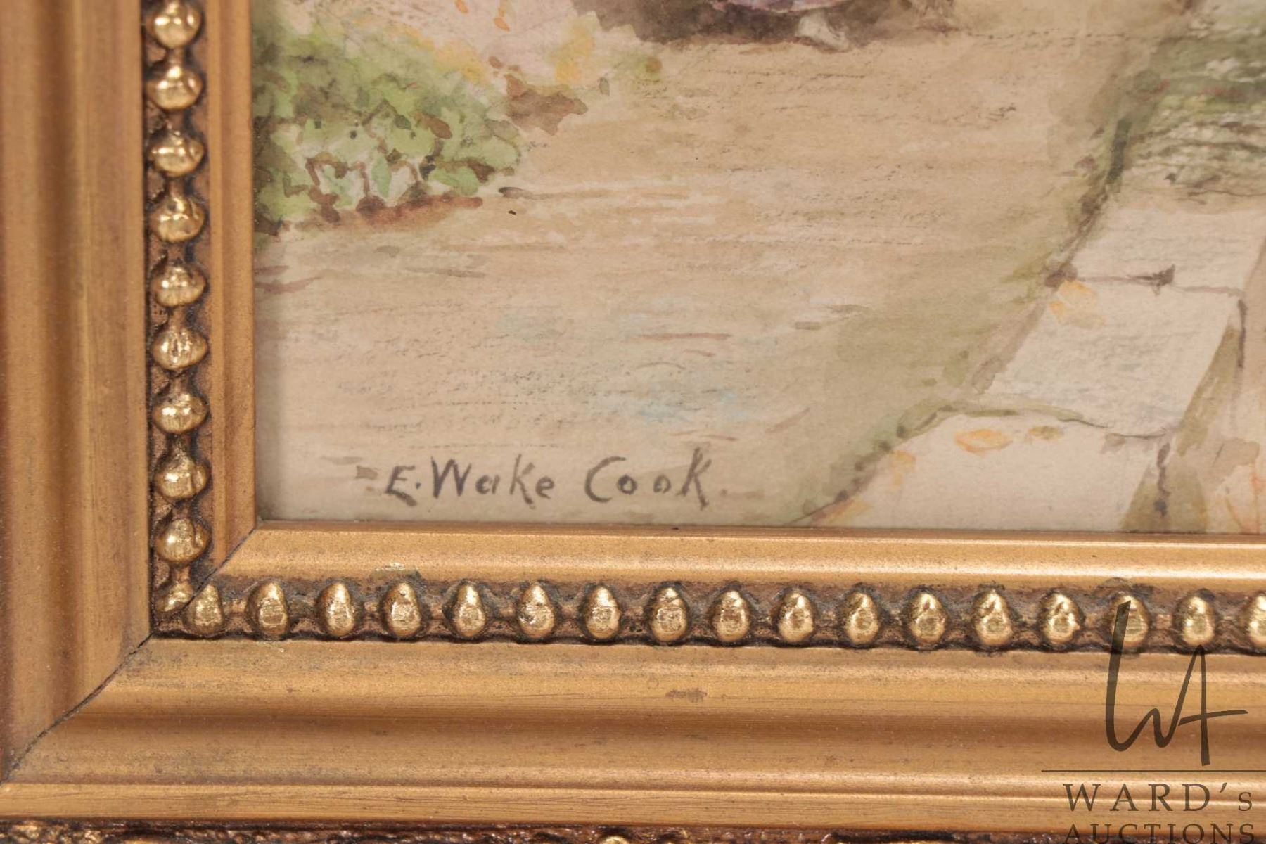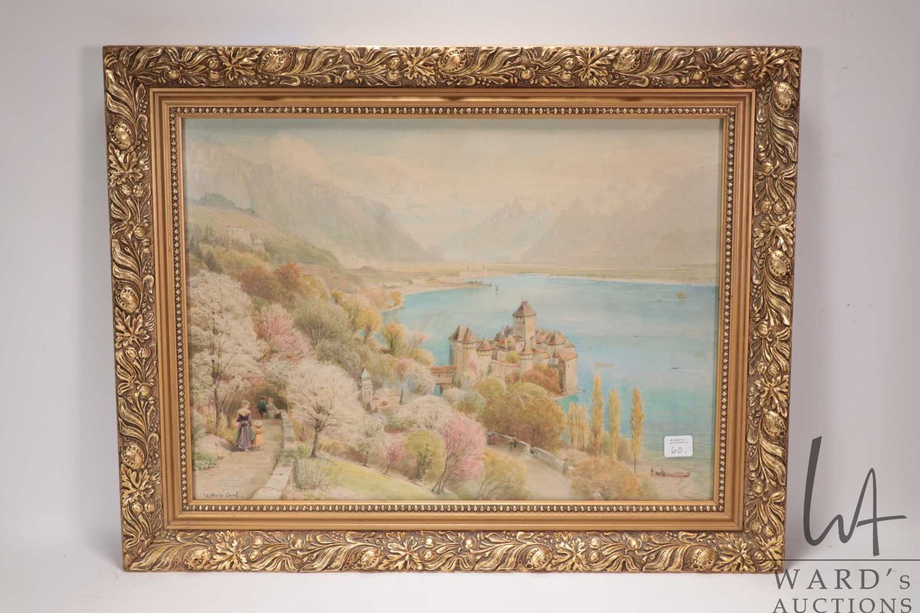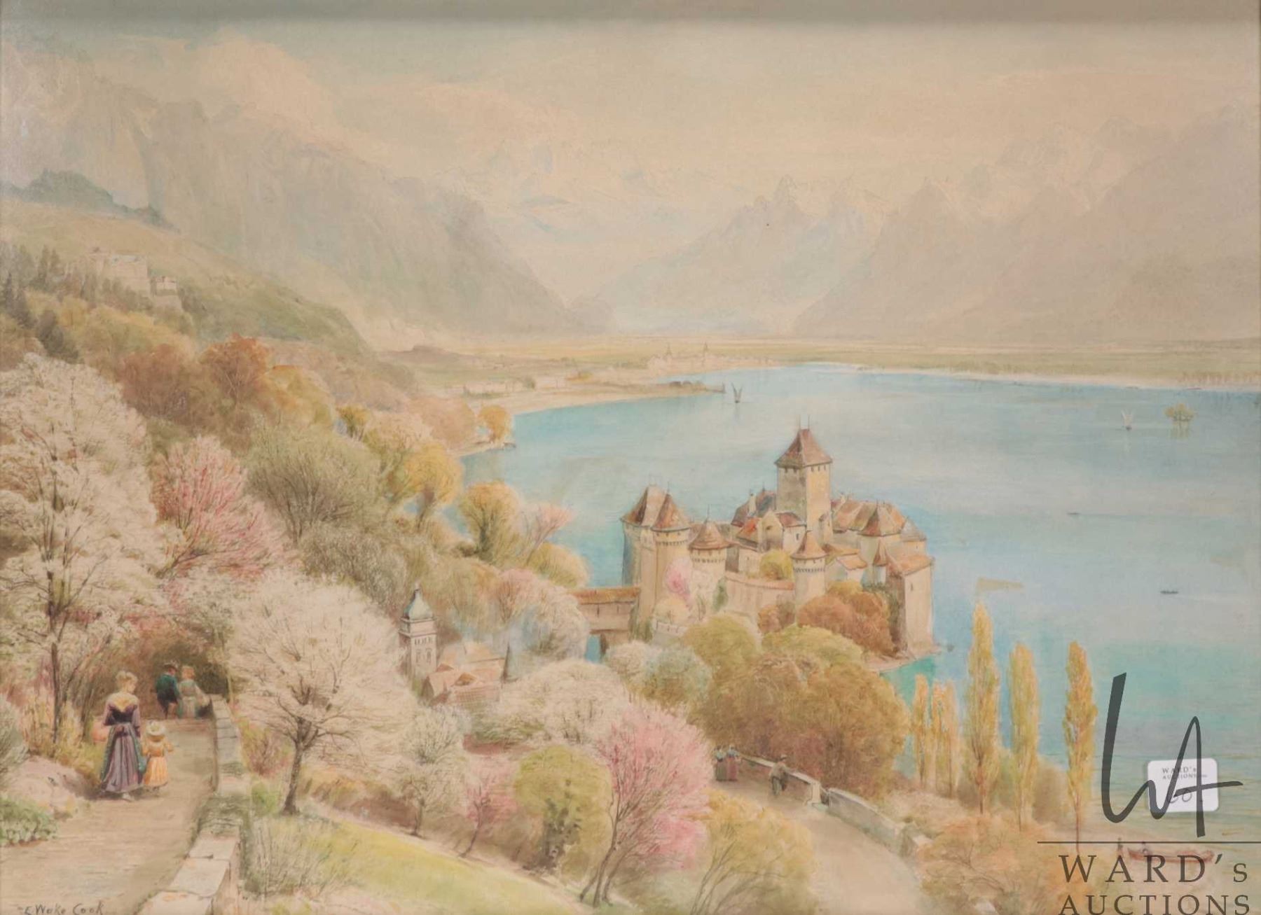 Gilt framed original watercolour painting of castle grounds with mountains and castle in background, hand signed by artist E.Wake Cook, 14" X 19". Note: Artwork cannot be insured and is often too large to ship. Local pickup.