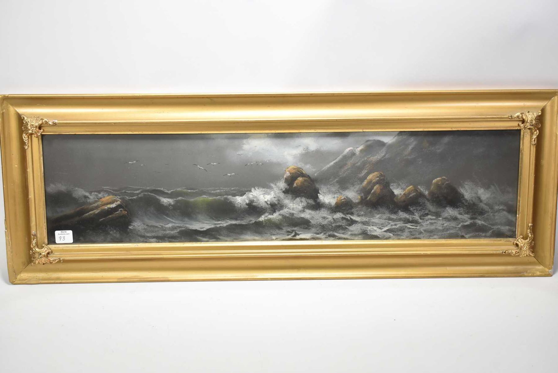 Gilt framed pastel on paper drawing of a stormy seascape, 7" X 28", no signature seen, possible Chandler (?)