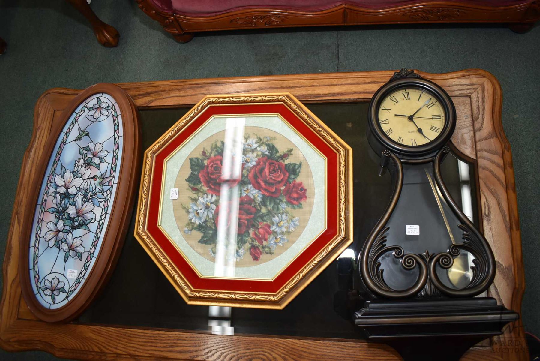 Gilt framed rose motif needlepoint 19 1/4" in diameter, a framed Lena Liu wall plaque plus a Quartz wall clock