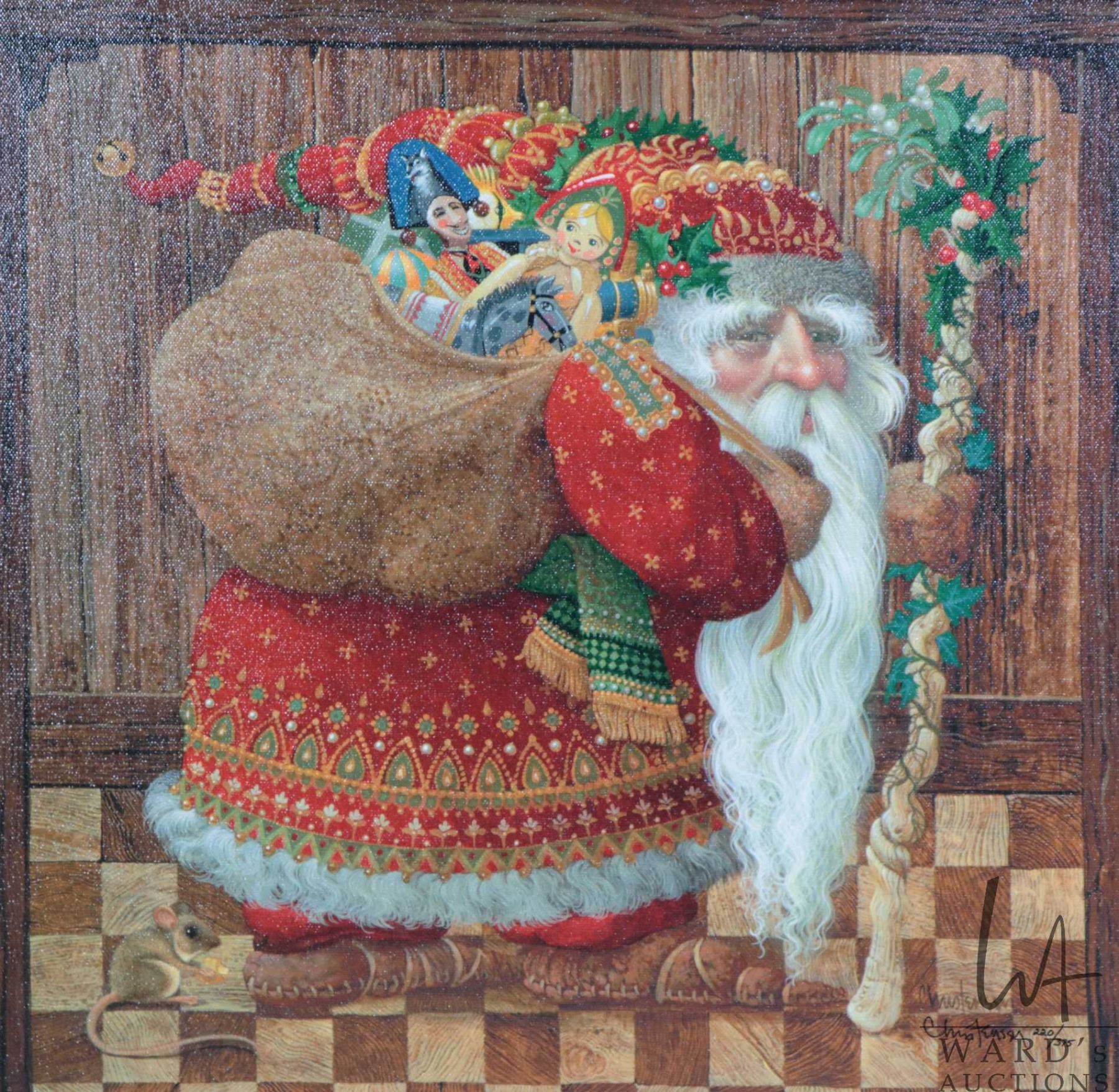 Gilt framed stretched giclee canvas limited edition print "Olde World Santa" pencil signed by artist James C. Christensen, 220/375, 17" X 17"