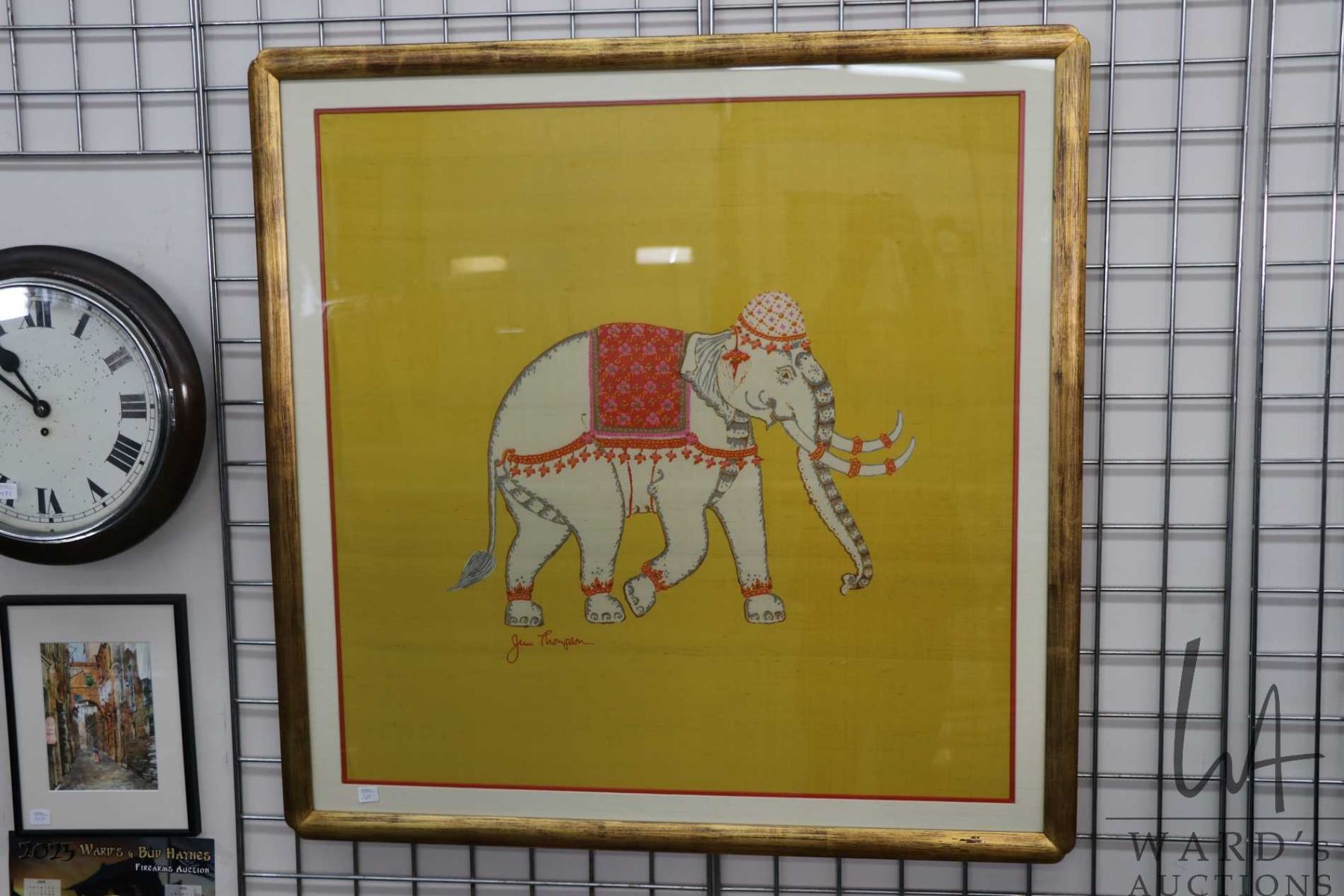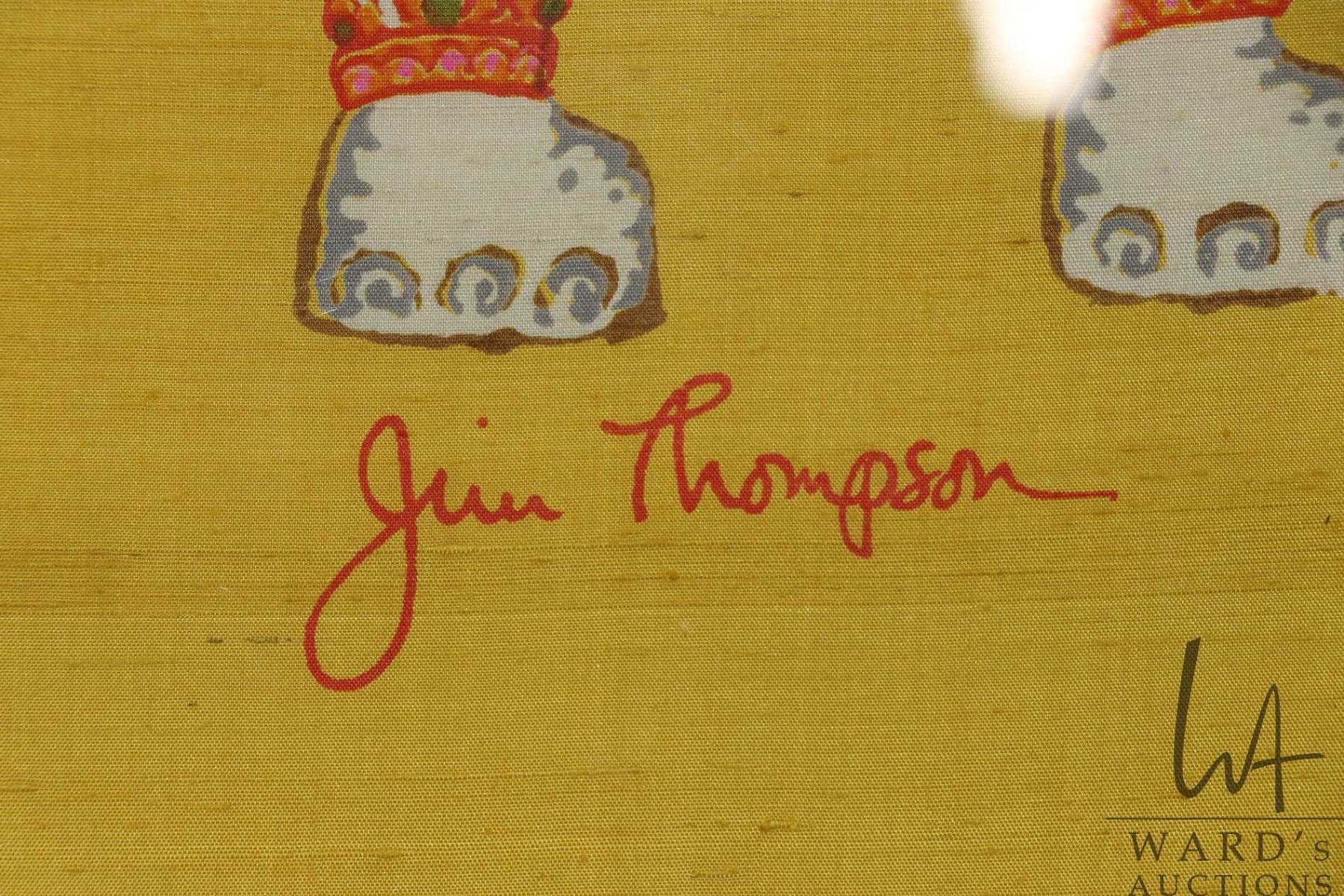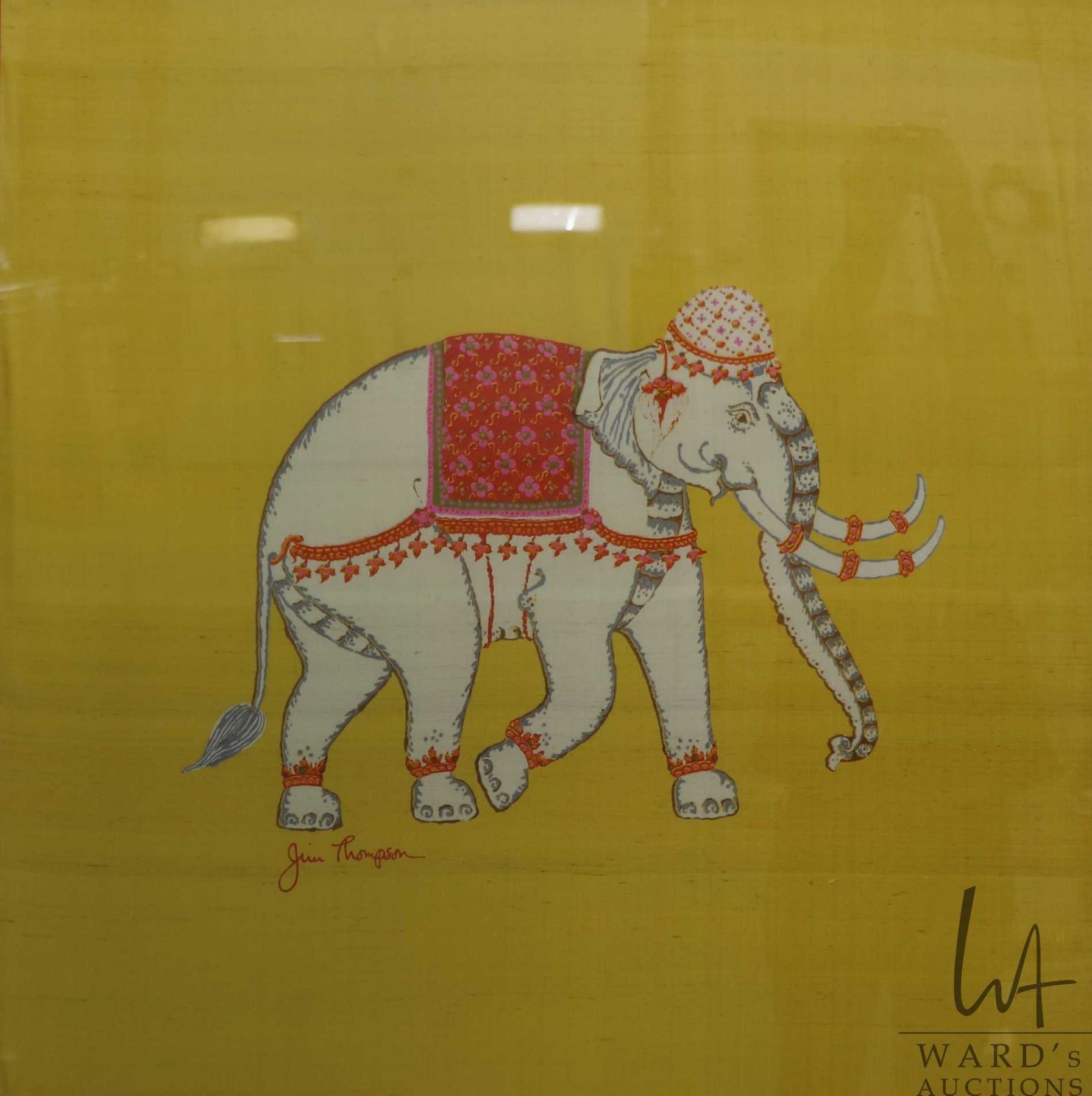 Gilt framed vintage Jim Thompson silk elephant scarf, overall dimensions including frame 38-1/2" x 38-1/2"