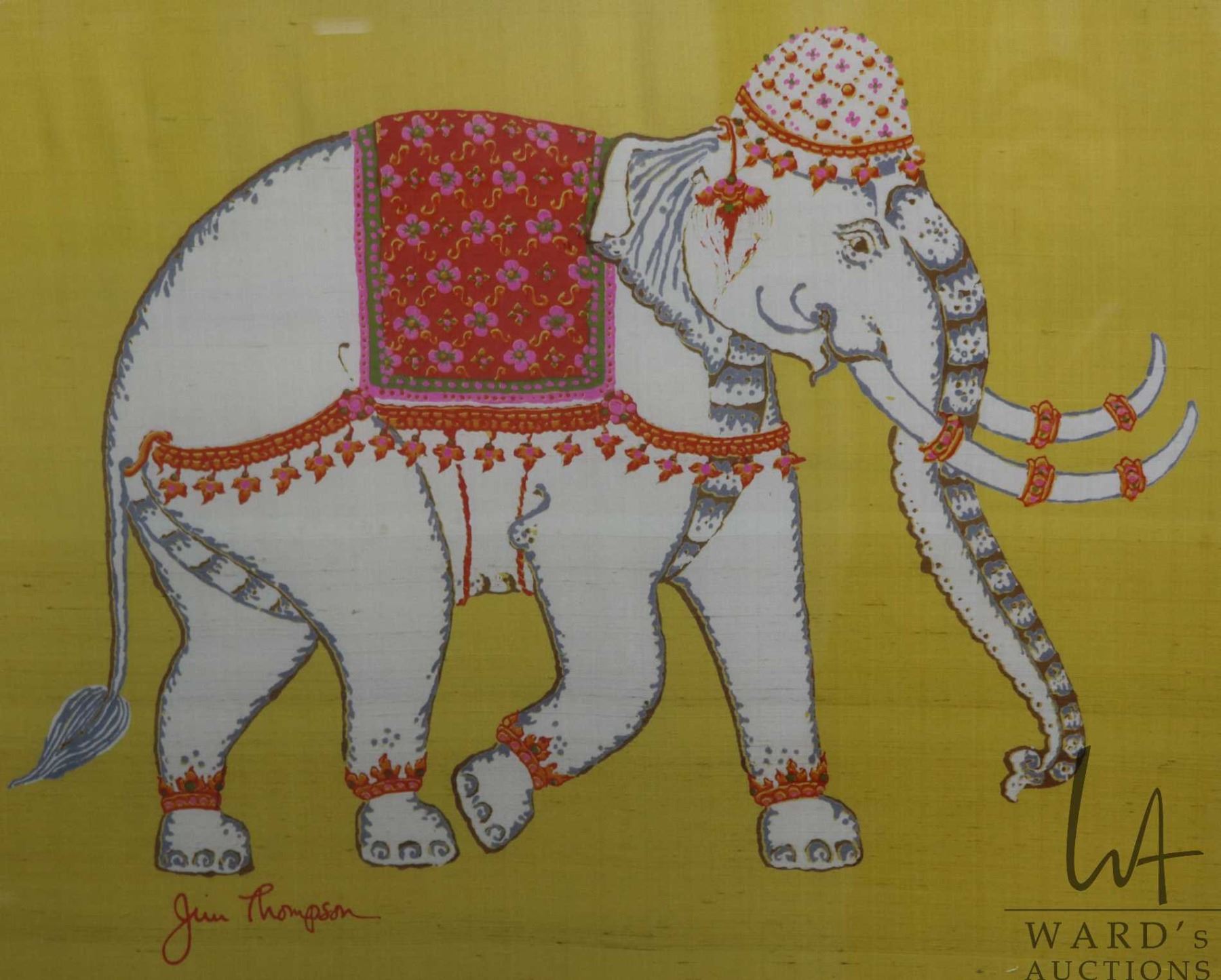 Gilt framed vintage Jim Thompson silk elephant scarf, overall dimensions including frame 38-1/2" x 3