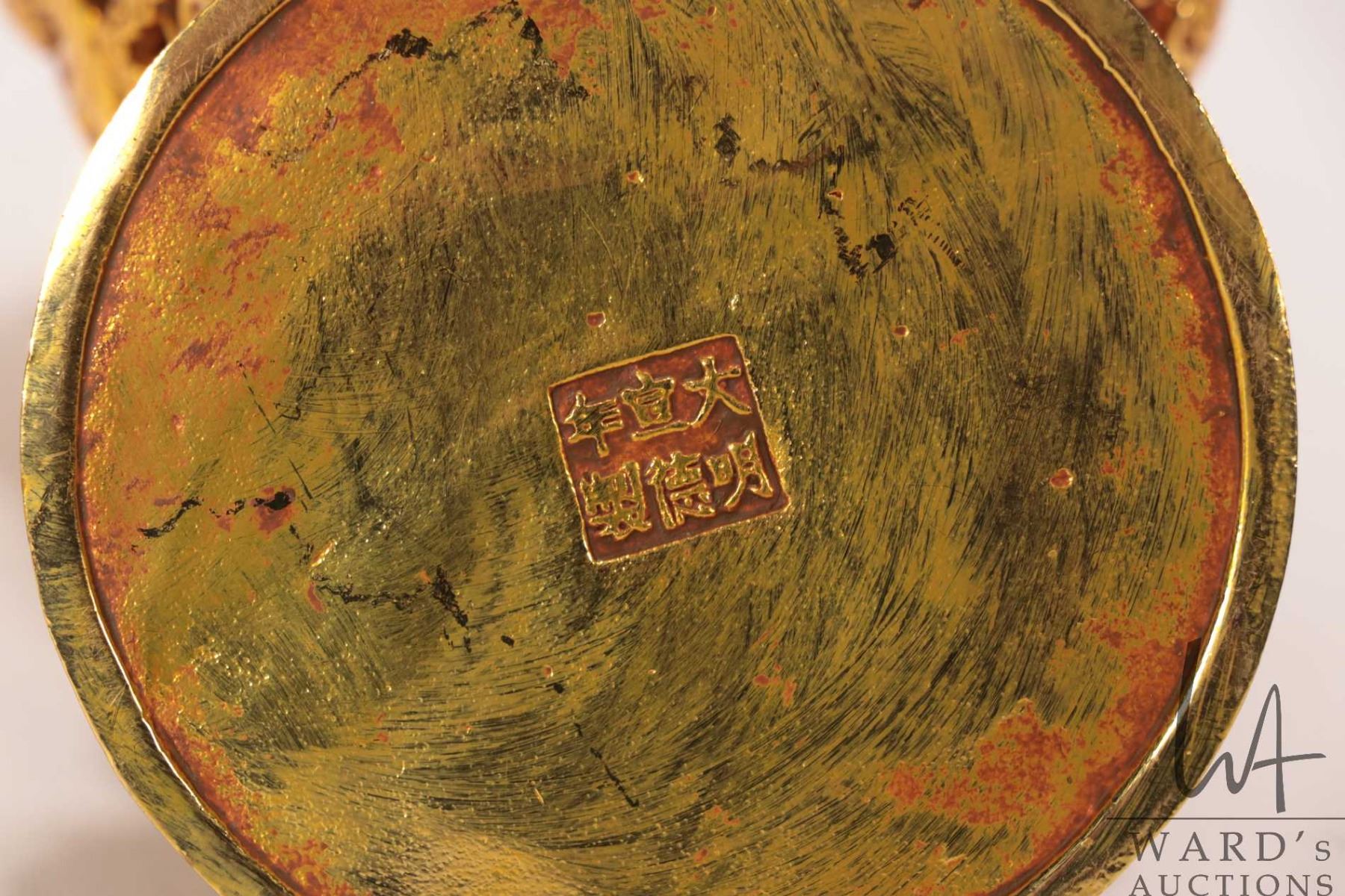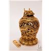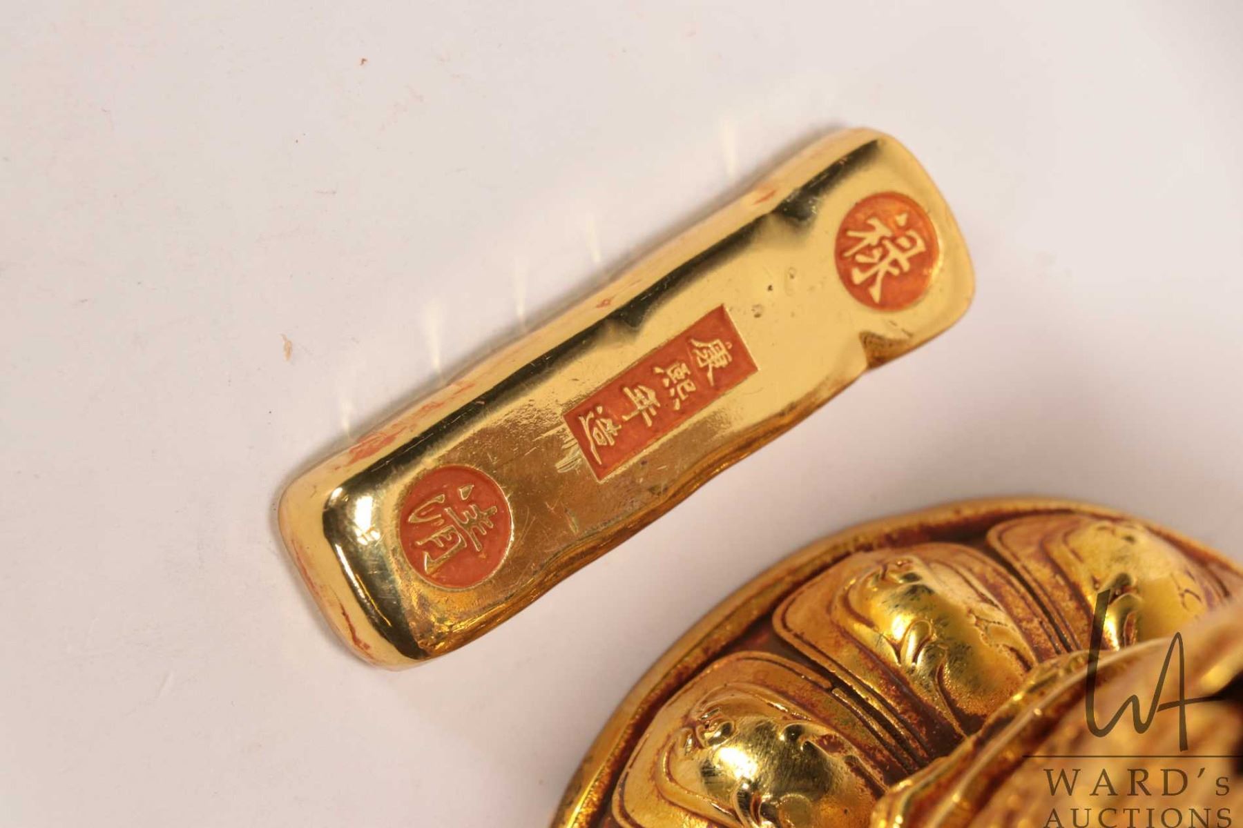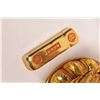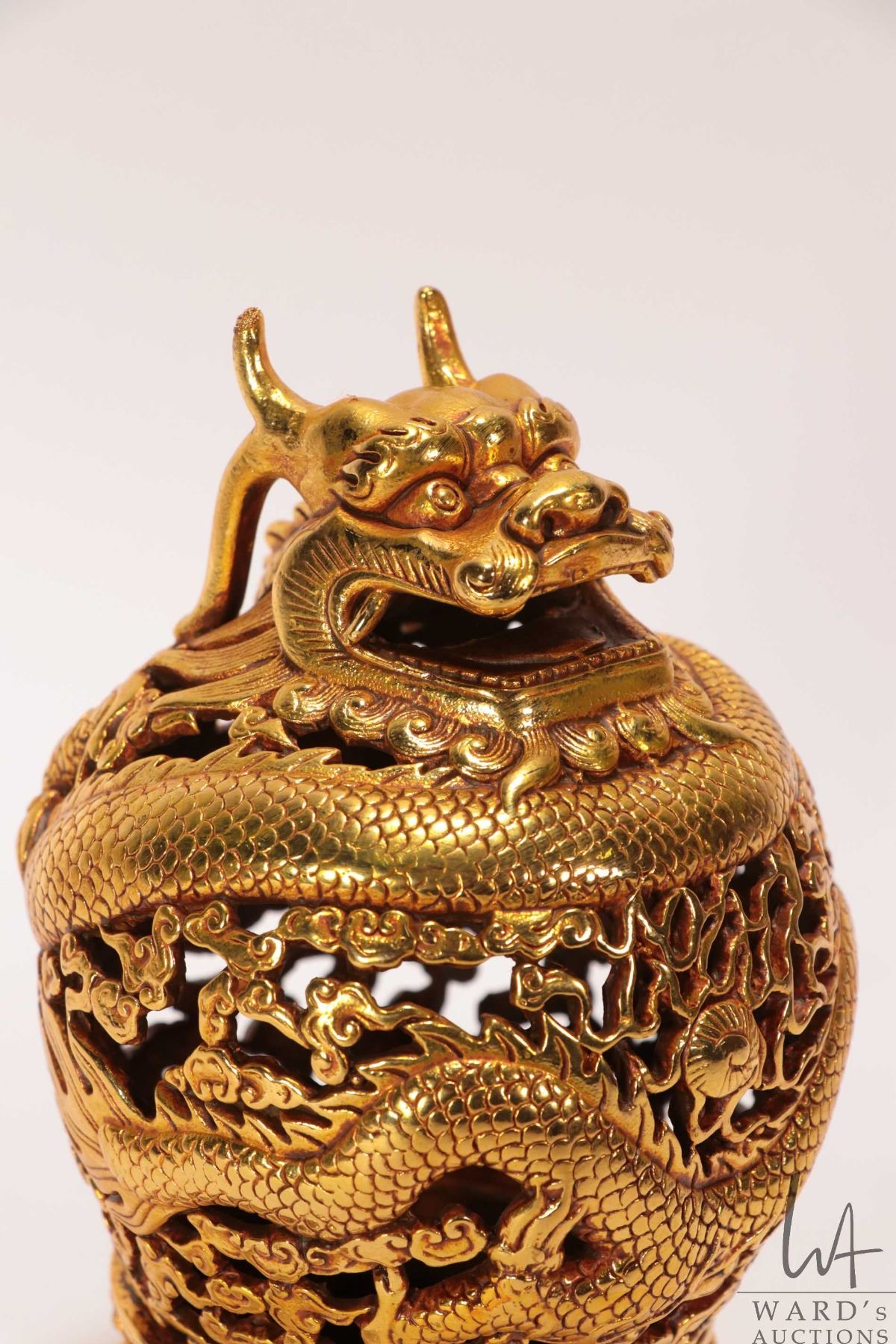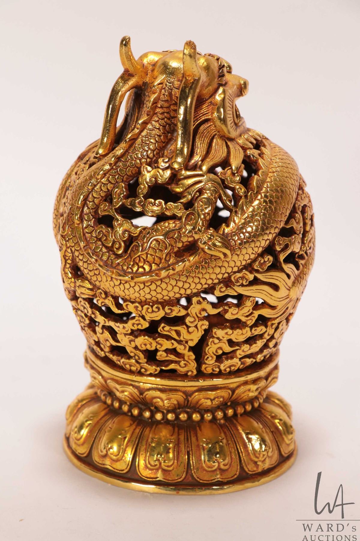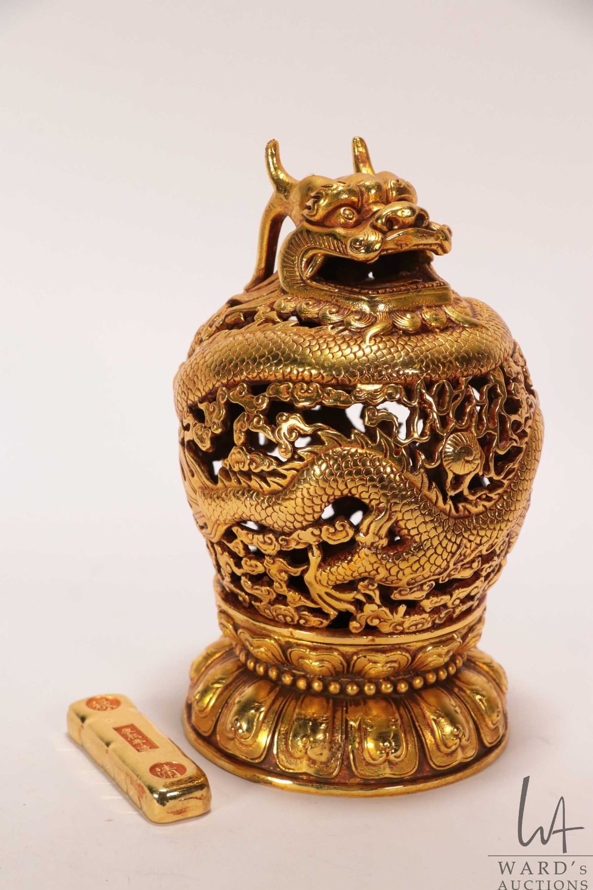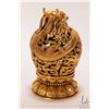Gilt open work dragon incense burner and a gilt calligraphy stamped paperweight