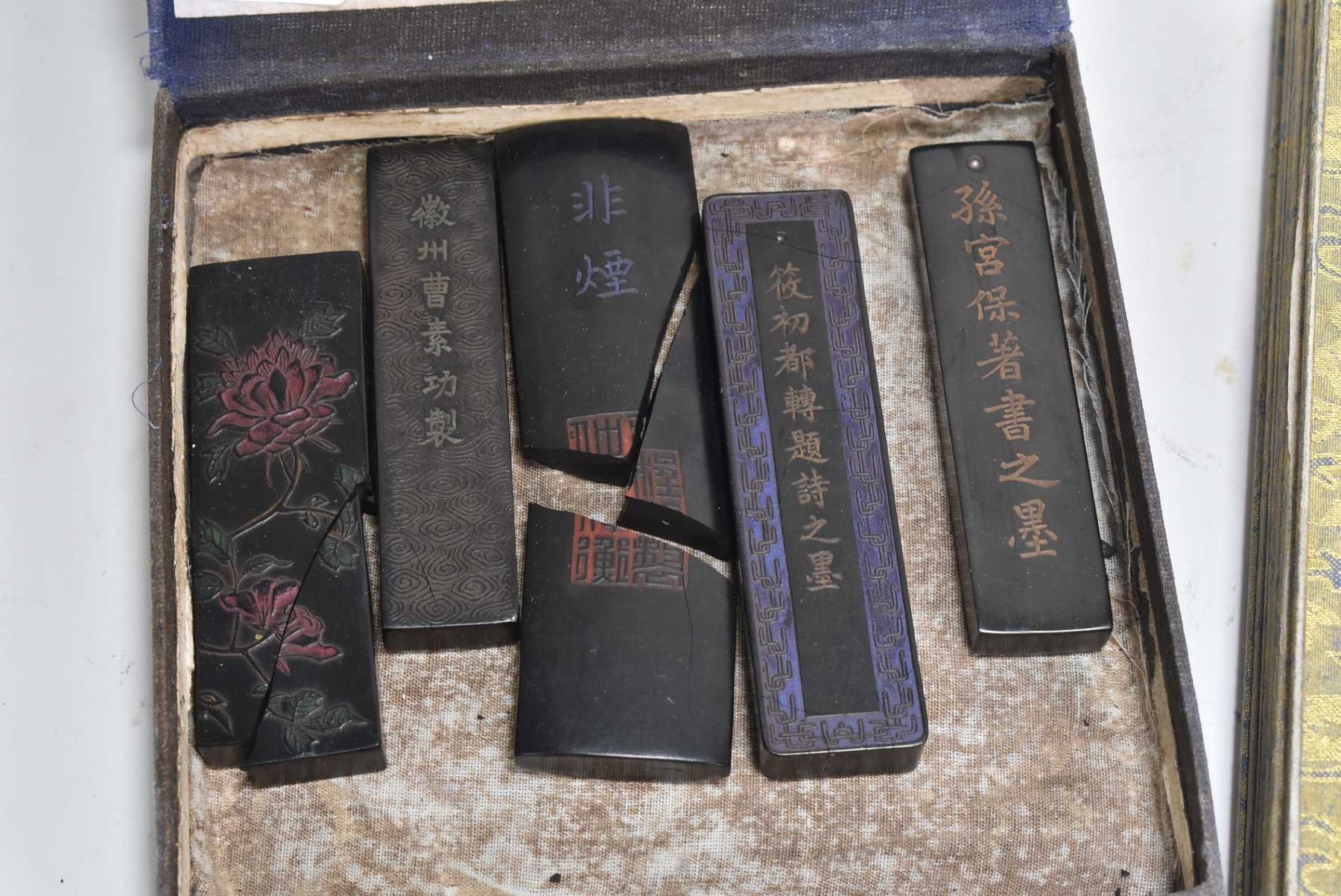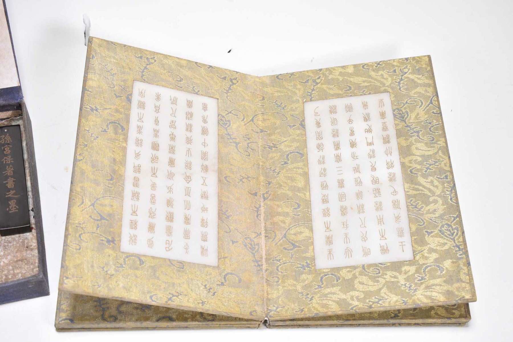 Gilt scripted jade stone book, purportedly early 20th century and a collection of Oriental smoked ink stones, note damage