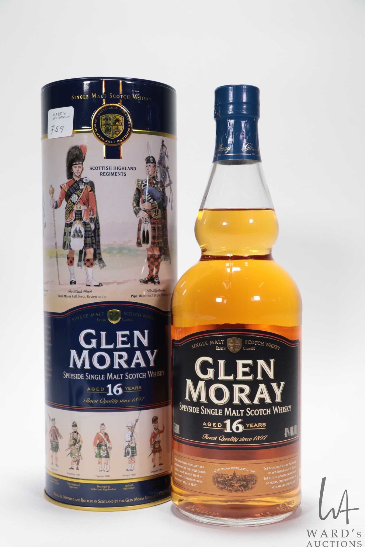 Glen Moray/ 16 Year Old/ Speyside Single Malt Scotch Whisky/ 750ml/ 40% ABV Metal Tube with Scottish Highland Regiments NOTE: Alcohol cannot be insured by any courier in Canada. Local pick up recommended. Canadian bidders only.
