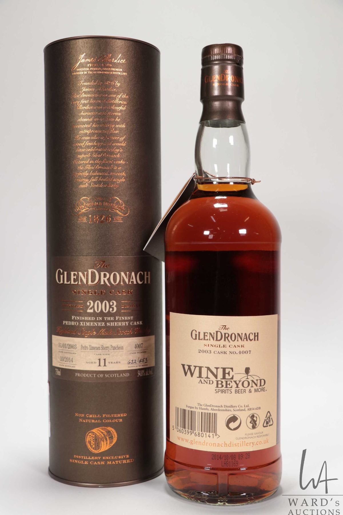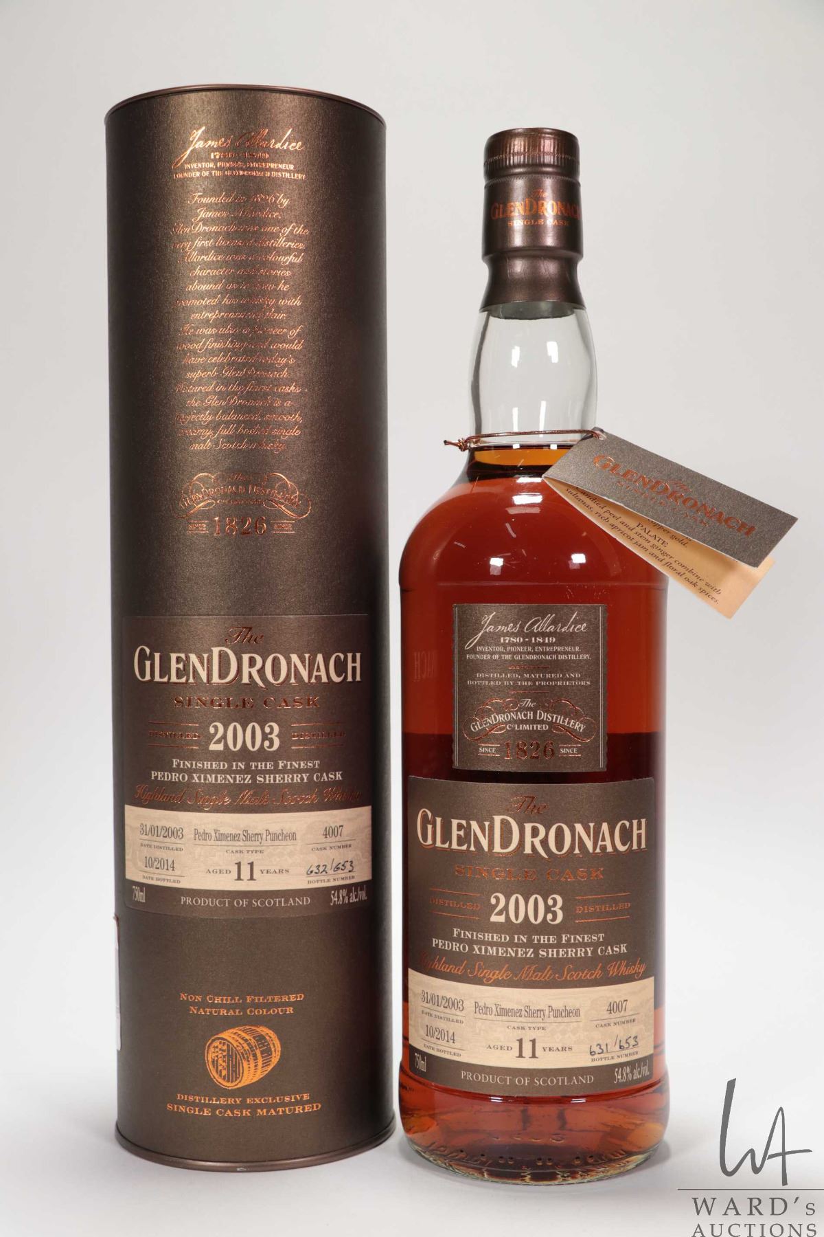 Glendronach/ 2003/ 11 Year Old/ Single Cask/ Highland Single Malt Scotch Whisky/ Btld 2014/ PX Sherry Cask 4007/ LE 632 of 653/ 750ml/ 54.8% ABV NOTE: Alcohol cannot be insured by any courier in Canada. Local pick up recommended. Canadian bidders only.