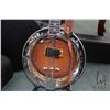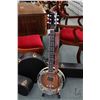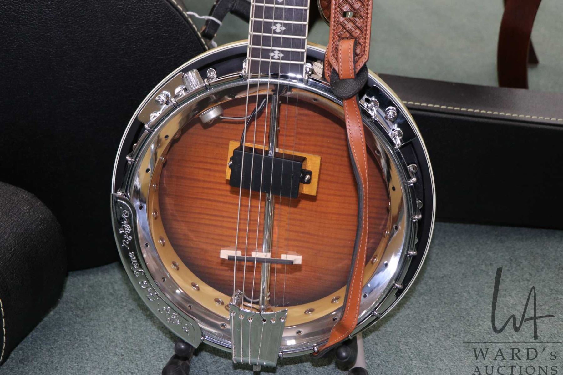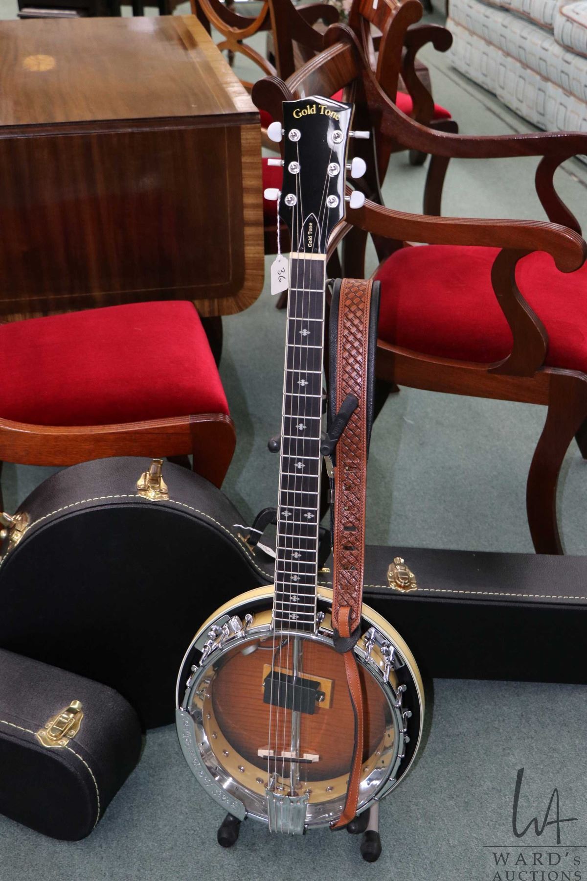 Gold Tone-GT 750 Deluxe electric six string banjitar with Canadian maple body and neck, rosewood finger board and celluloid body binding, 2- way adjustable reasonator and includes tooled "belt motif" Levy's leather strap with gemstone like buckle and fitted hard case. All appear virtually unused