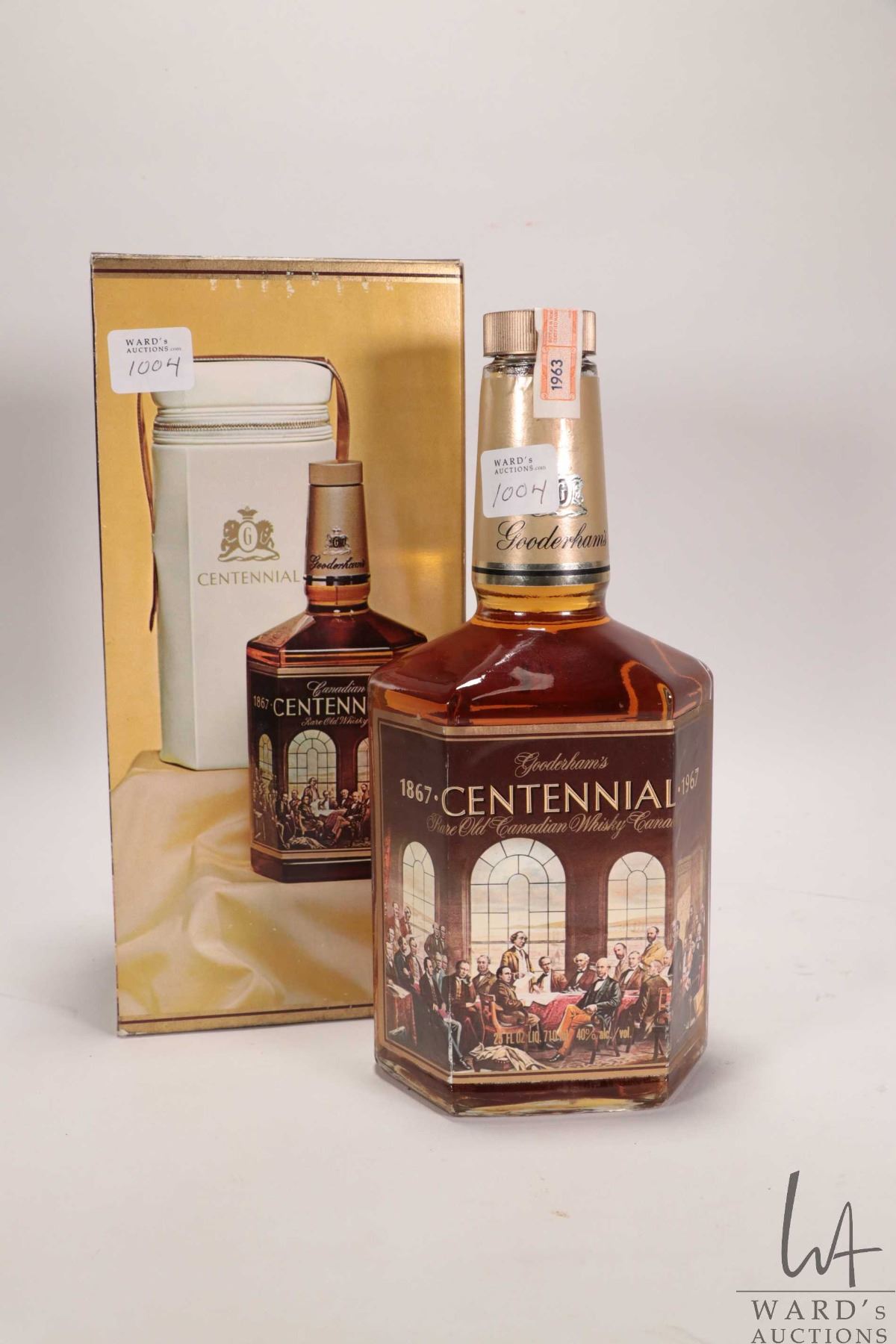 Gooderham's 1867-1967 Centennial/ Rare Old Canadian Whisky/ 25 oz. / 710ml/ 40% ABV/ Intact Excise label dated 1963/ includes zip up carry bag and original box Note: Alcohol cannot be insured by any courier in Canada. Local pick up is recommended. Canadian bidders only.