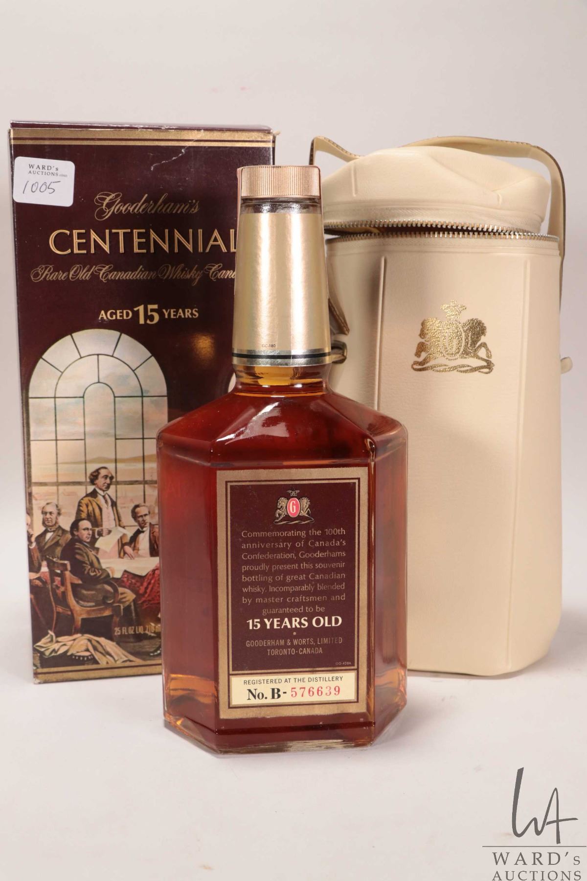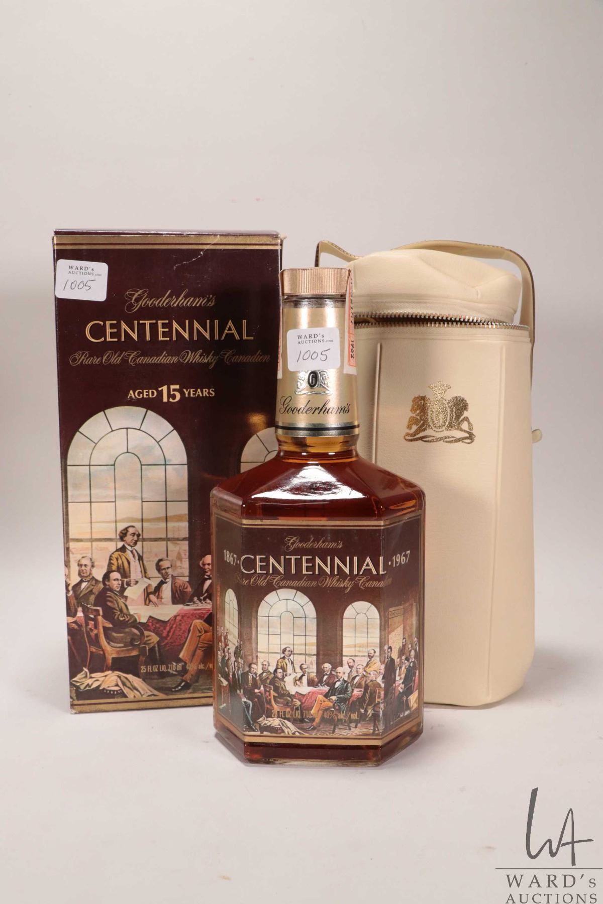 Gooderham's 1867-1967 Centennial/ Rare Old Canadian Whisky/ 25 oz. / 710ml/ 40% ABV/ Intact Excise label dated 1963/ includes zip up carry bag and original box Note: Alcohol cannot be insured by any courier in Canada. Local pick up is recommended. Canadian bidders only.