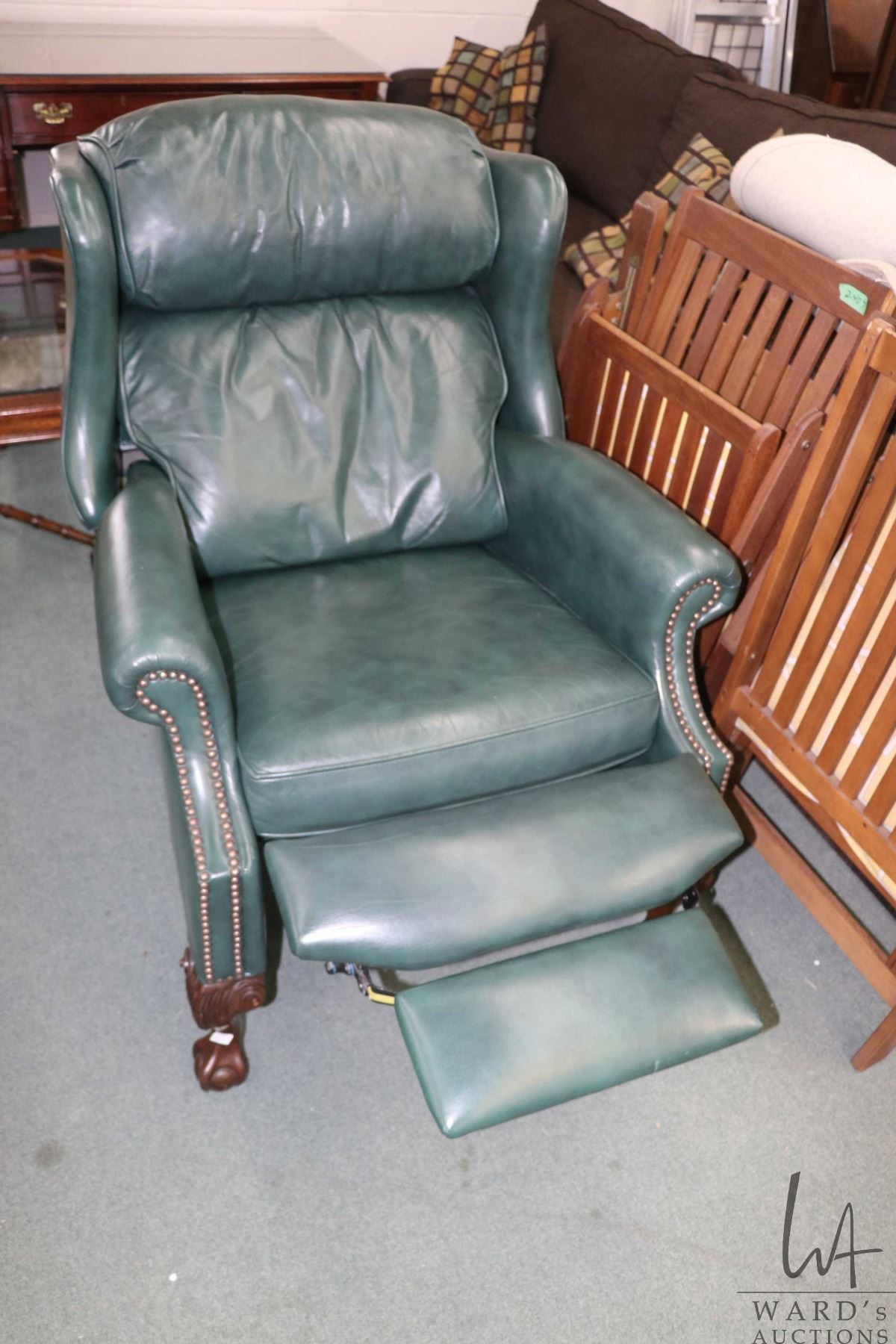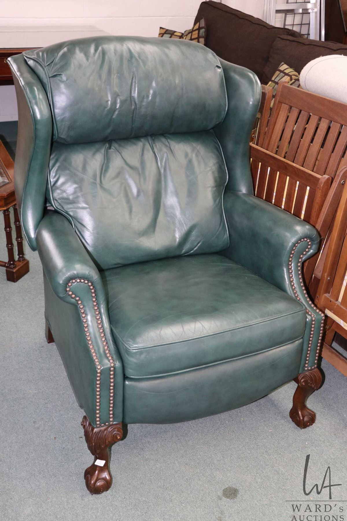 Green leather upholstered Chippendale style wing back recliner with nail head decoration and carved ball and claw feet, made by Hancock & Moore