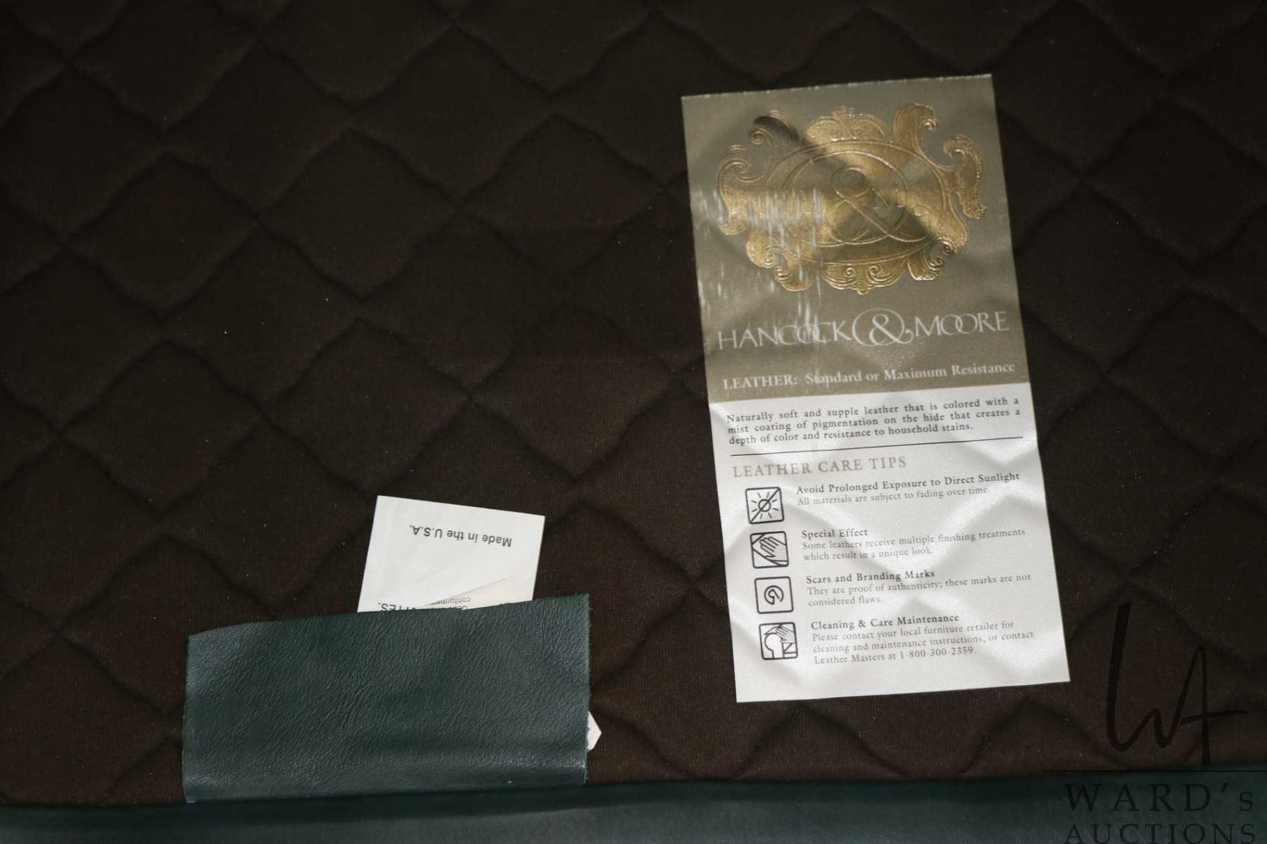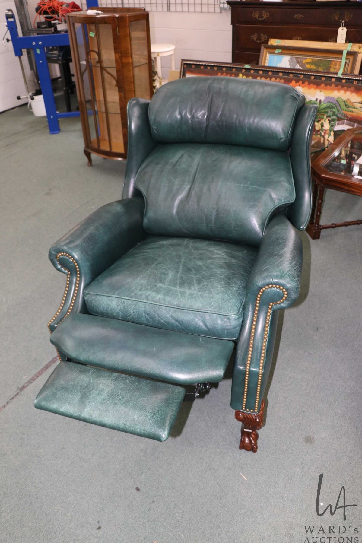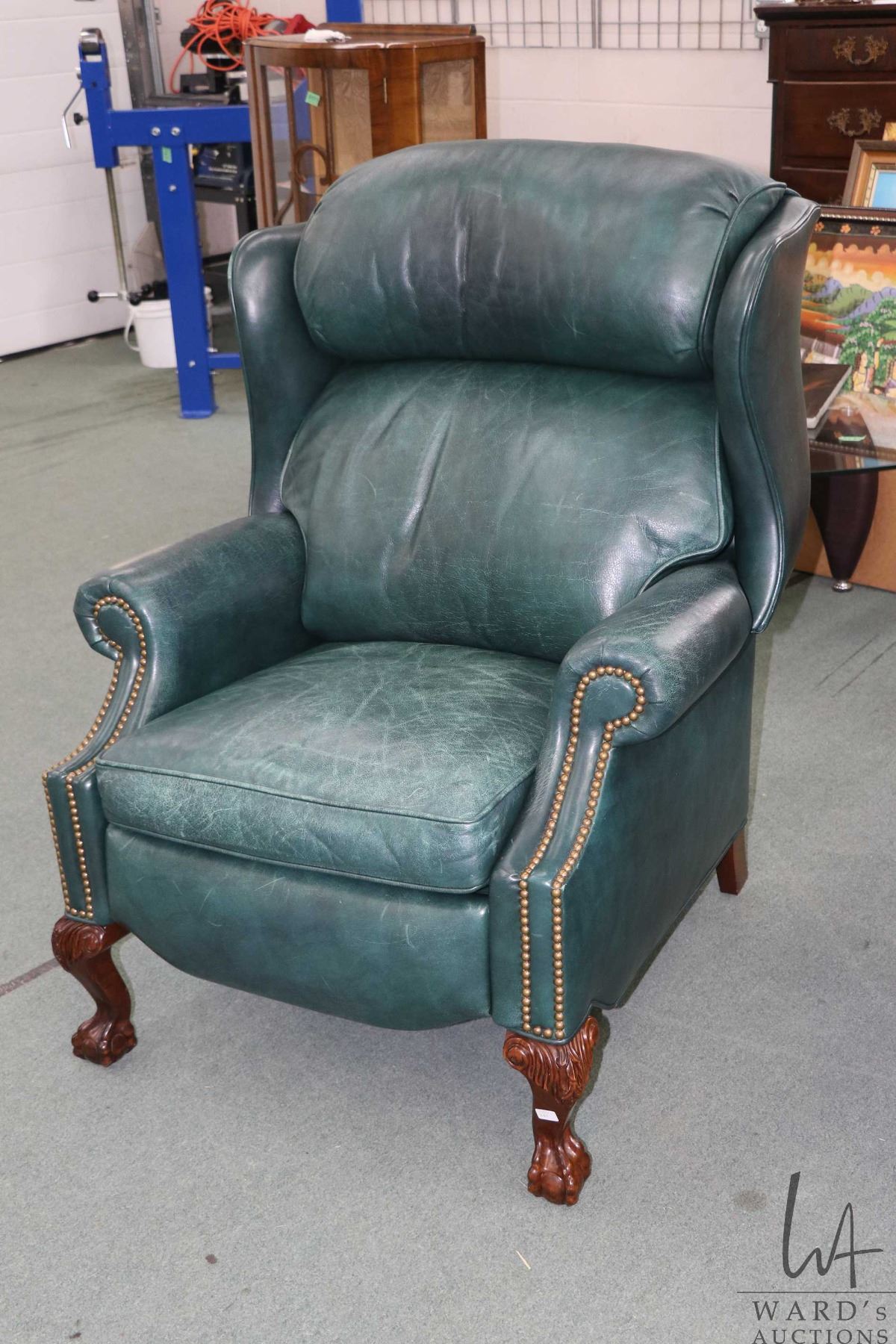 Green leather upholstered Chippendale style wingback recliner with nail head decoration and carved ball and claw feet. Made by Hancock & Moore