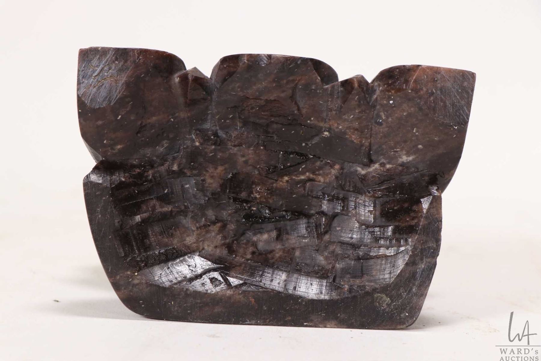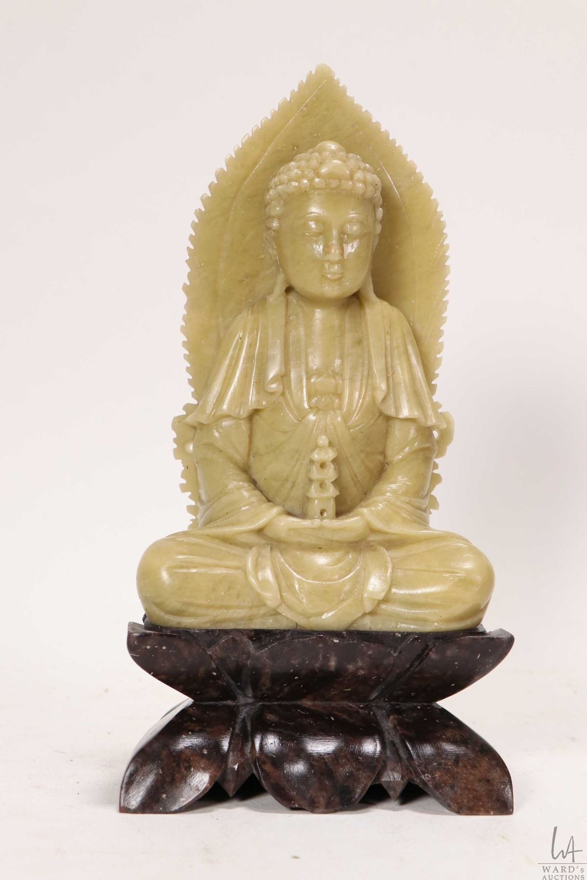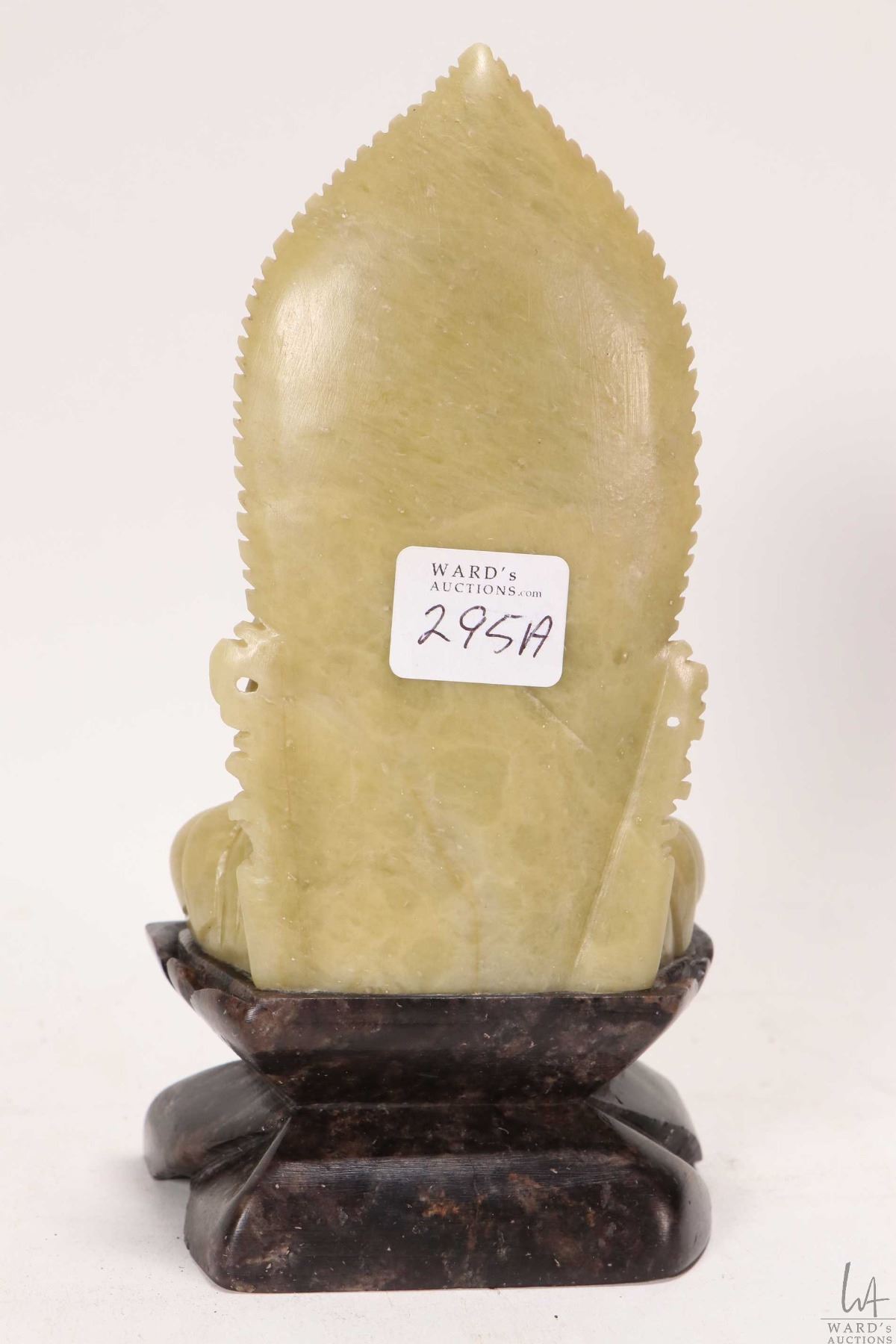 Green soapstone carved Buddha on a dark stone base, 7 3/4" in height