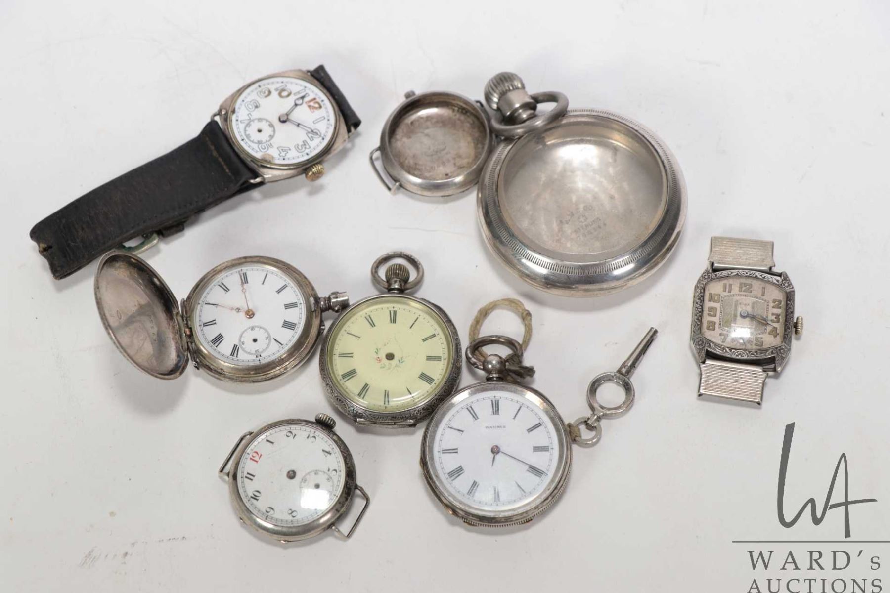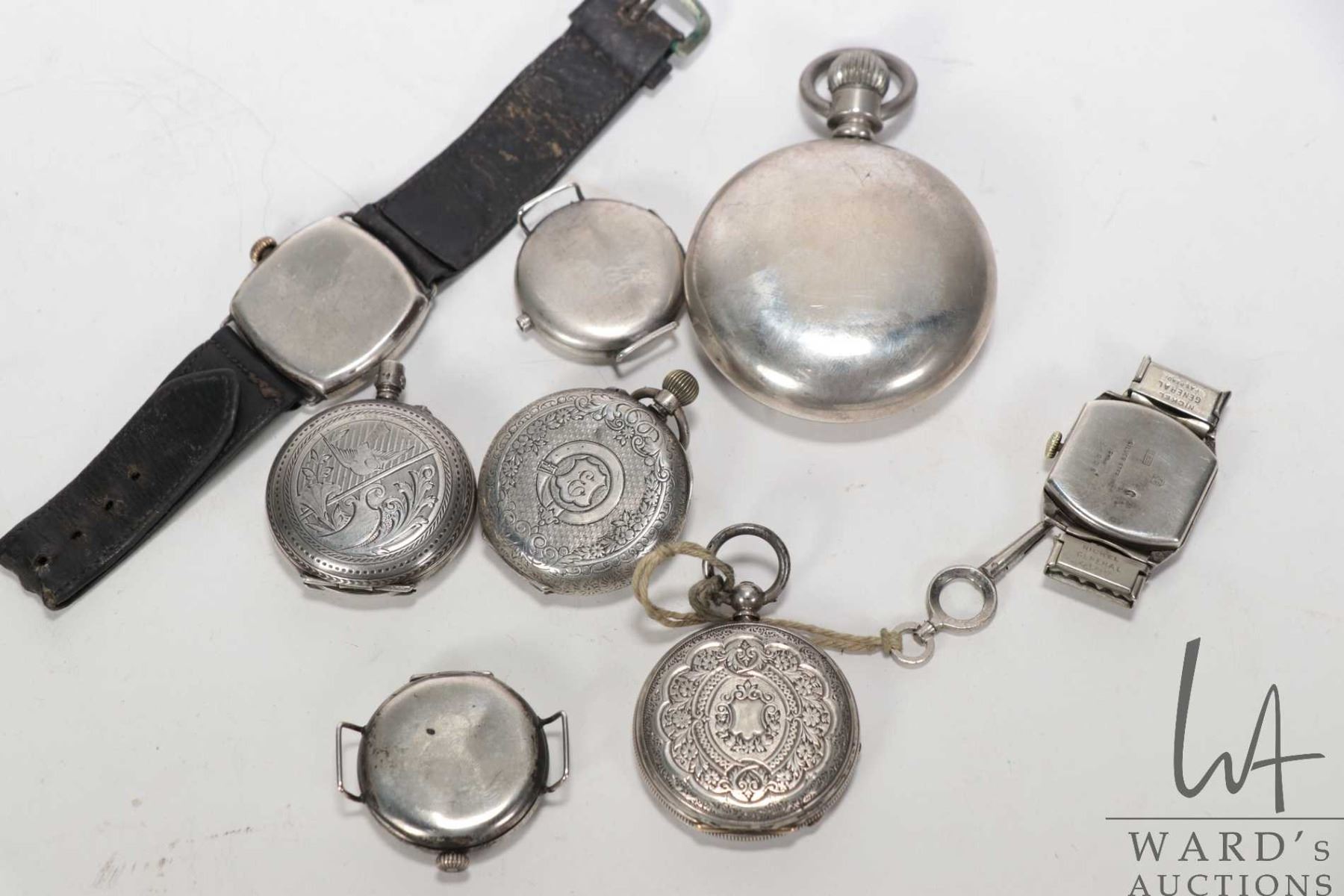 Group of sterling watch cases. 4 wrist watch cases, 3 of which have movements. 4 pocket watch cases, 3 of which have movements, movements are incomplete or non functioning except for the ERAX 15 jewel wrist watch which is working at time of catalogueing.