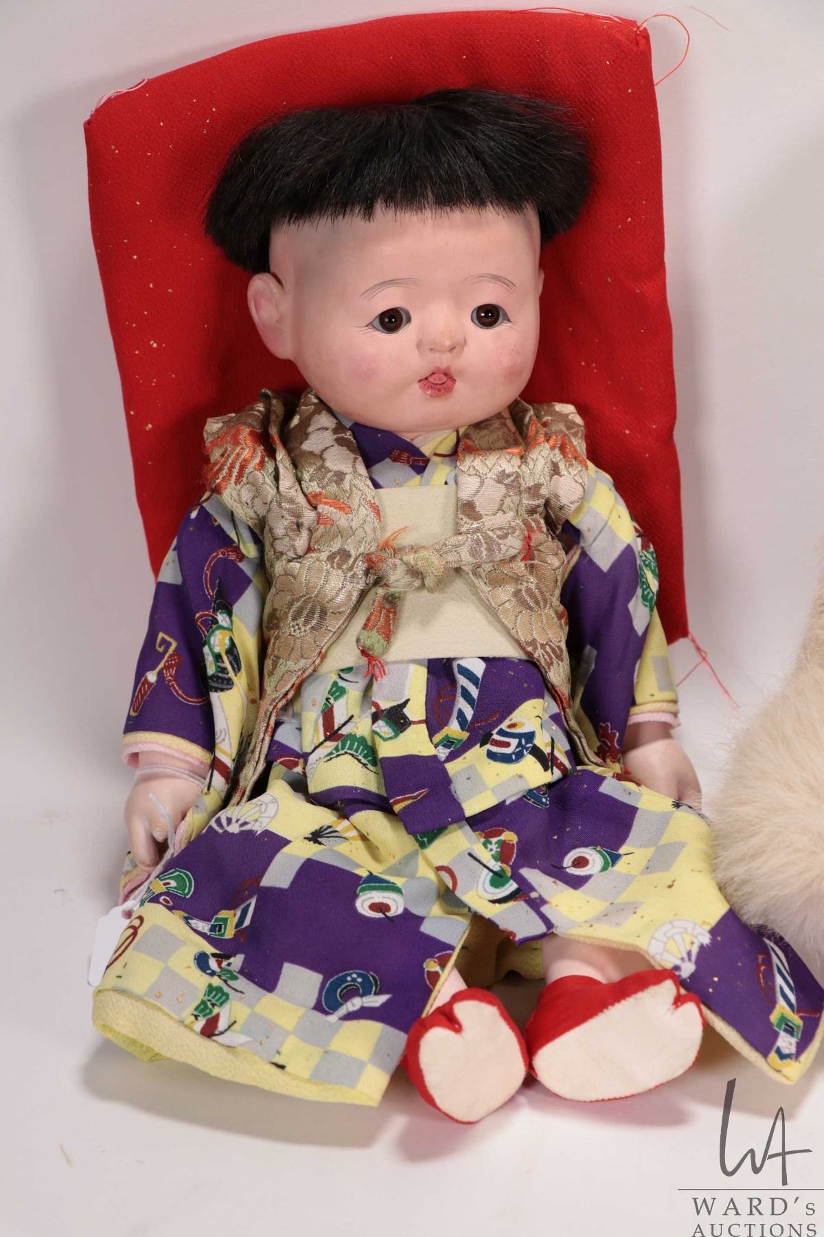 Gund limited edition "Collector's Classic" jointed teddy bear, 23" and a vintage Japanese baby doll with non-working mama box, 14" in length