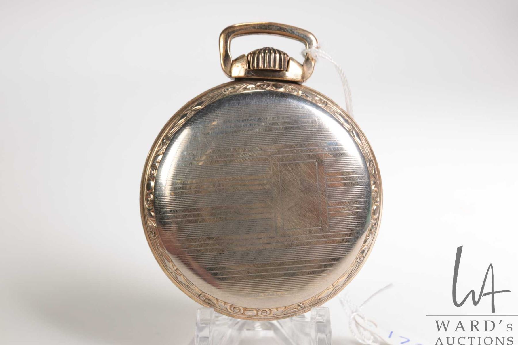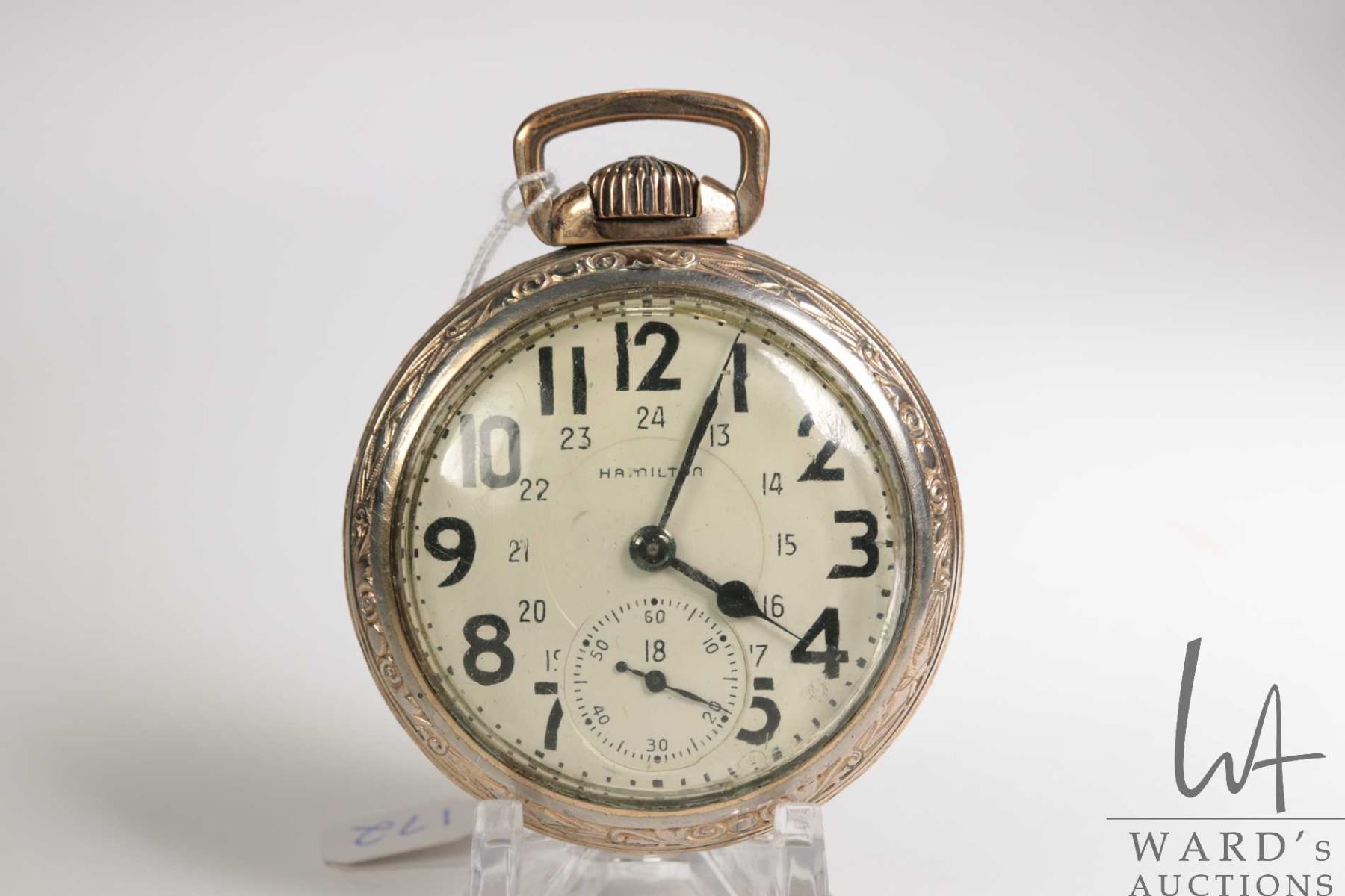 Hamilton, grade 992B, 21 jewel pocket watch, with double sunk dial and second sweep, Arabic numerals. gold plated, engraved case marked Derby Rolled plate sturdy, case made in Canada, size 16, working at time of cataloguing