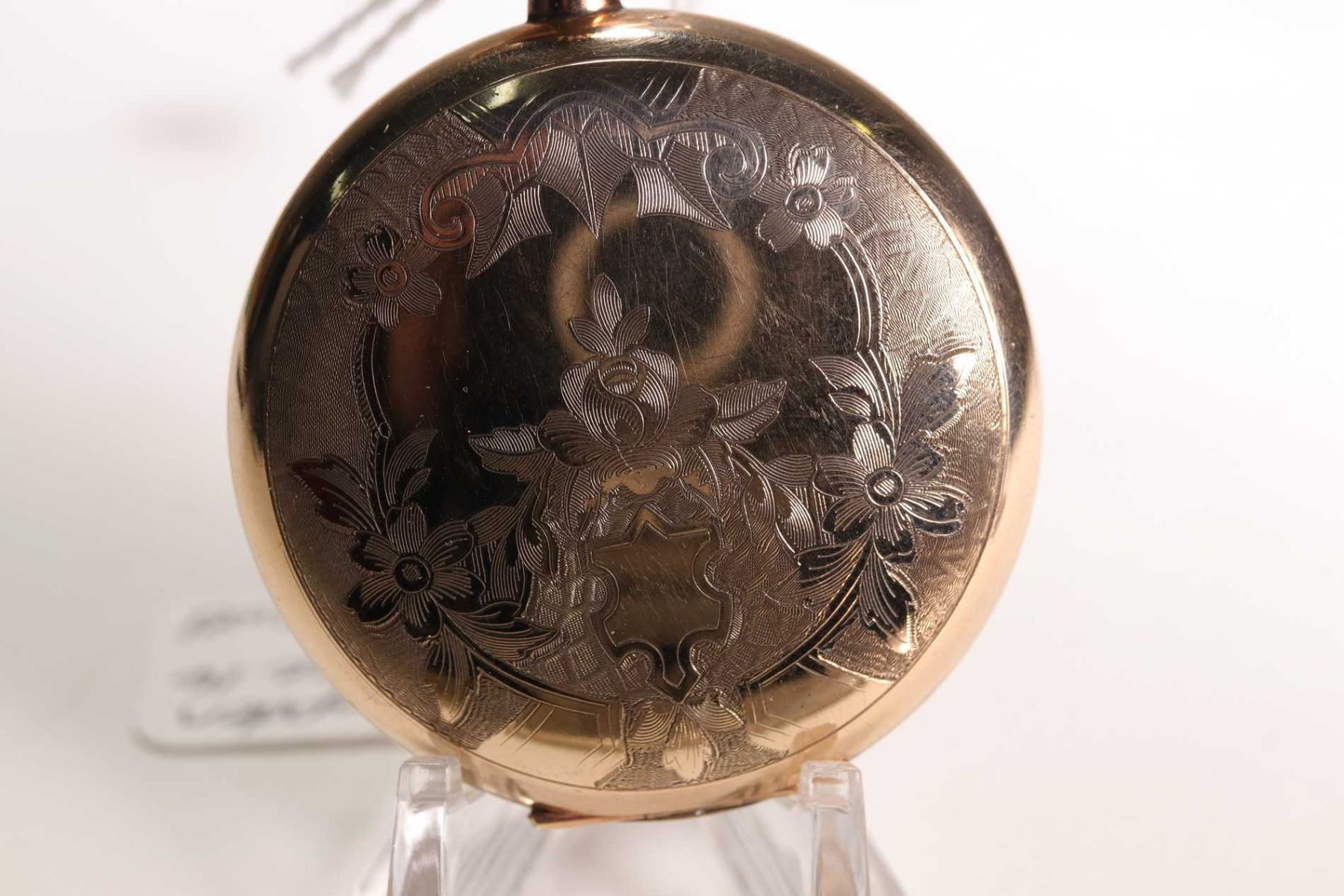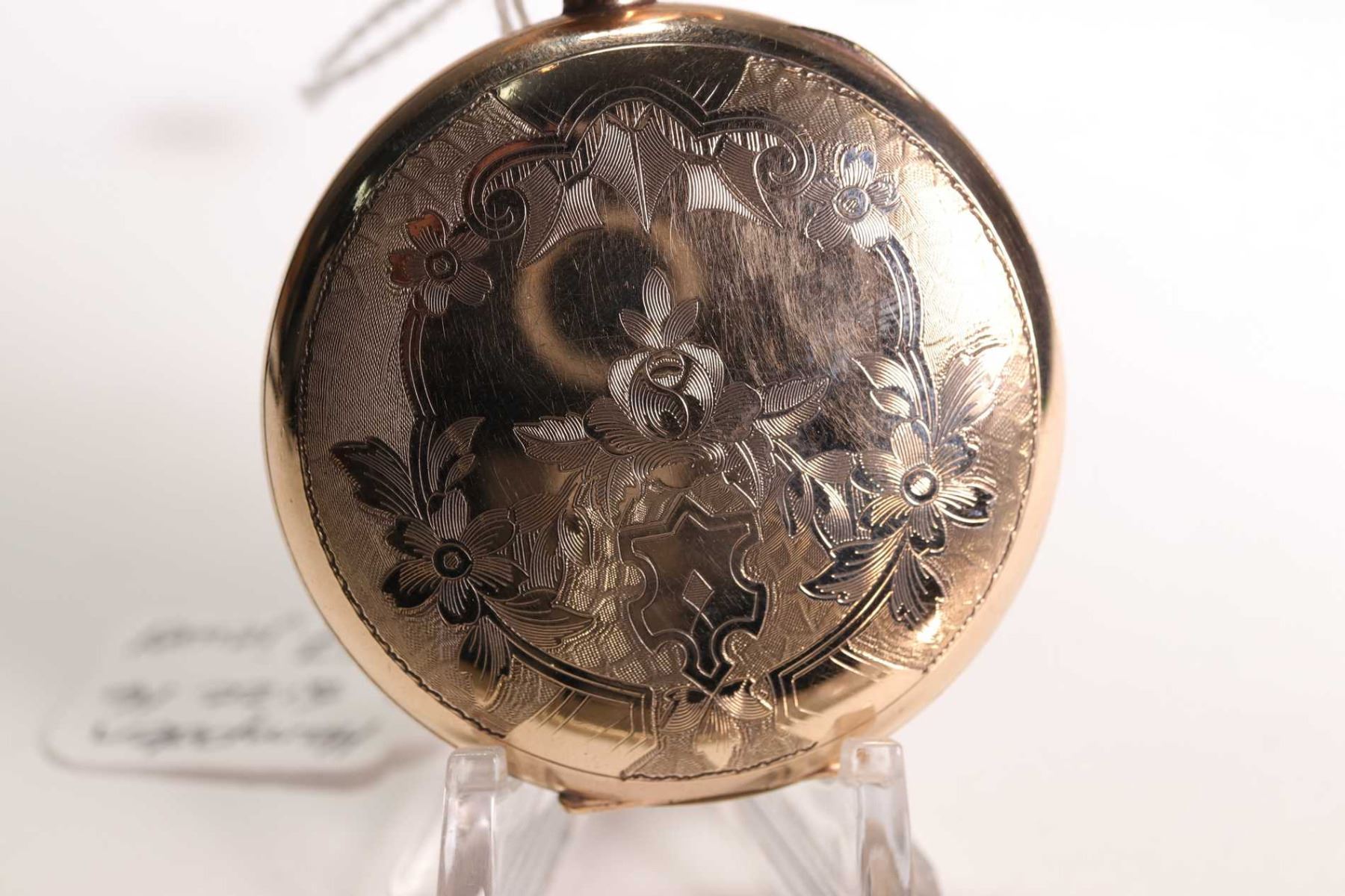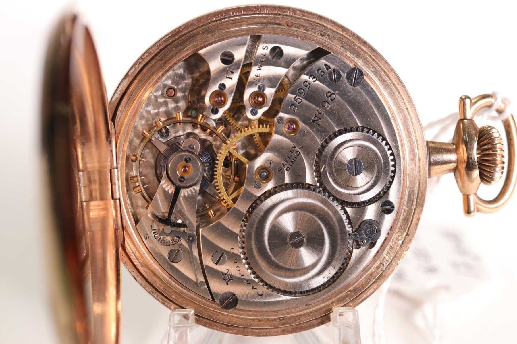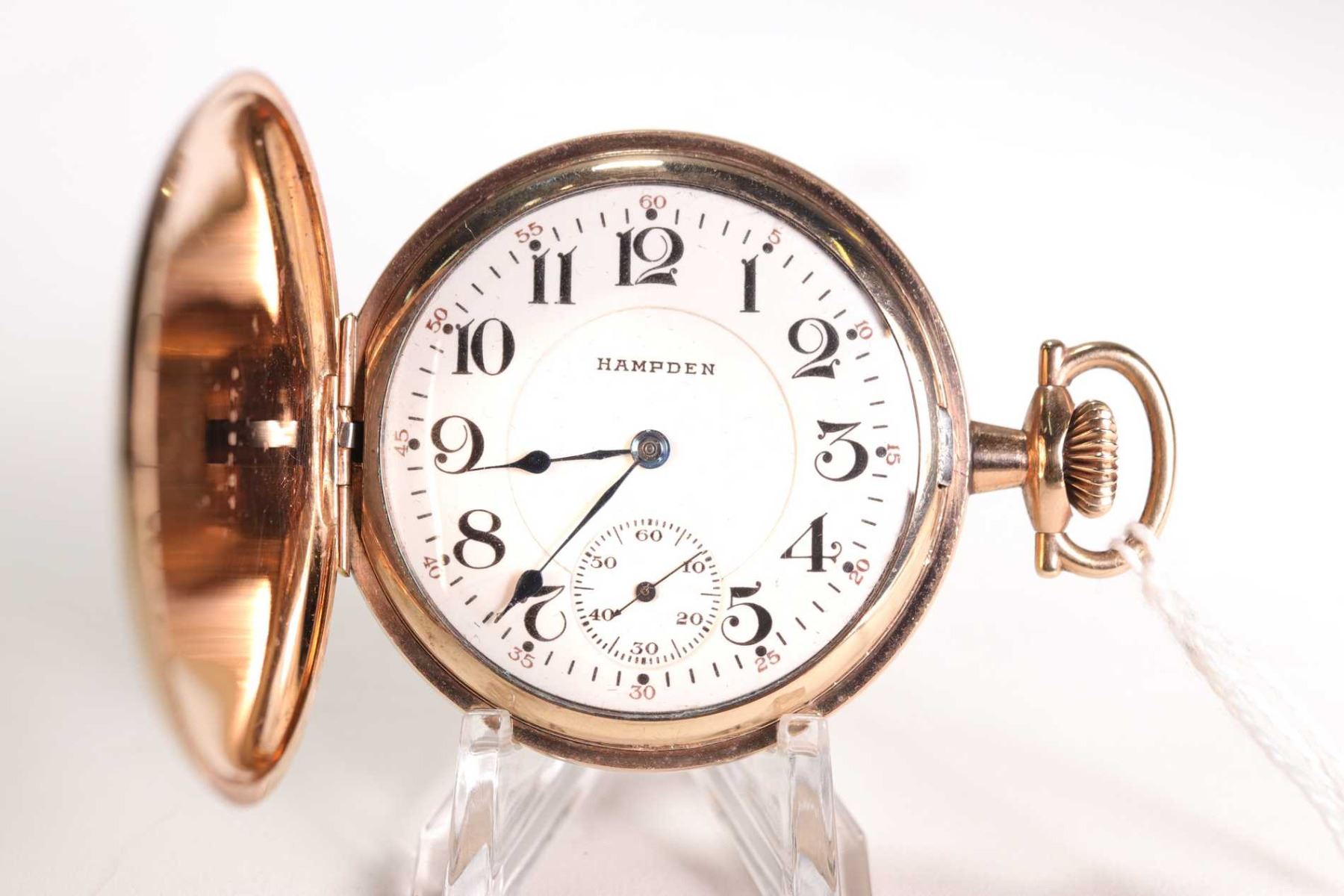 Hampden size 16, 17 jewel pocket watch. Grade 98, model 5, serial no. 3599334 dates to 1917. Two finger bridge nickel plate stem wind and set movement signed HWC Canton, O. with railroad style double sunk white porcelain dial with black Arabic numbers and matching spade style hands. Housed in an ornately engraved hunter style Philadelphia Watch Case Co. gold filled case. Working at time of cataloguing