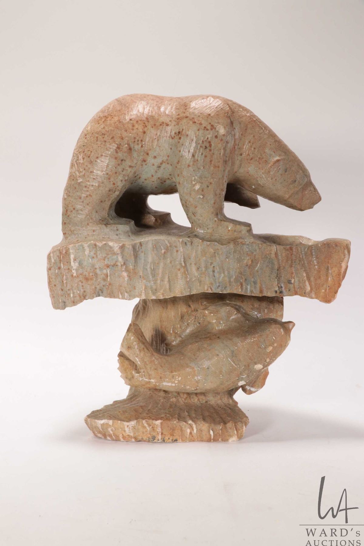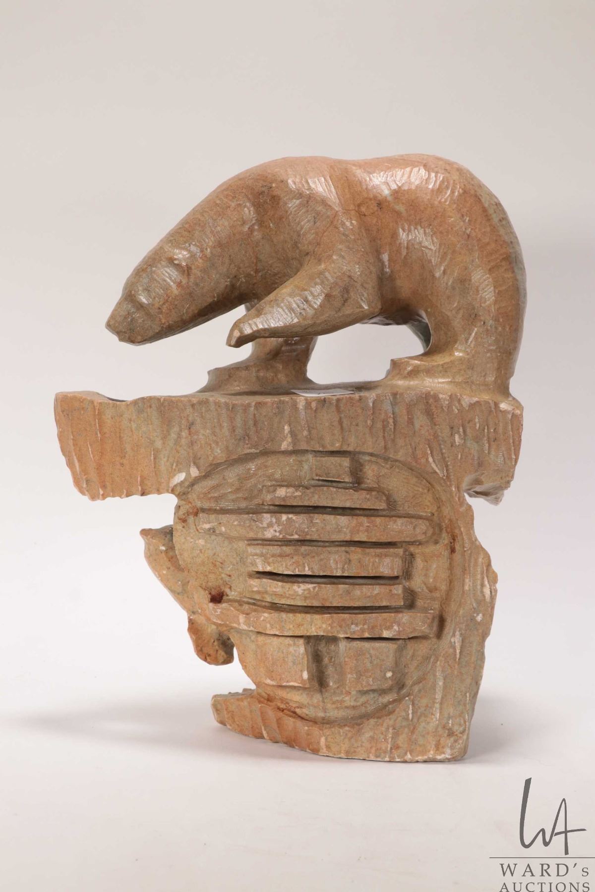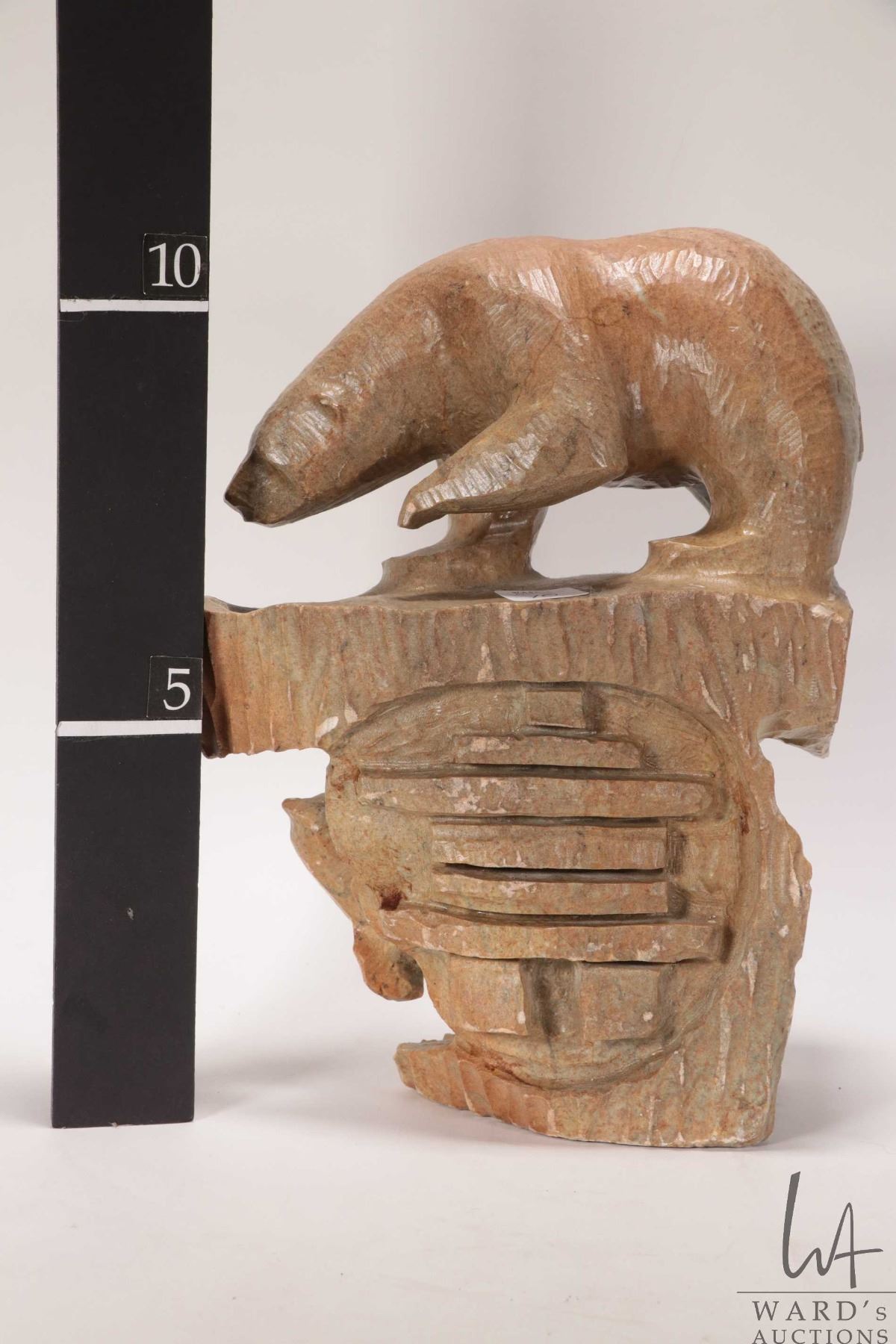 Hand carved Inuit soapstone titled "Arctic Bear on ice -Sealed Fate" and signed by artist Antoine and dated 2004, 11" in height