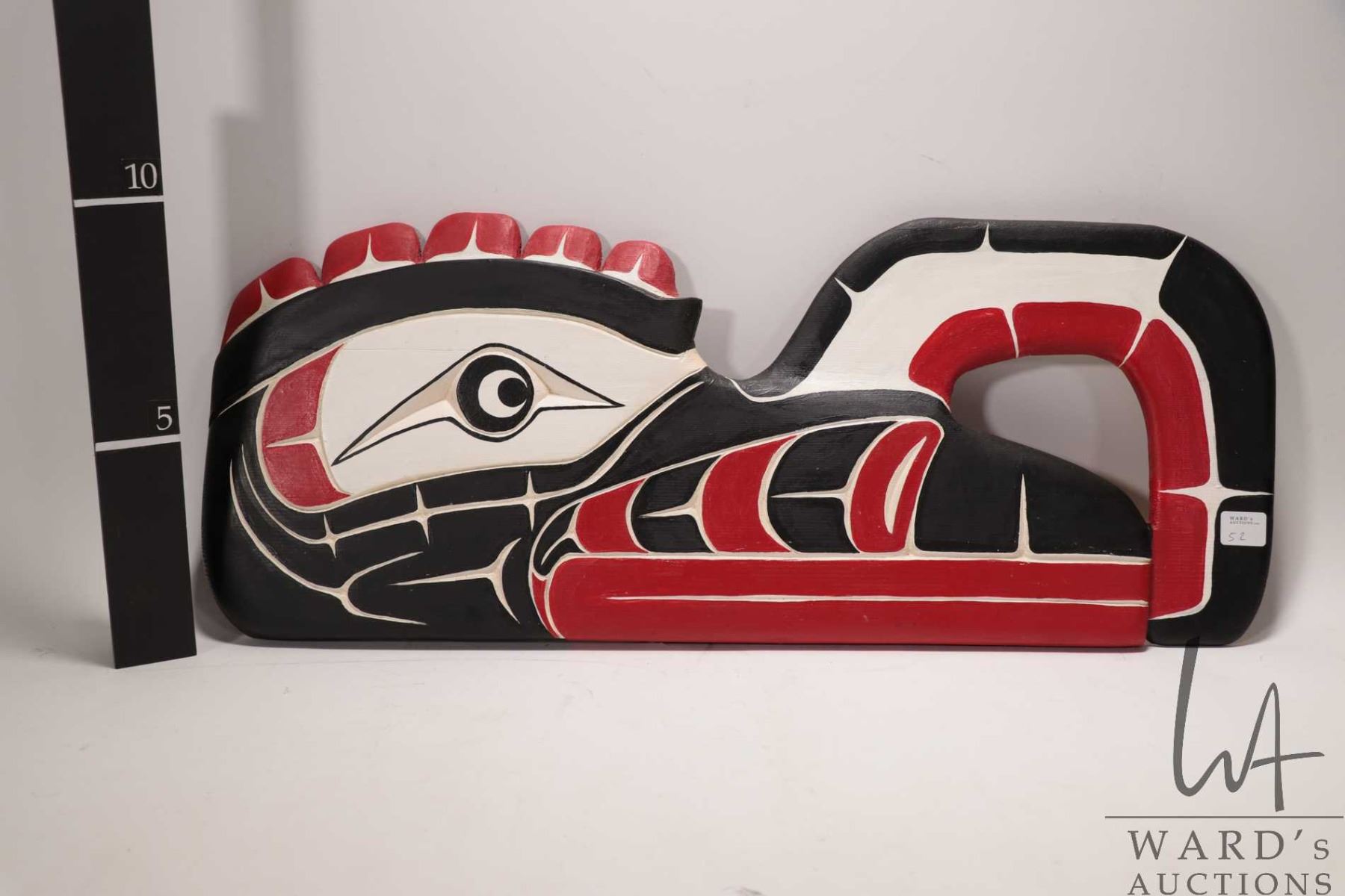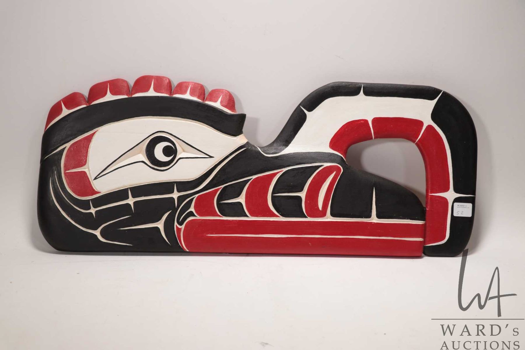 Hand carved and painted Haida plaque, titled on verso "Crooked Beak" and signed by artist Ross Hende