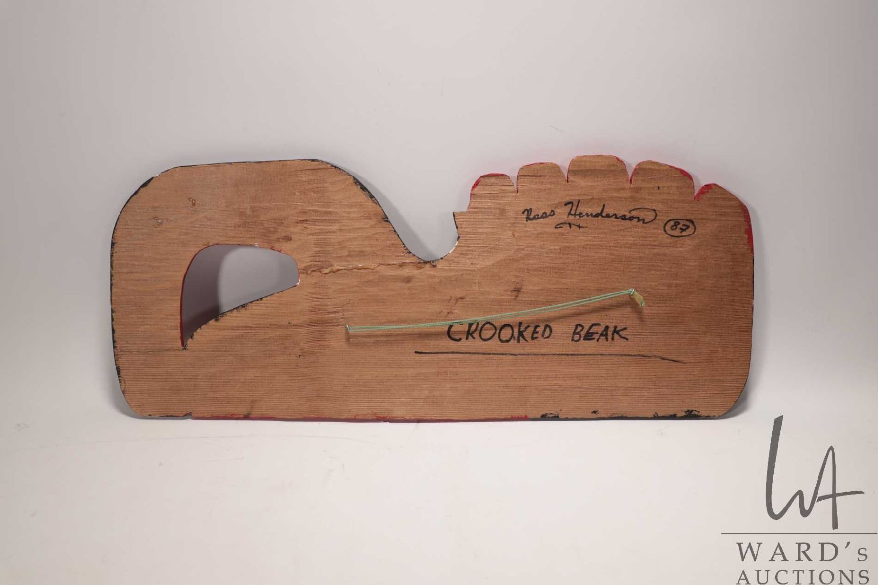 Hand carved and painted Haida plaque, titled on verso "Crooked Beak" and signed by artist Ross Henderson '87, 9 1/2" X 24 1/4"