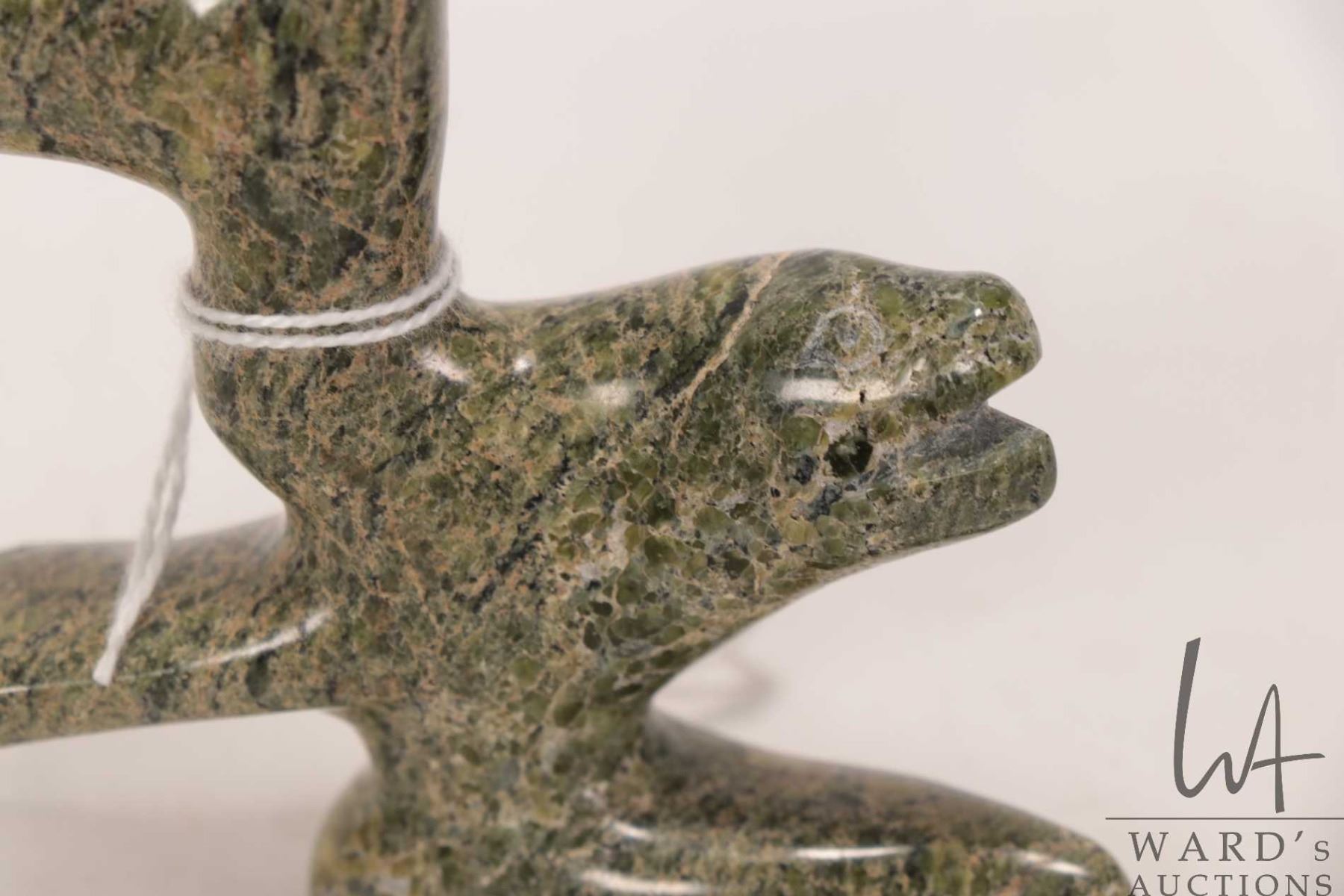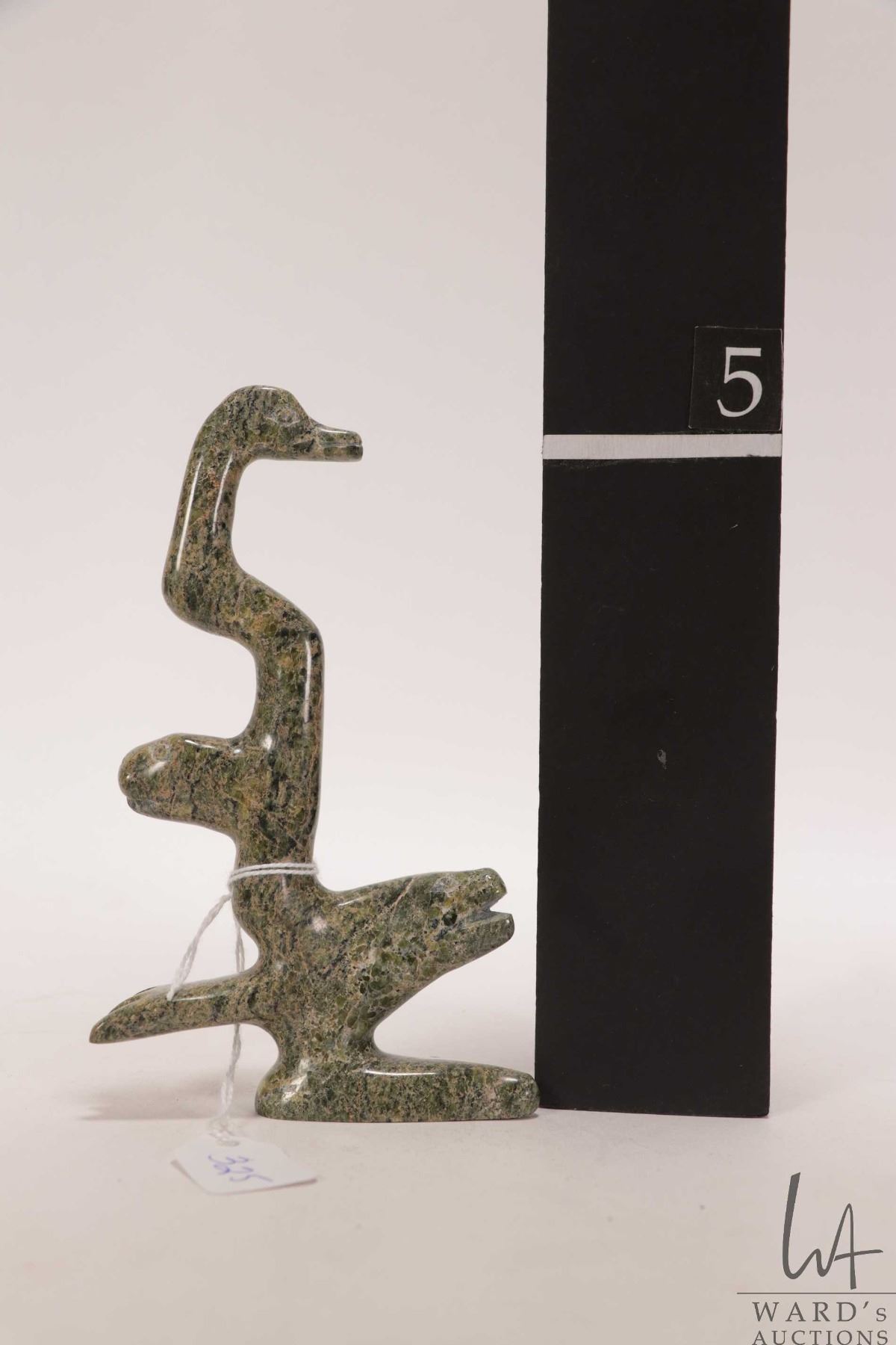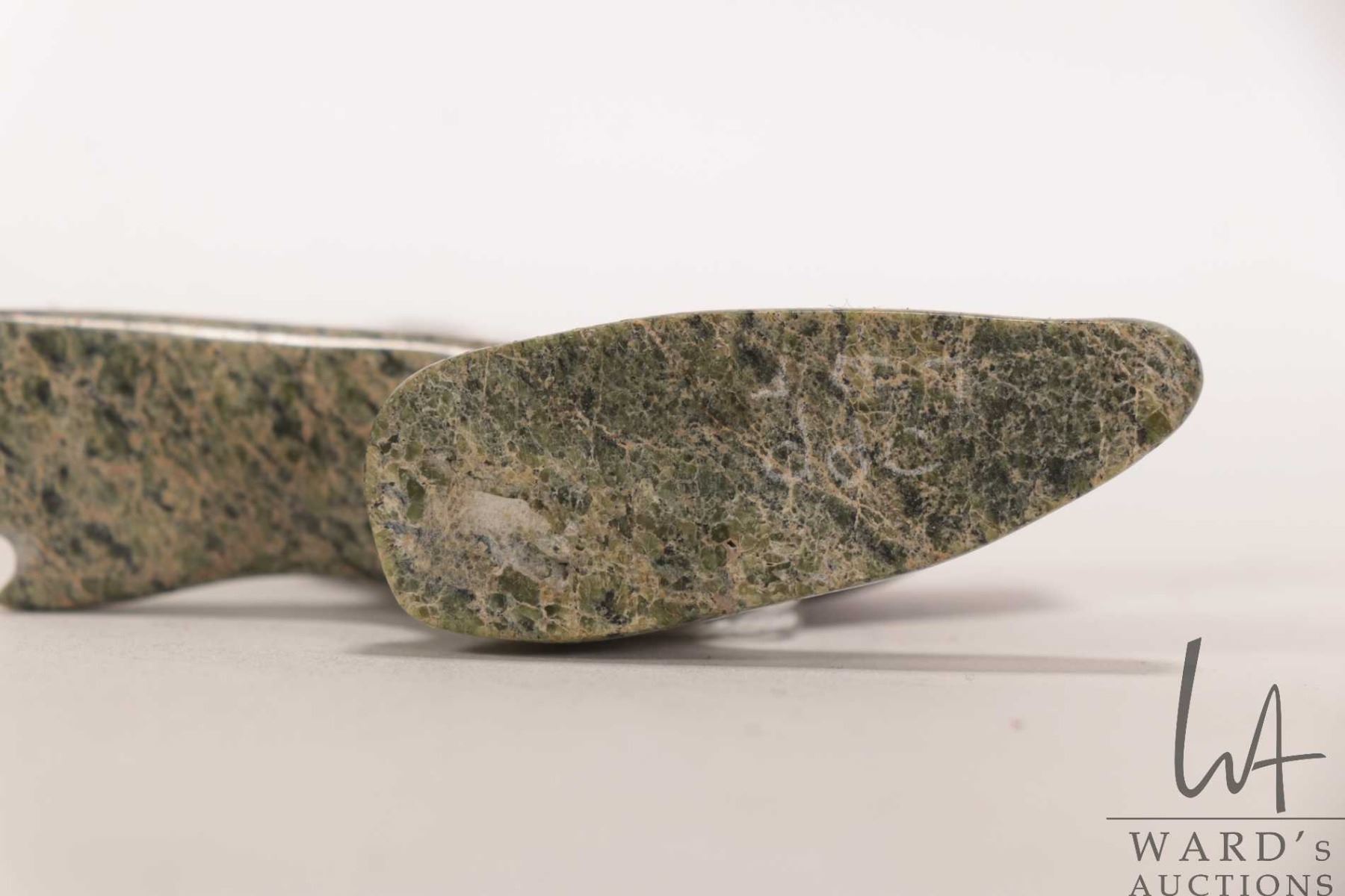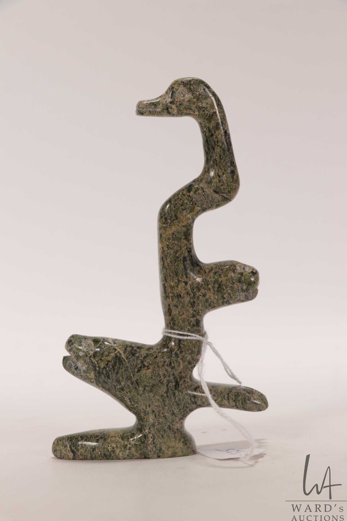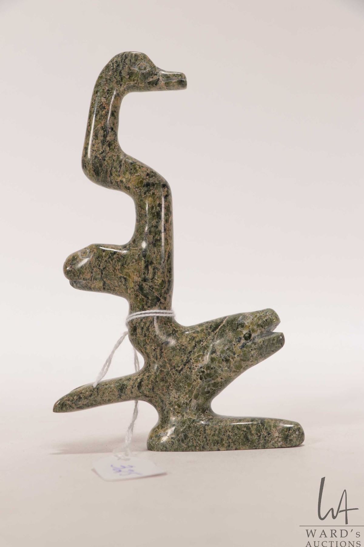 Hand carved green marble sculpture featuring salmon, seal and duck figures, 5 1/2" in height