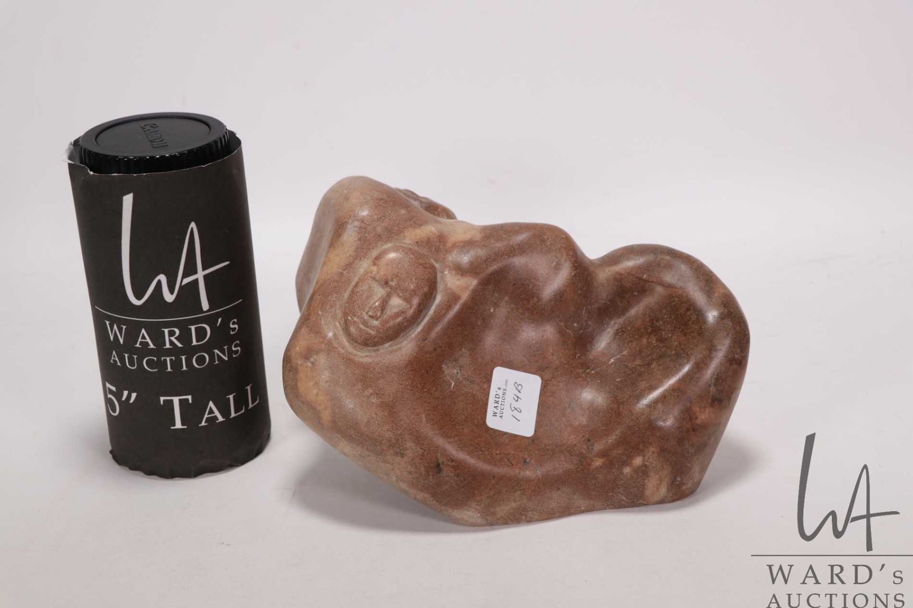 Hand carved soapstone sculpture labeled "The Scream As Seen With Other Faces" and signed by artist A. (Andrew) Mirth, 7" in length and 5" in height