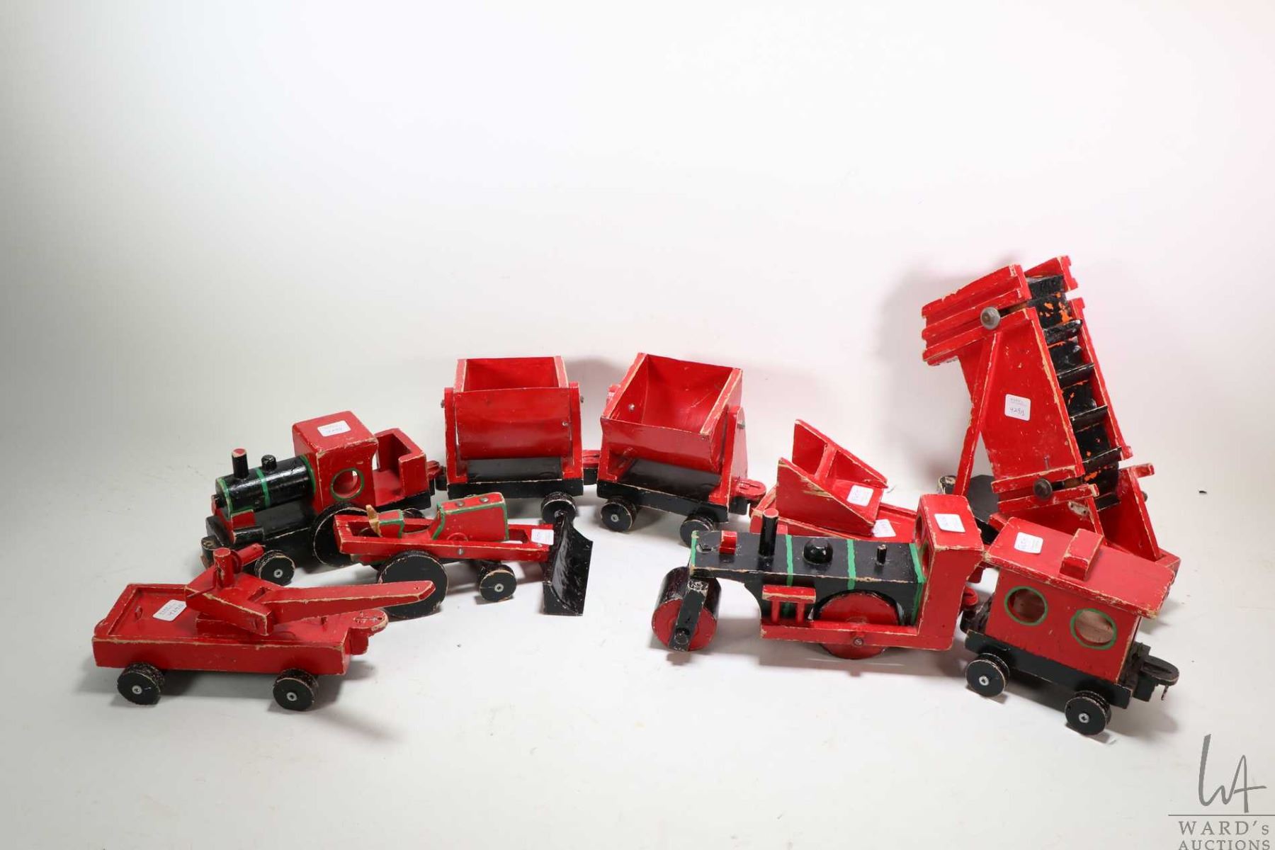 Hand crafted wooden toy set including coal train, lifting conveyor, steam tractor etc.