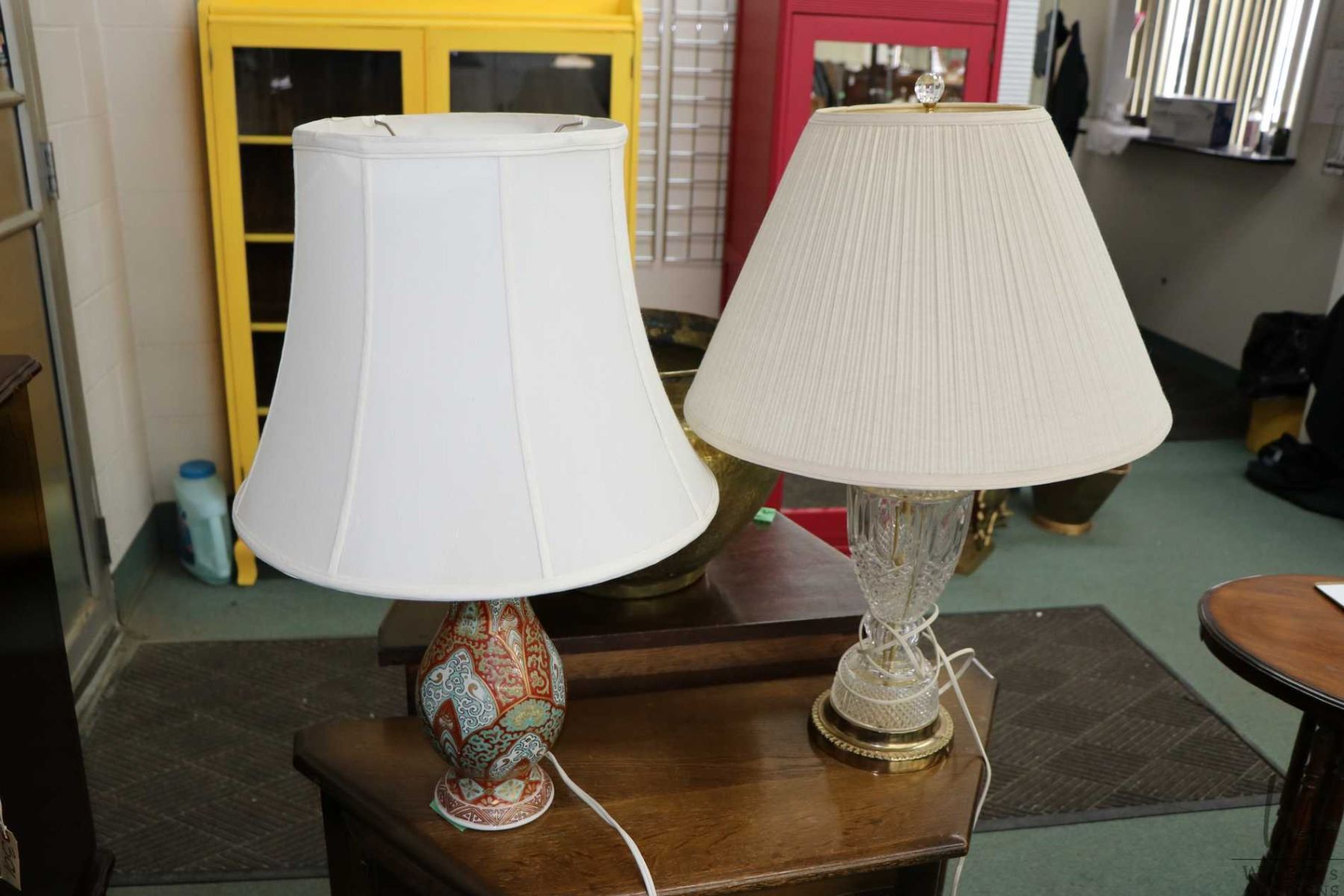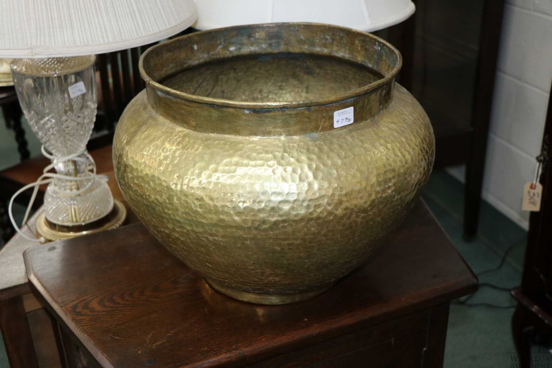 Hand hammered brass jardinere, crystal table lamp and an Oriental porcelain table lamp, both with shades