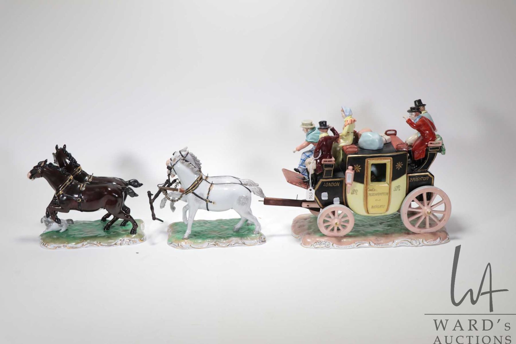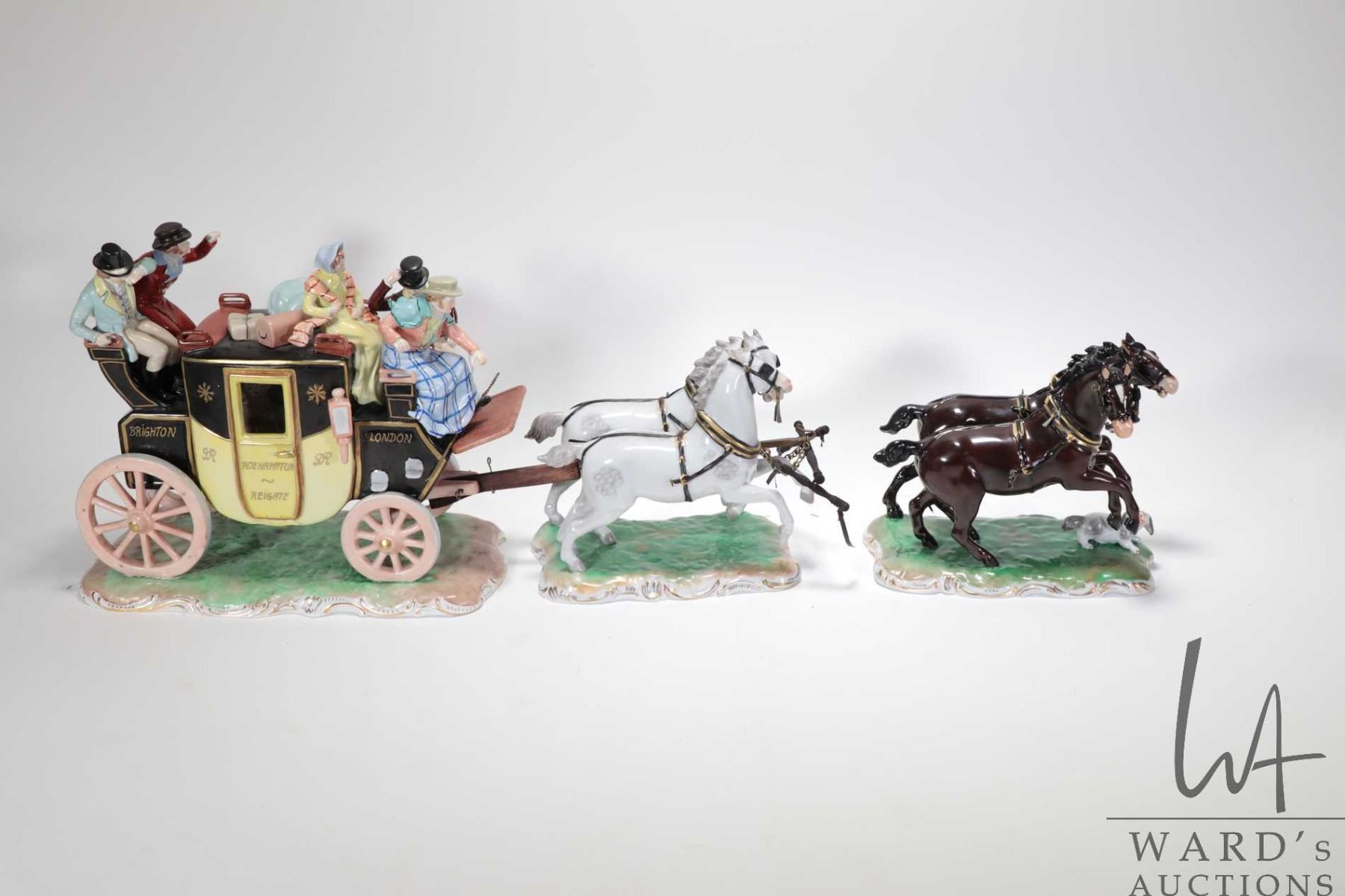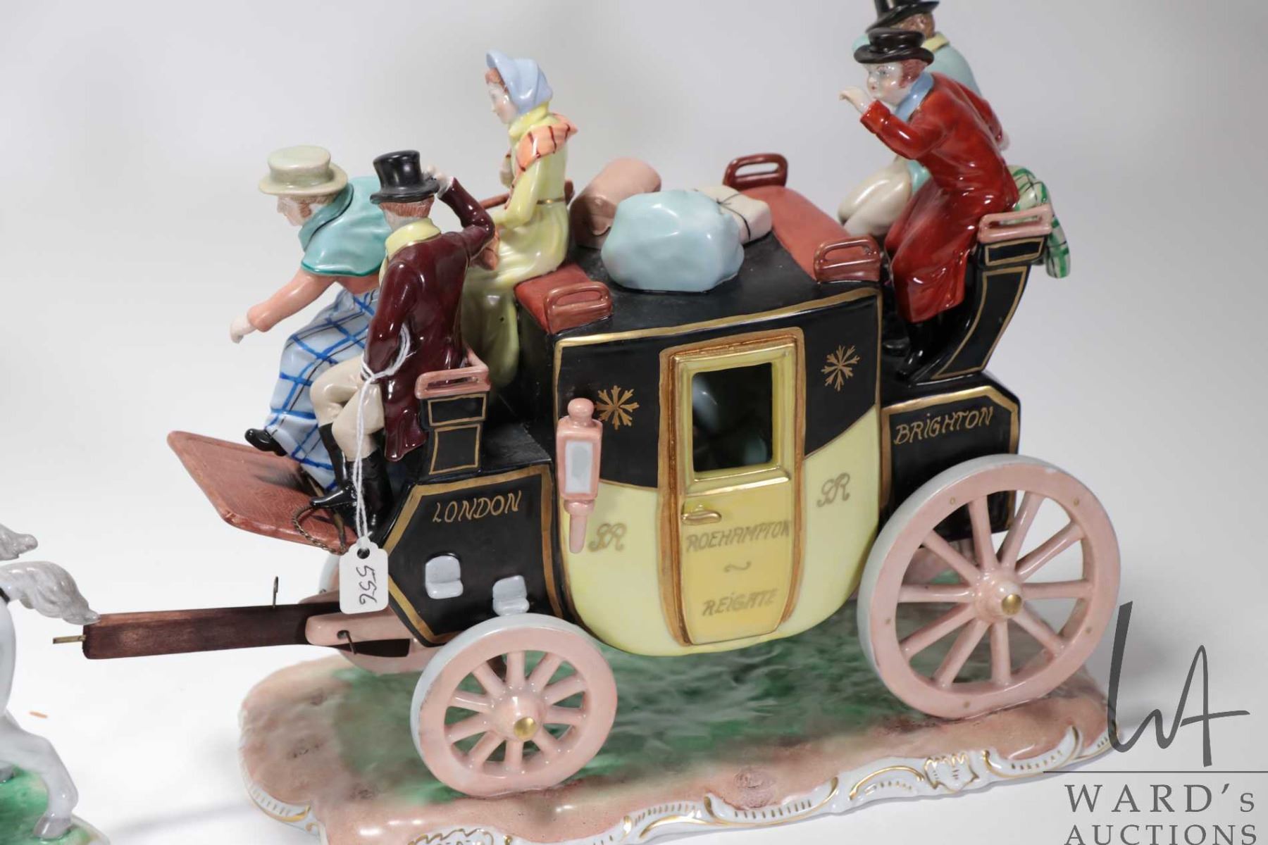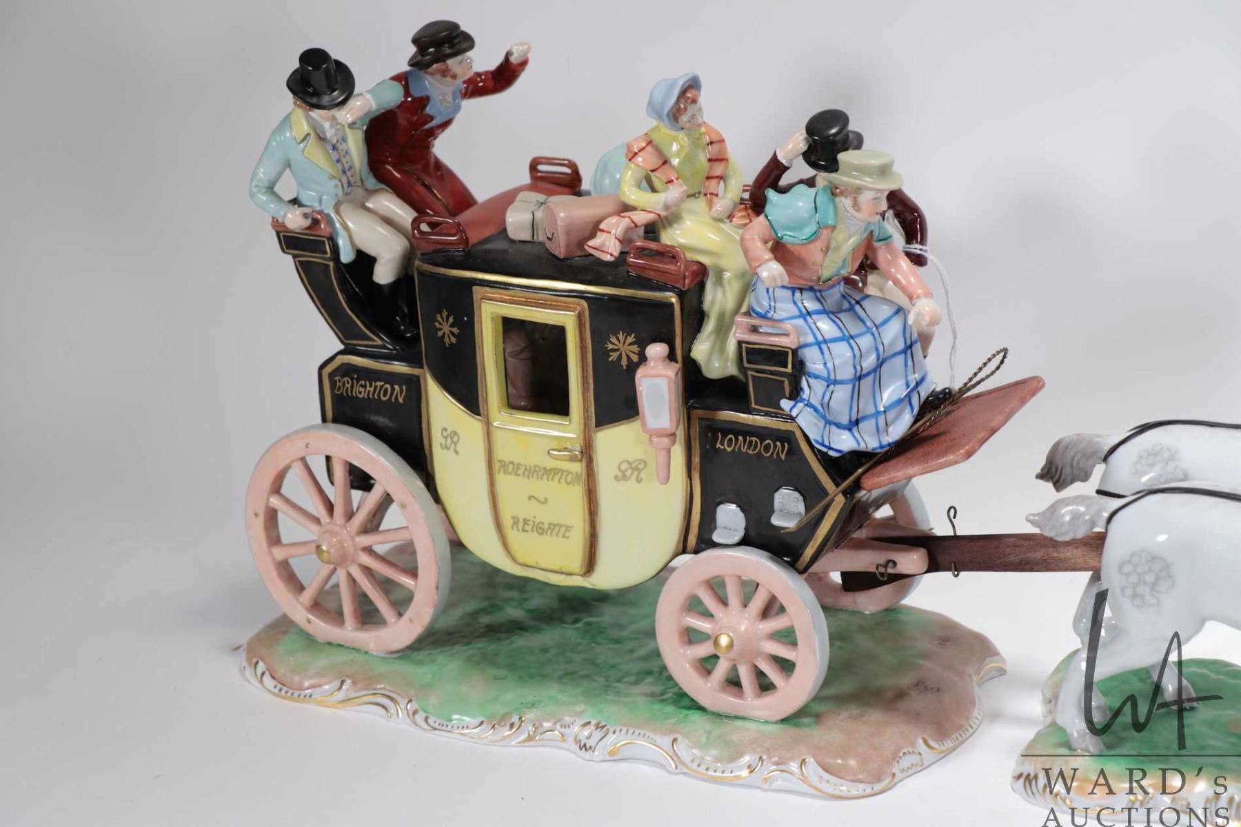 Hand painted Dresden porcelain stage coach "London to Brighton" including four horse, 28" in length including all three pieces