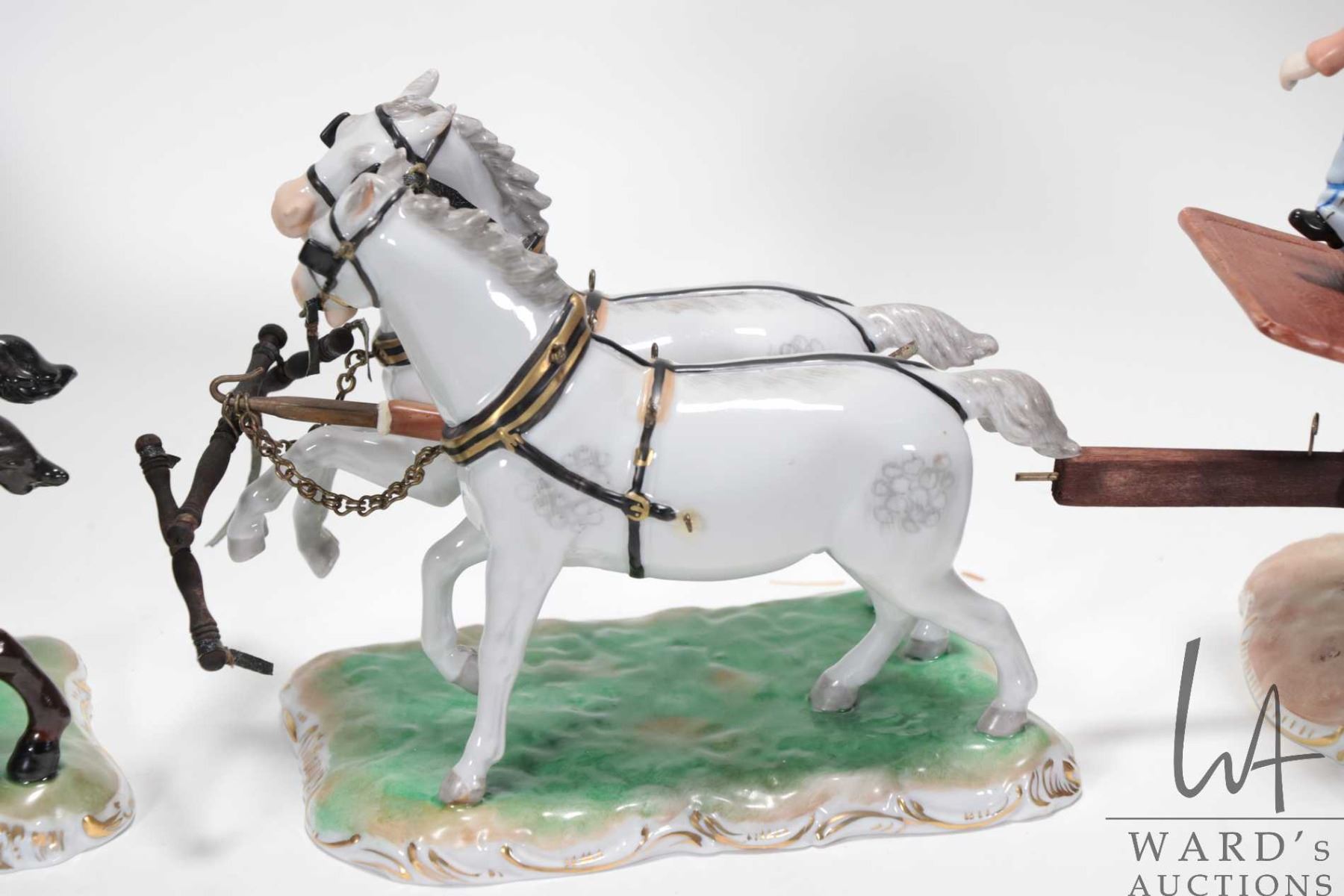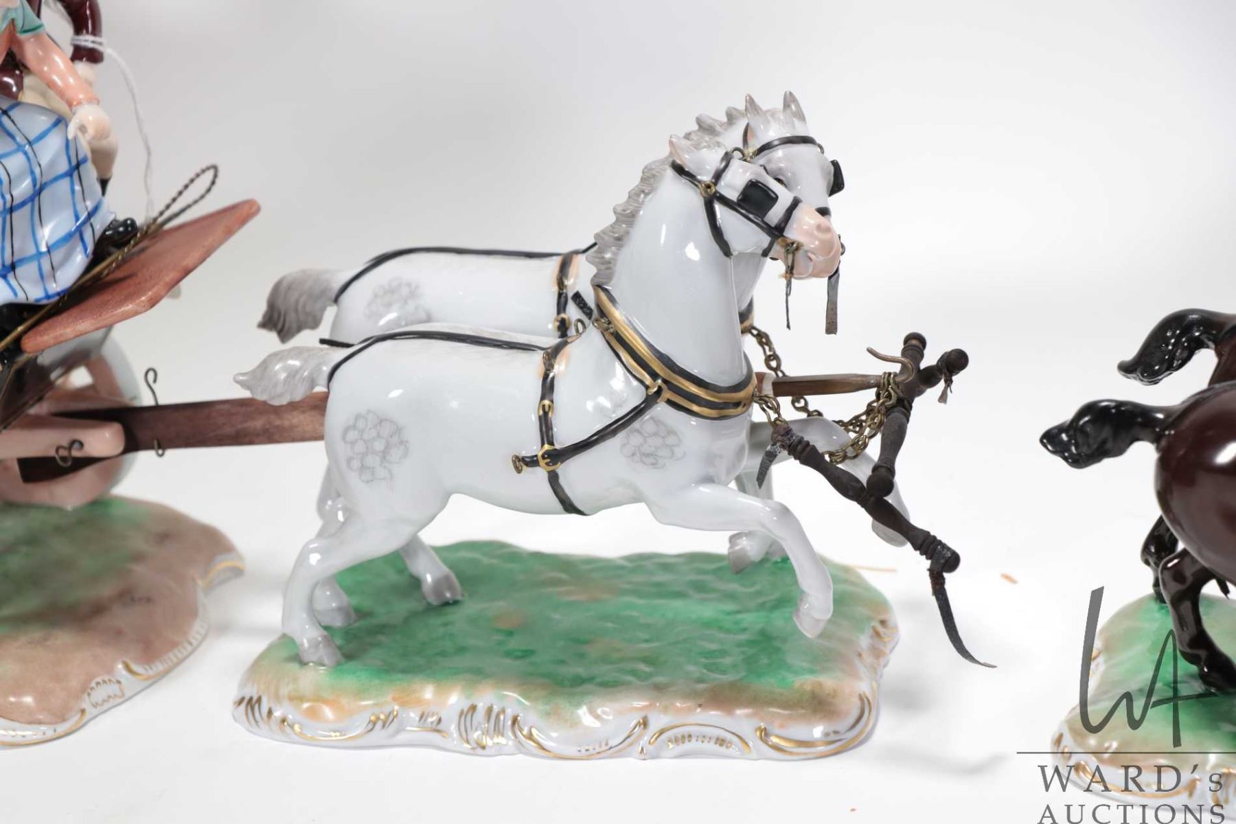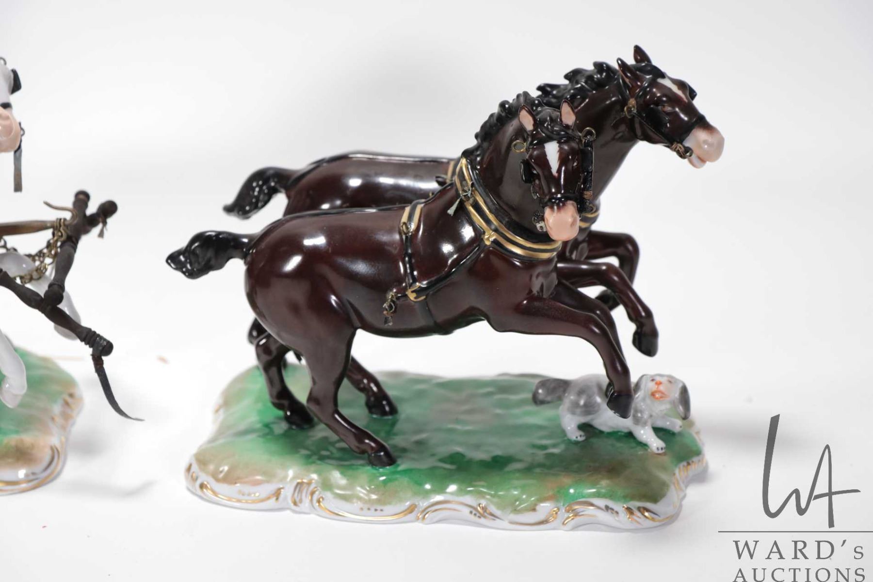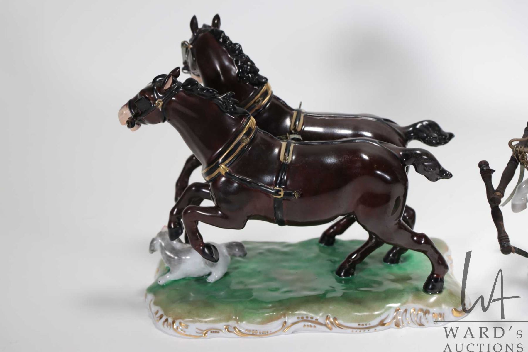 Hand painted Dresden porcelain stage coach "London to Brighton" including four horse, 28" in length including all three pieces