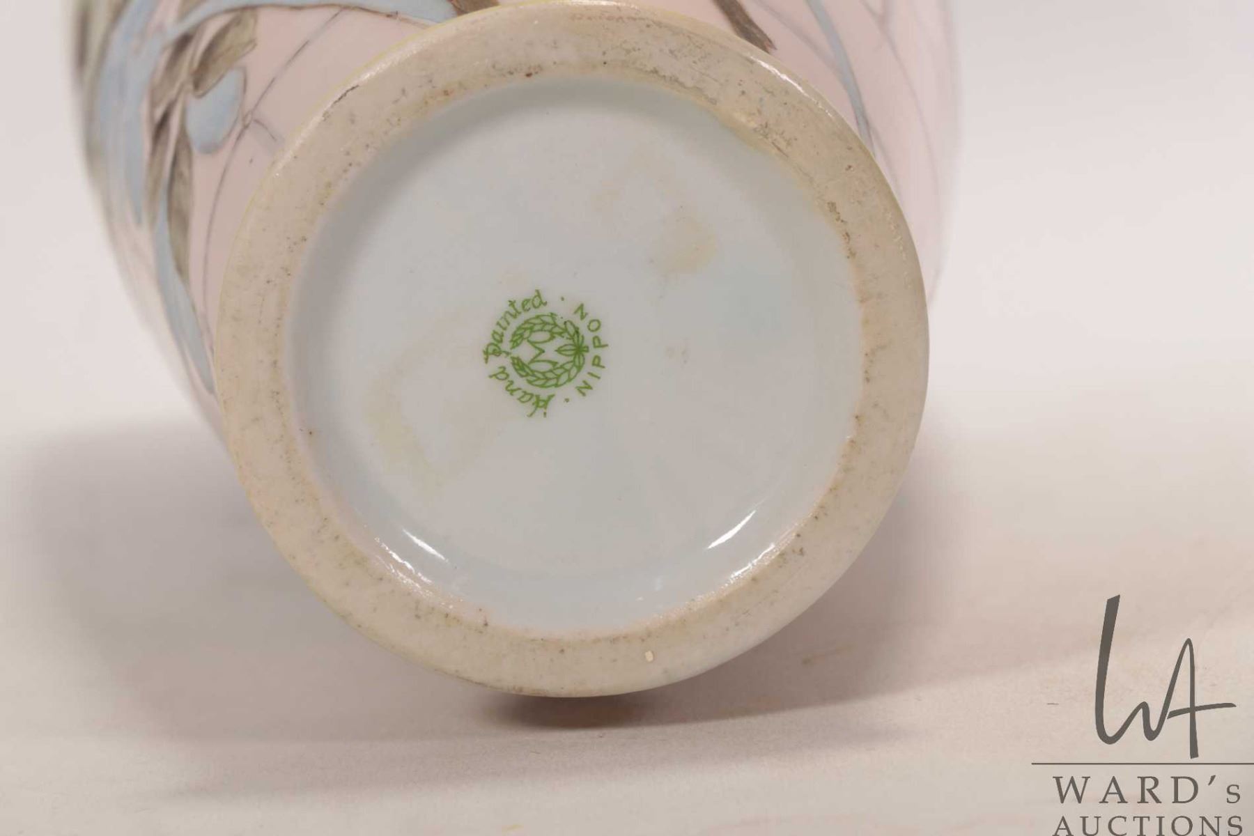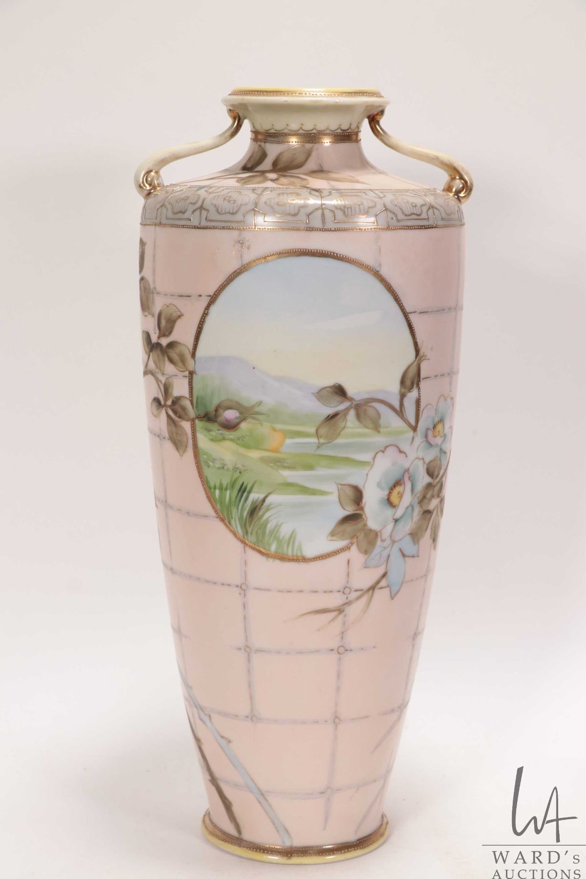 Hand painted Nippon pictorial and floral double handled vase 13 1/2"