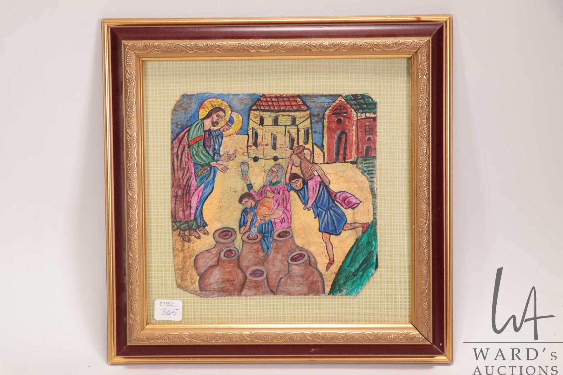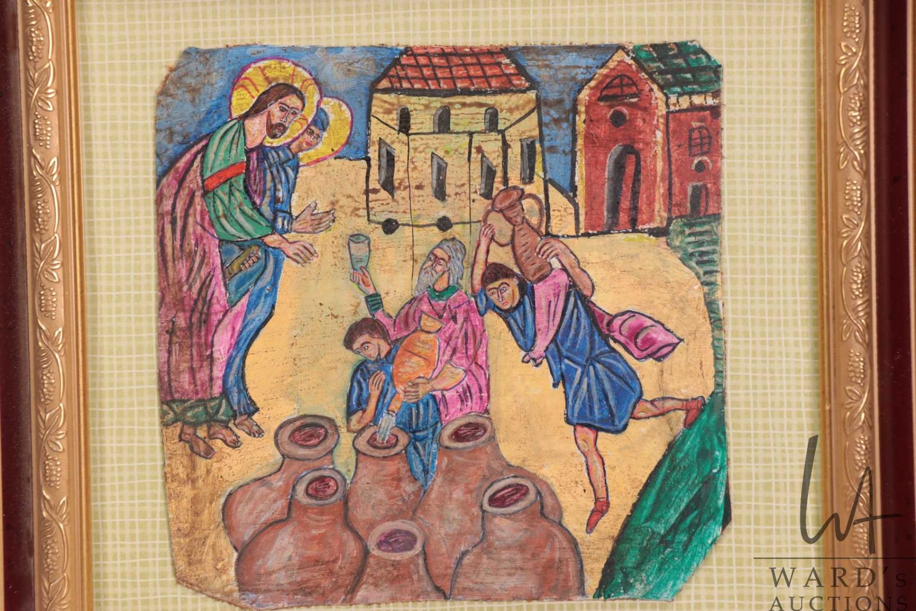 Hand painted on leather Greek Orthodox icon "Wedding in Cana of Galilee", overall dimensions including frame 12-1/2" x 12-1/2"