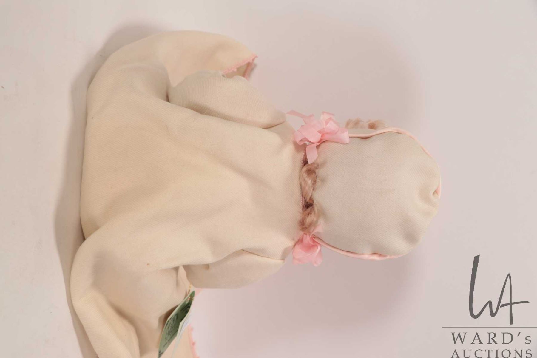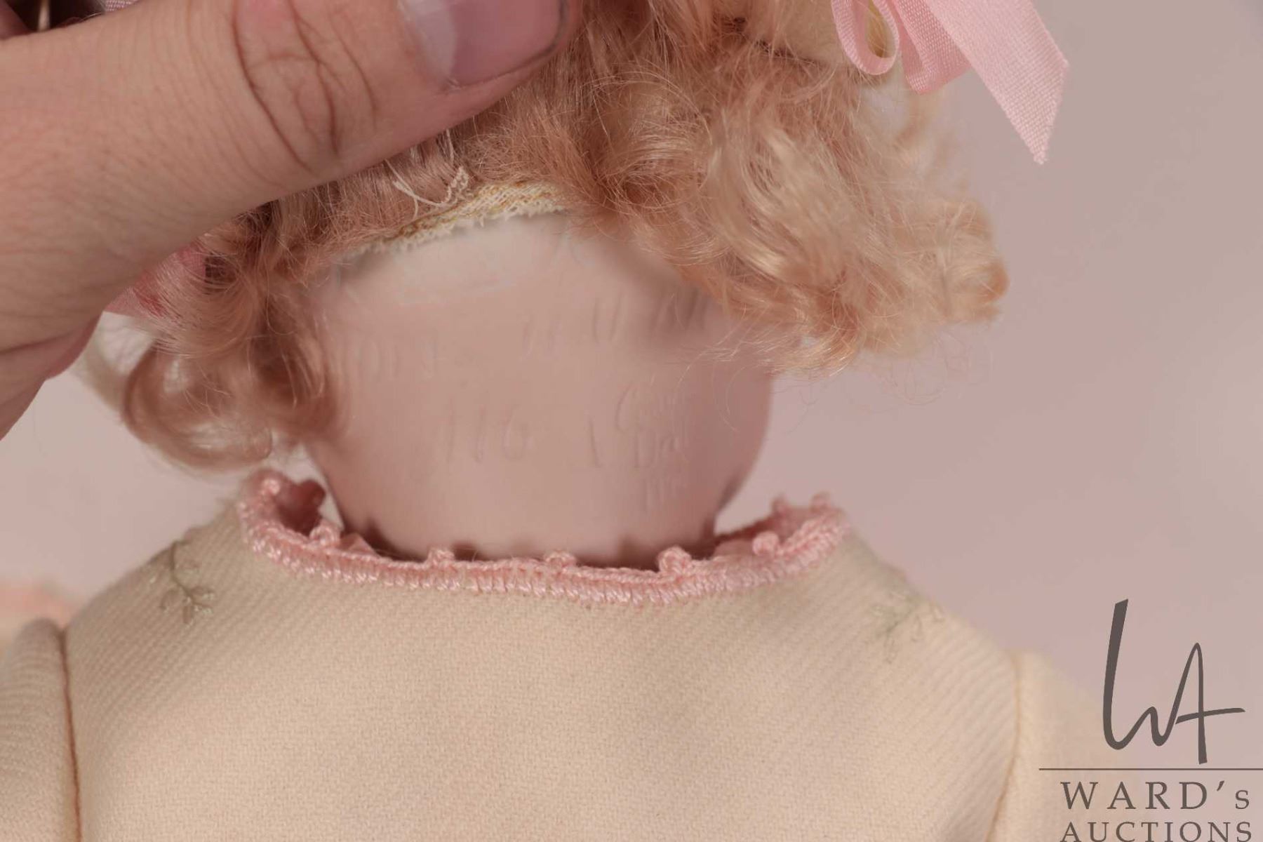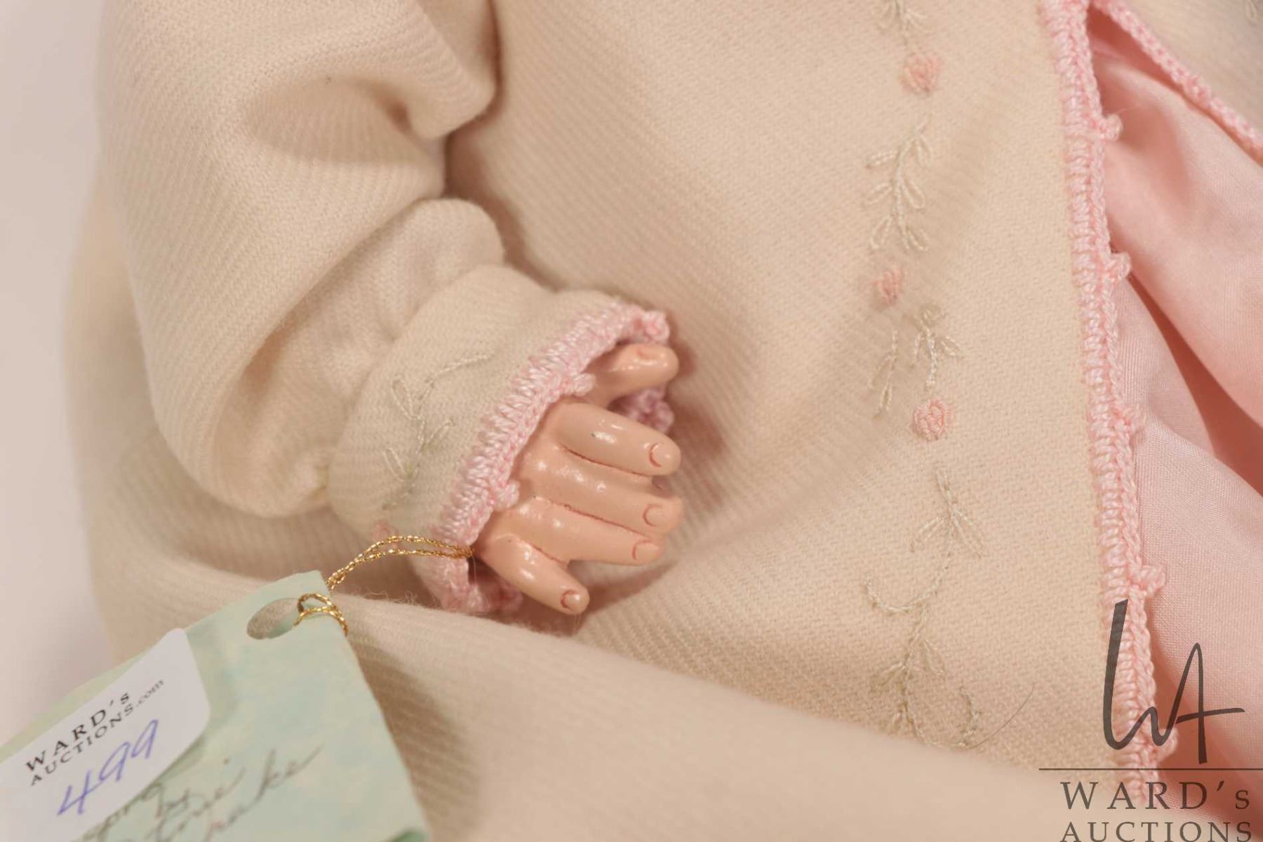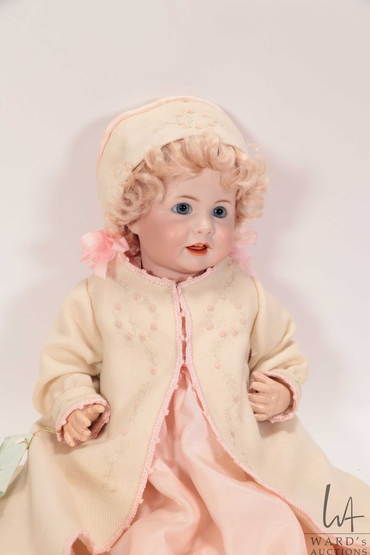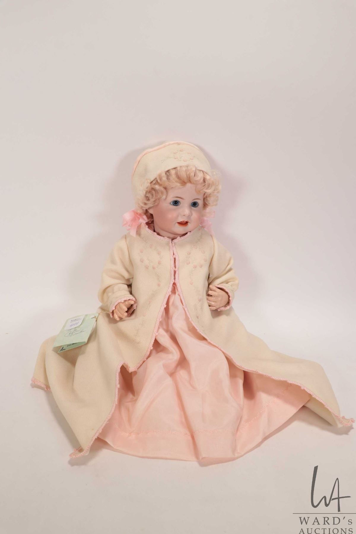Handmade reproduction doll K&R 116/A by Kammer and Reinhardt. bisque head, threaded blue glass eyes, open mouth with tongue, mohair wig. Beautifully costumed in pink silk dress with embroidered wool hat and coat, 14" in height. Made by doll artist Connie Drake
