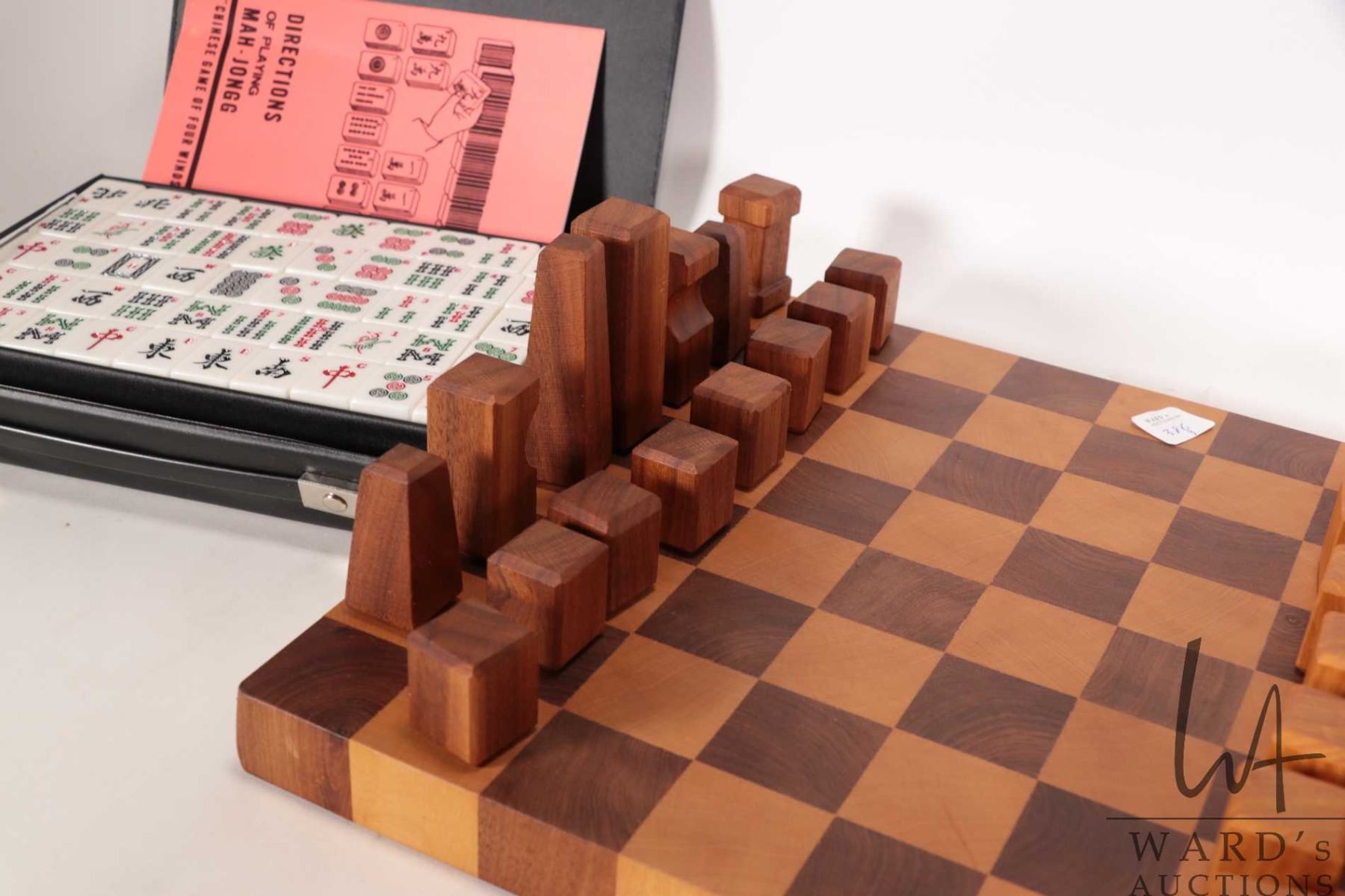 Handmade wooden chess board with pieces and a set of molded chess pieces plus a boxed set of Mahjong tiles