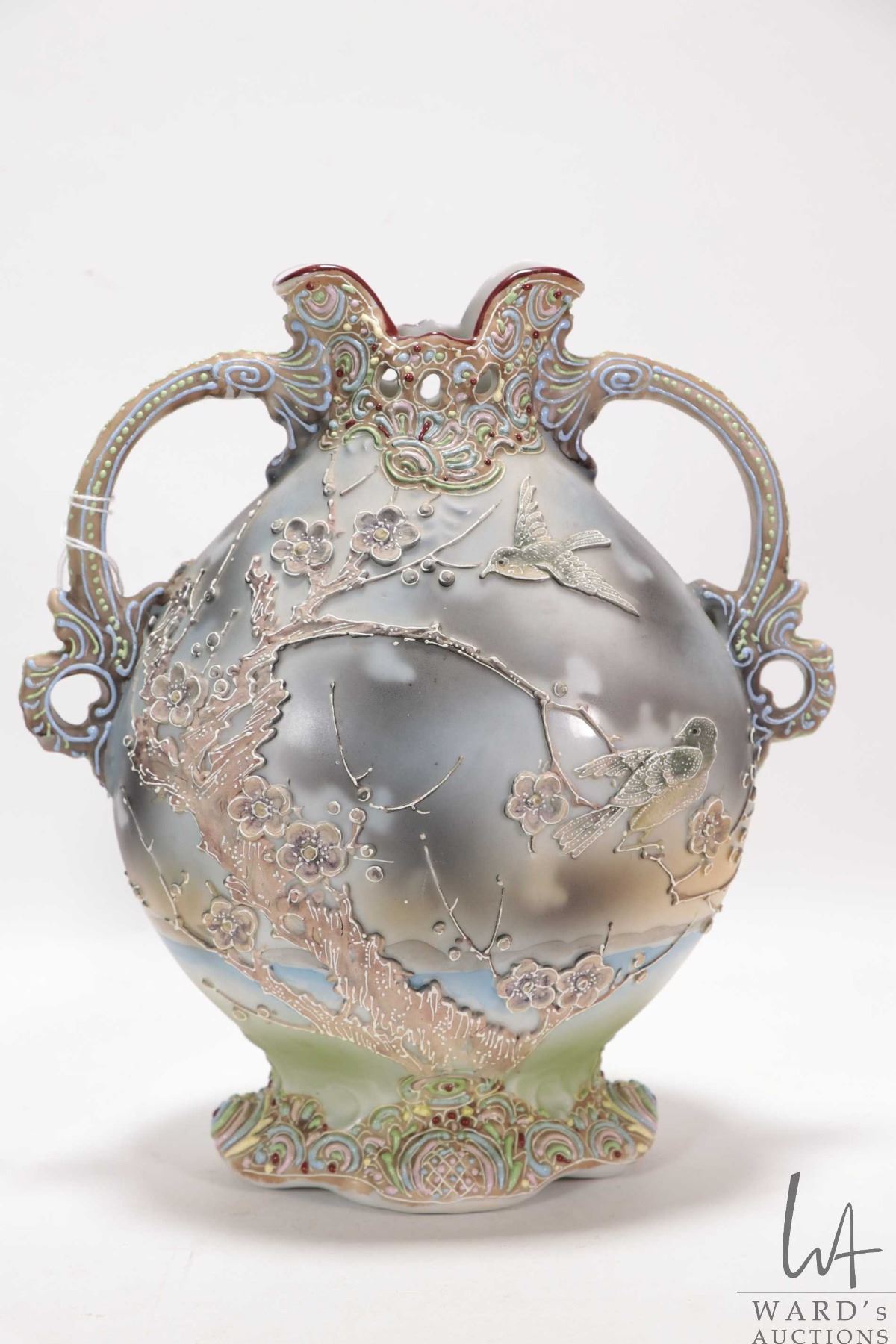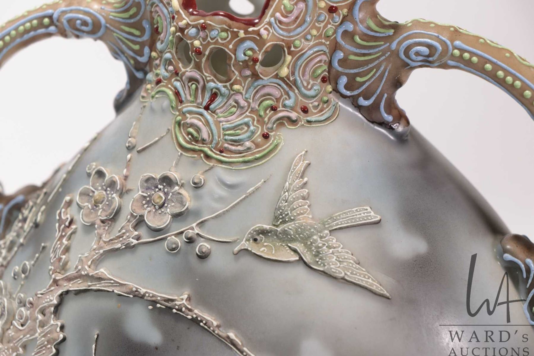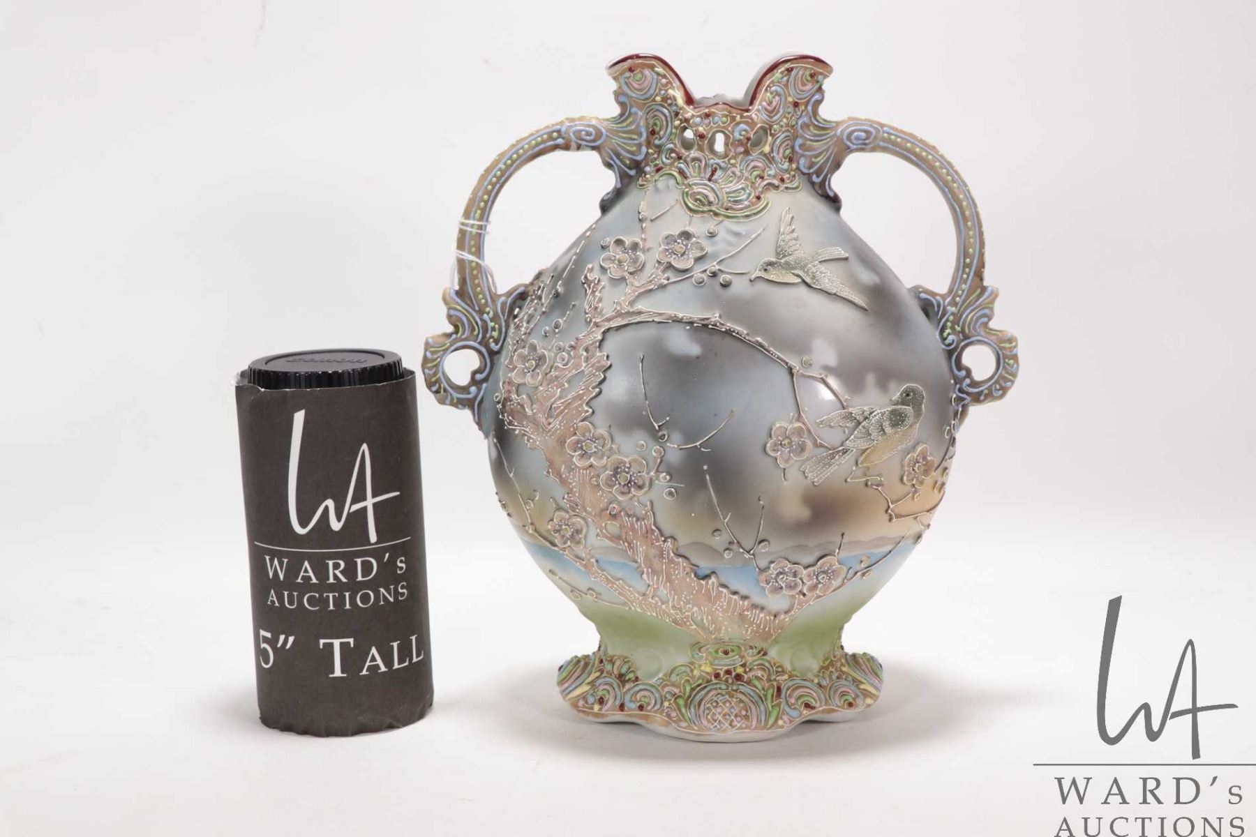Handpainted Japanese Nippon Moriage double handled vase with floral and fauna motif, 9 1/2"