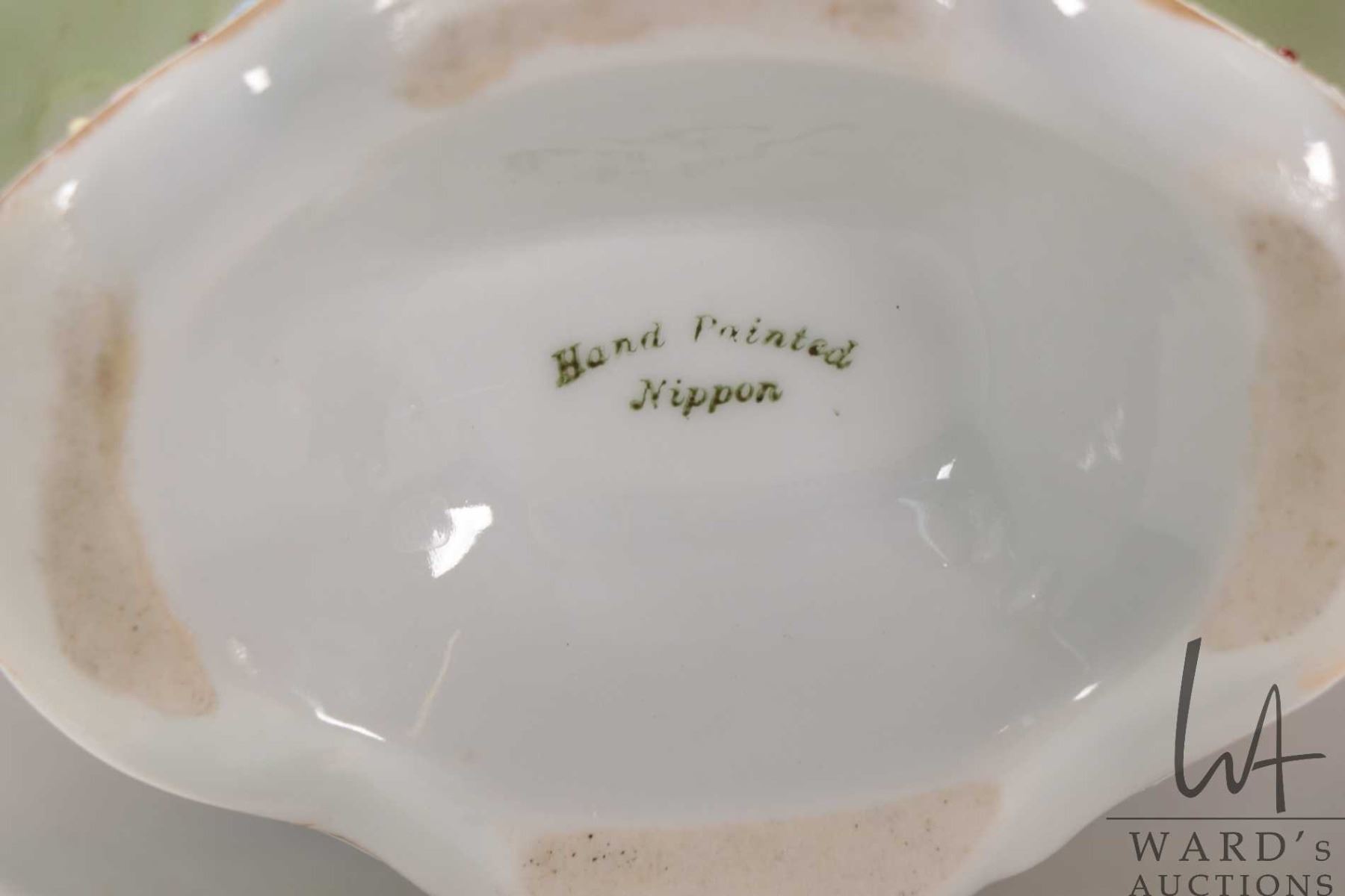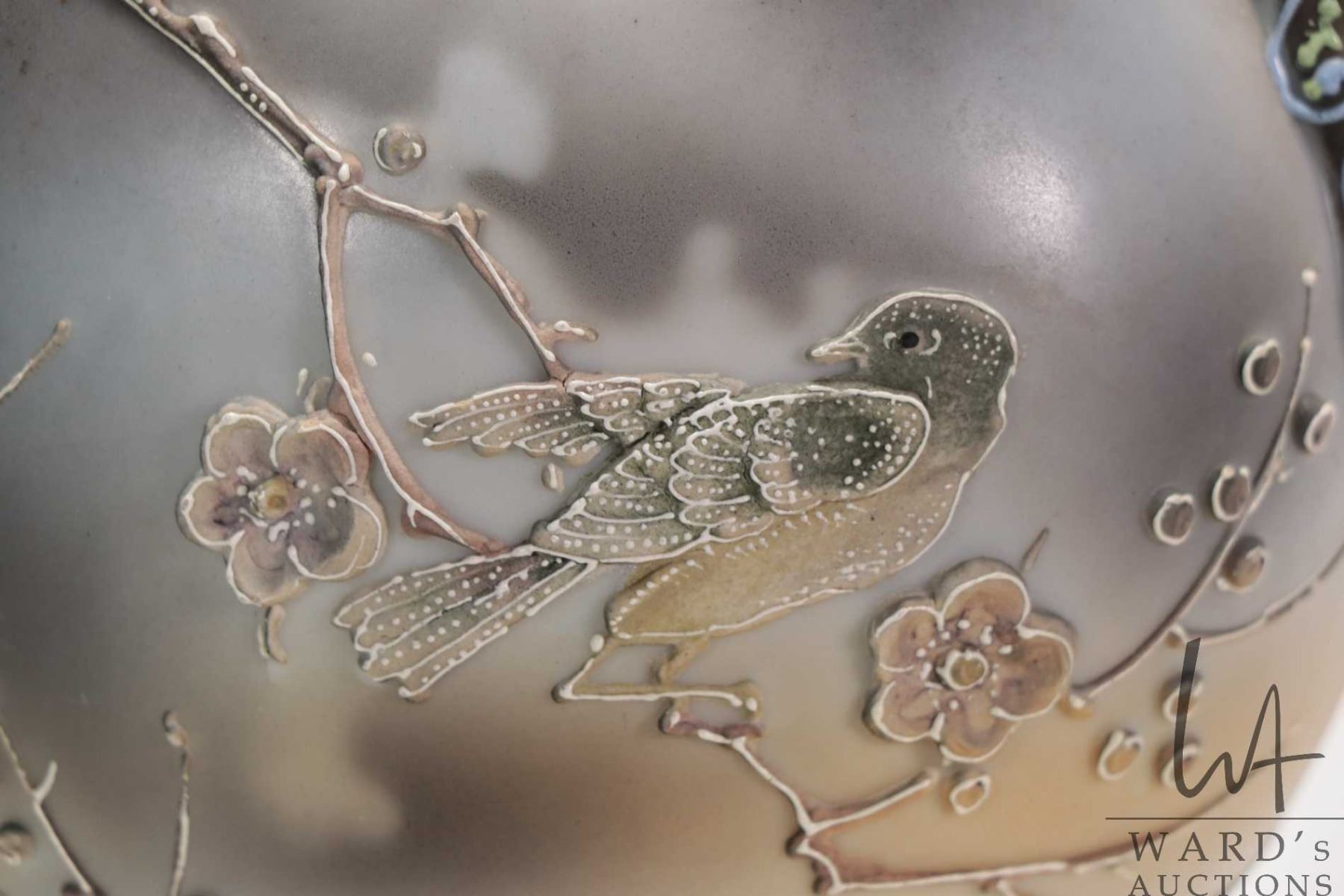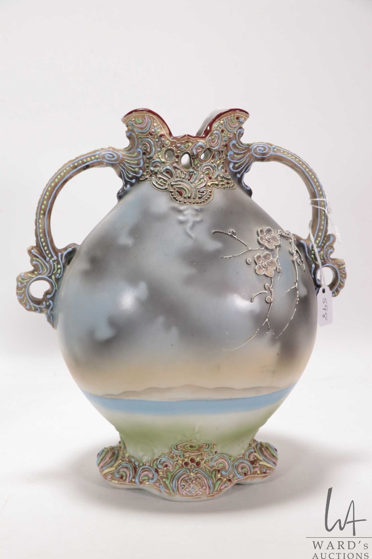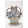 Handpainted Japanese Nippon Moriage double handled vase with floral and fauna motif, 9 1/2"