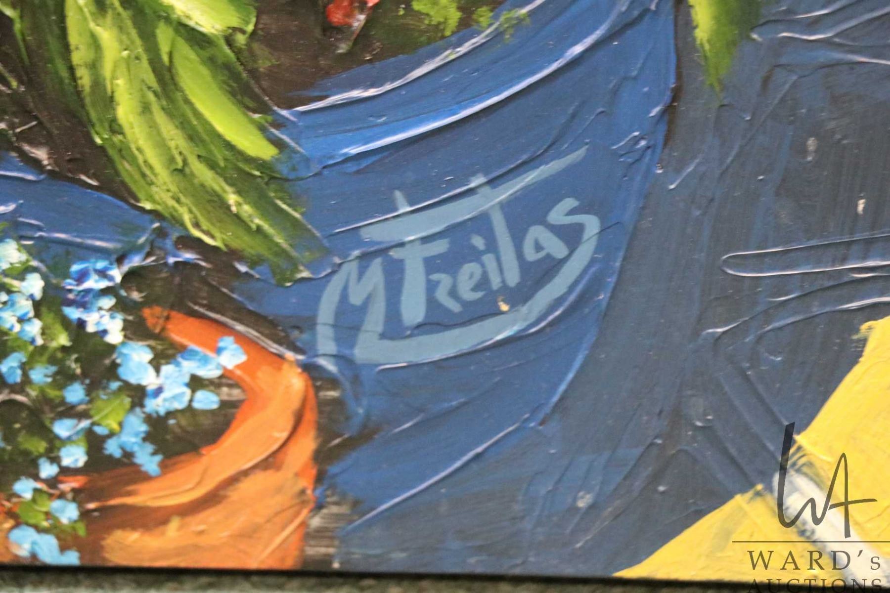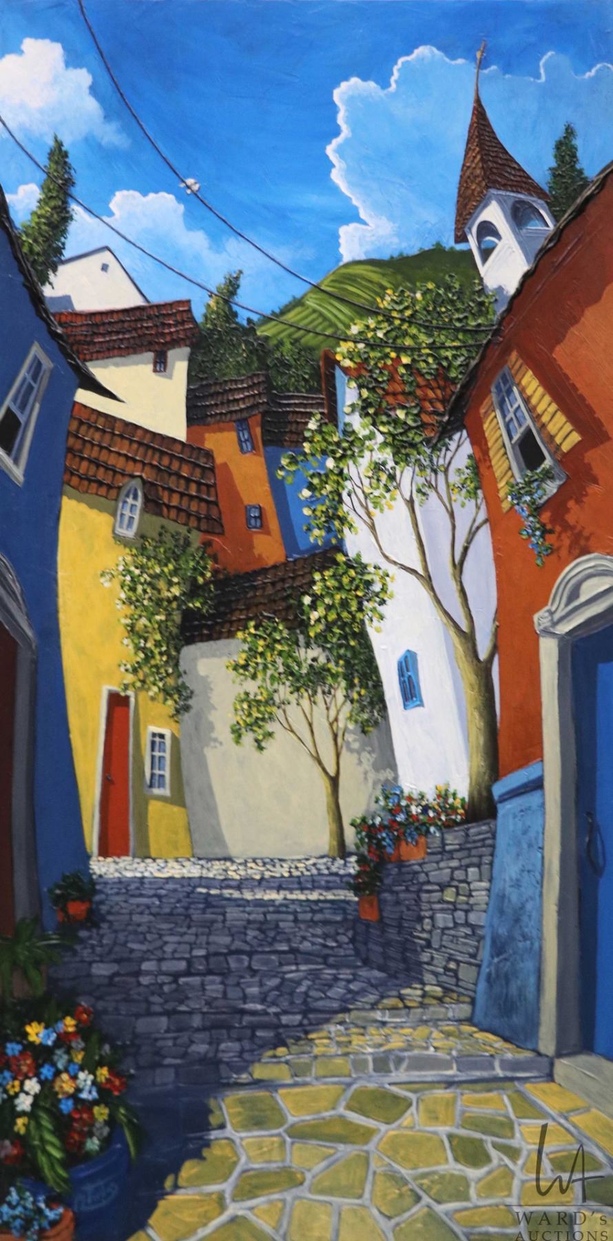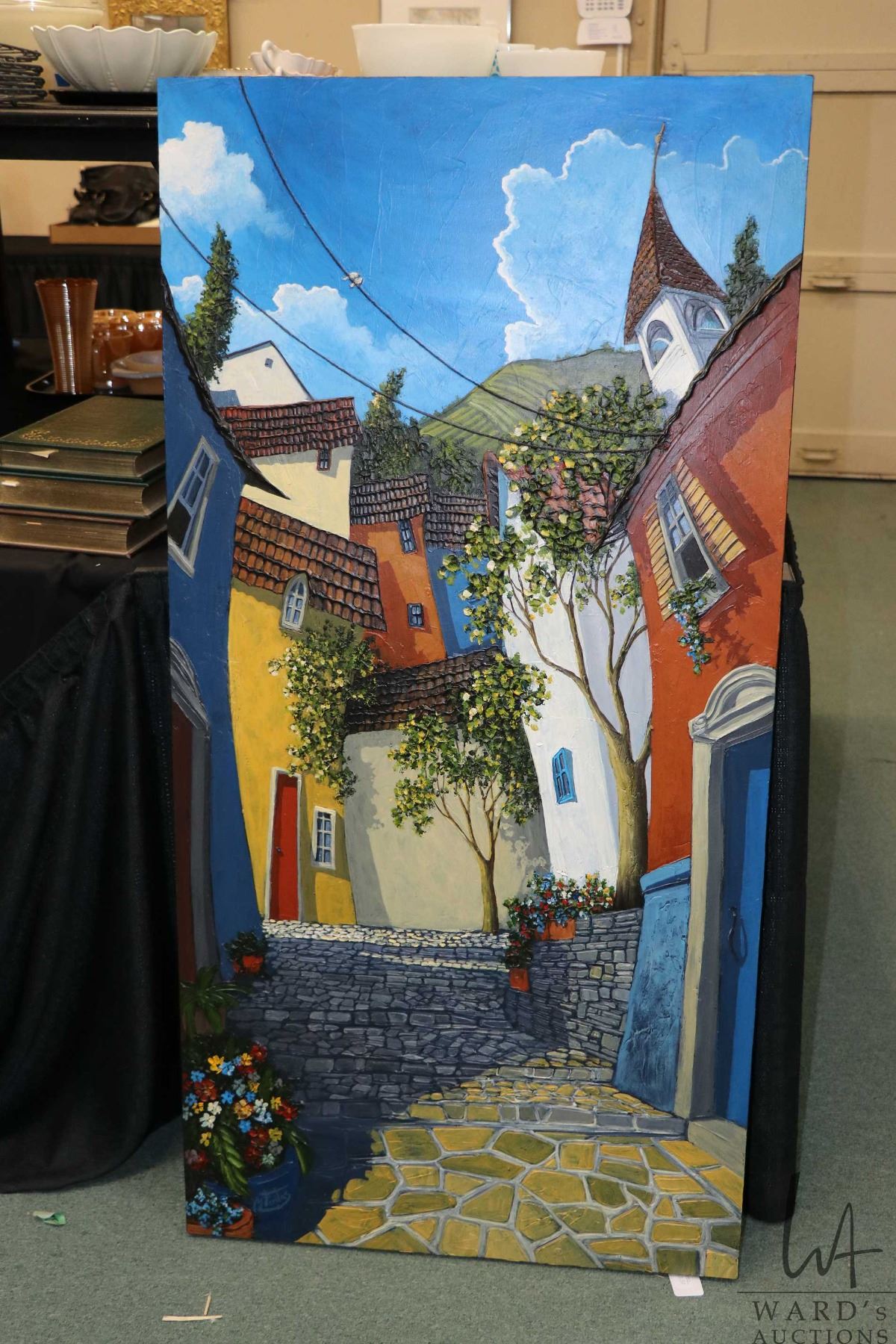 Handpainted textured acrylic on board painting of a European street, signed by artist M. (Miguel) Freitas, 48" X 24". NOTE: This Lot Is Not Available For Shipping. Local pickup only.