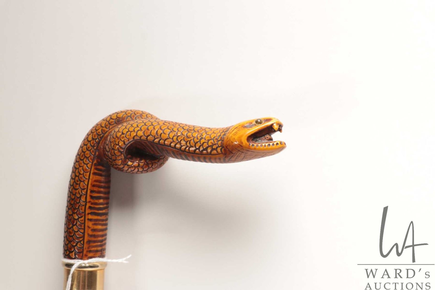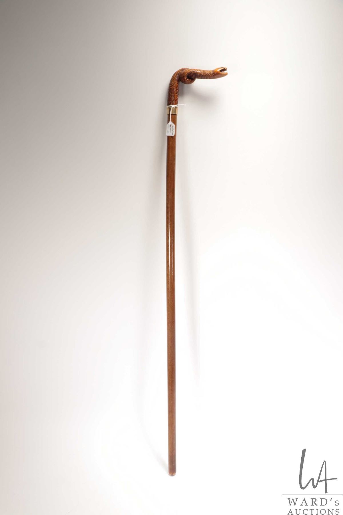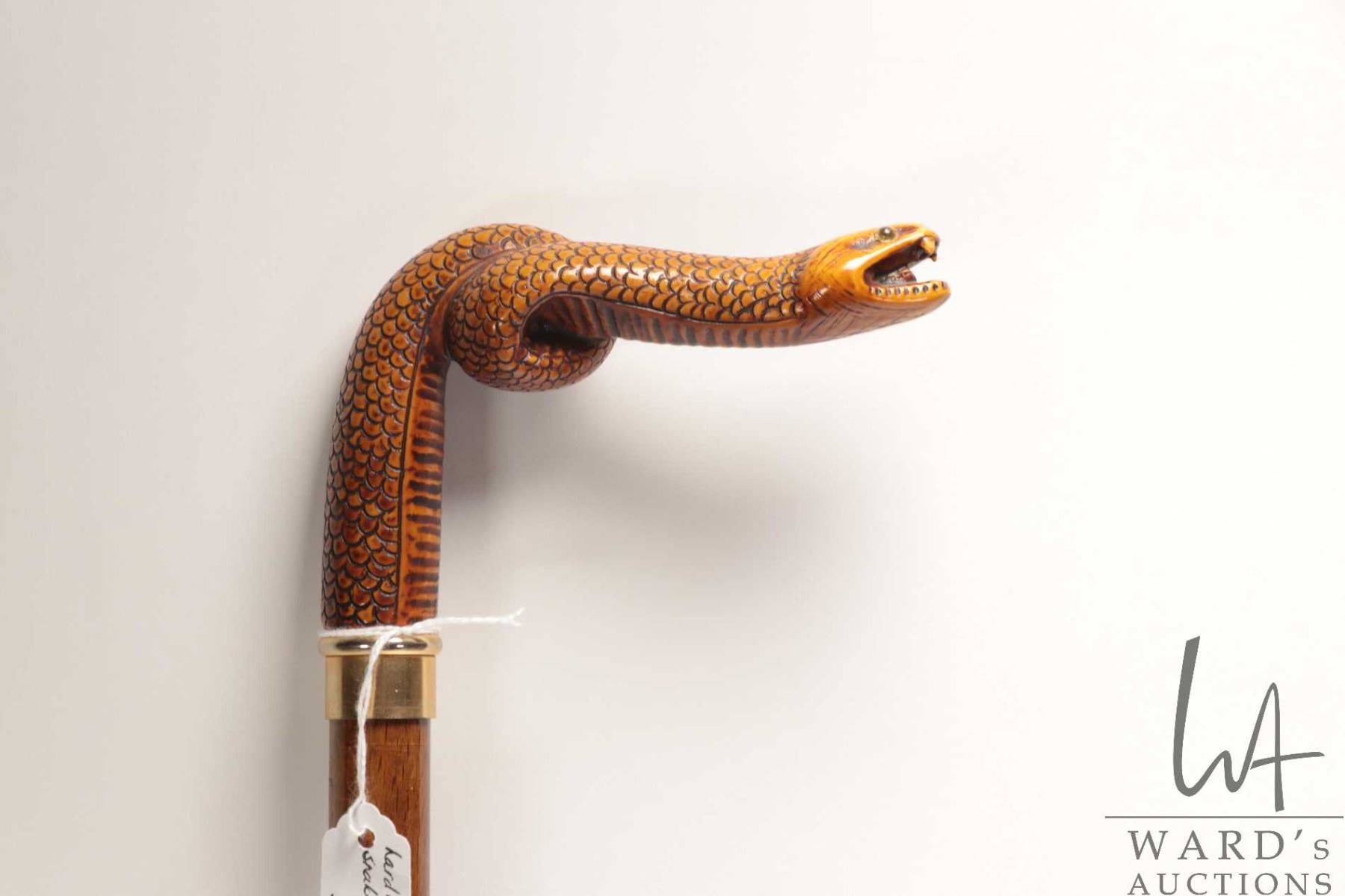 Hardwood walking stick with carved snake handle and brass collar, 35" in height