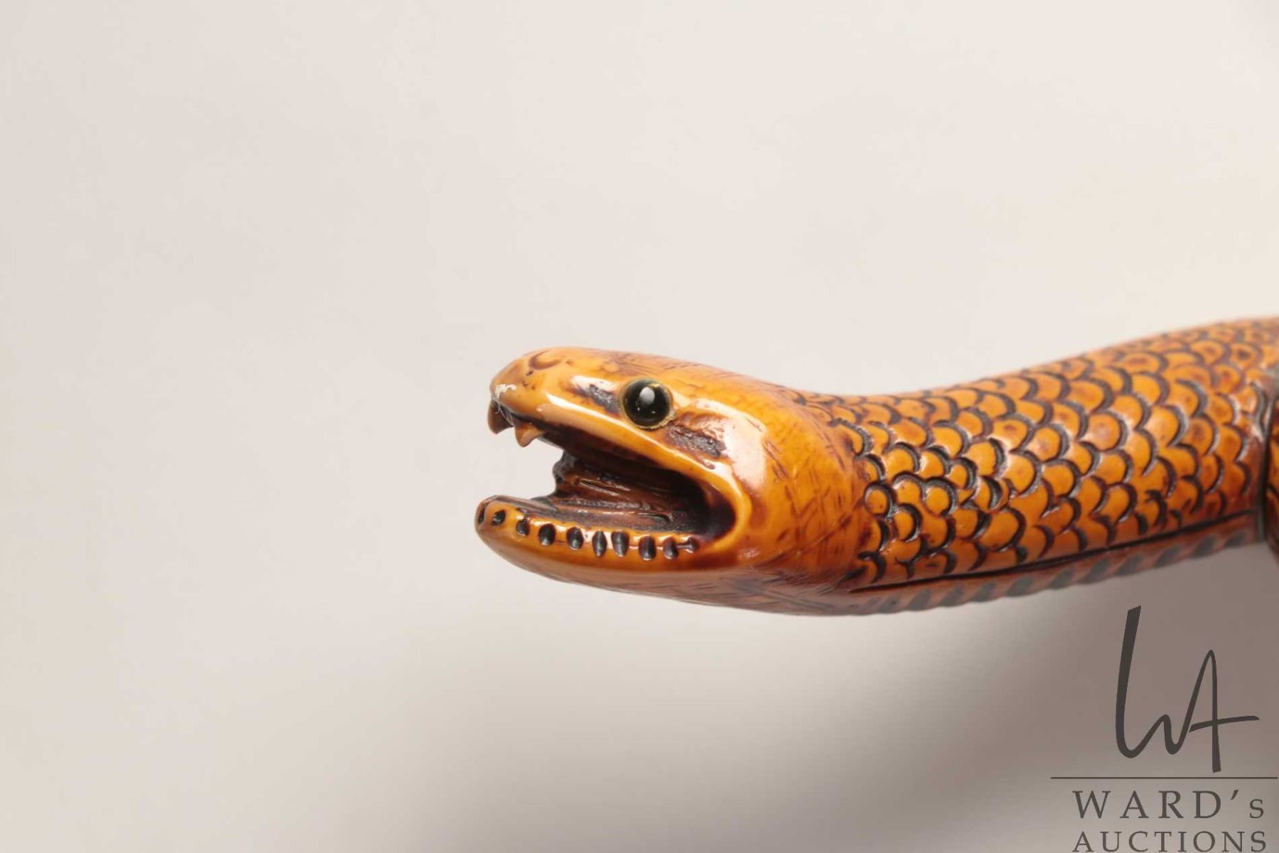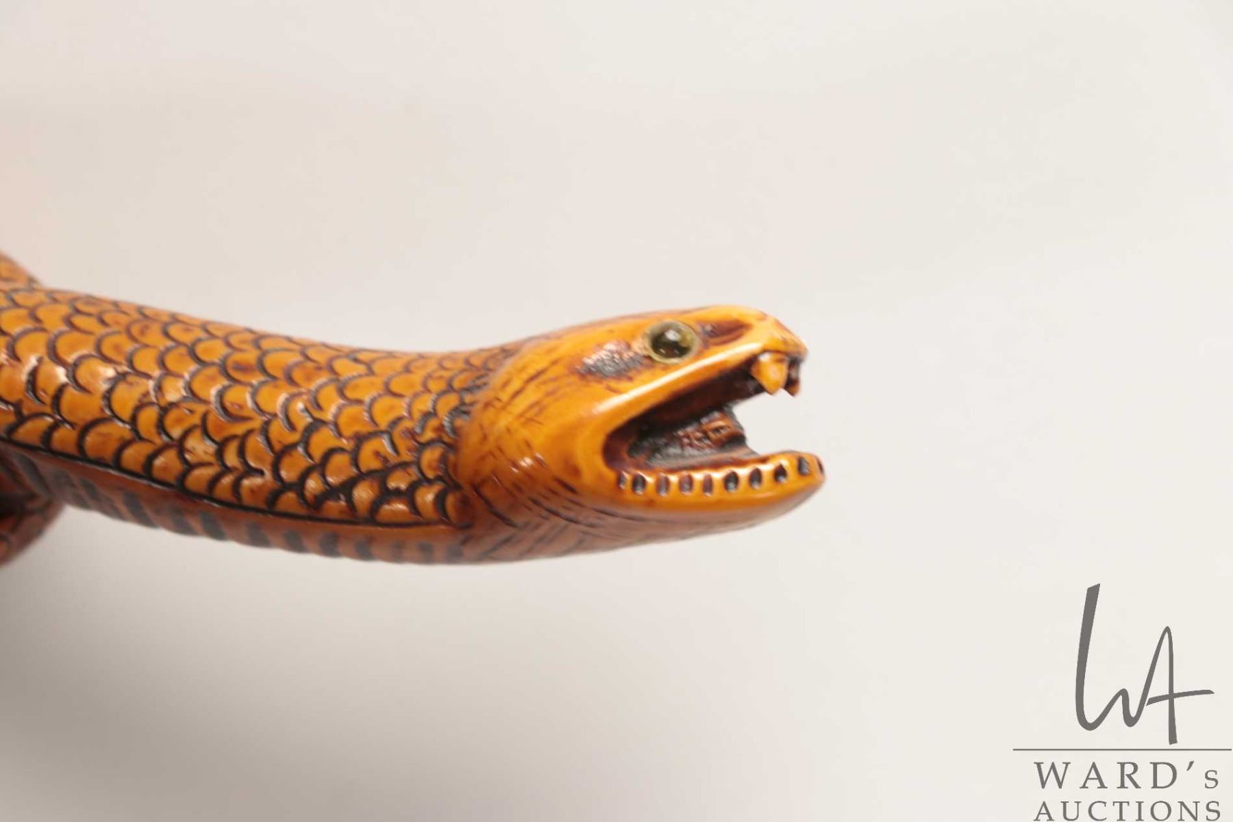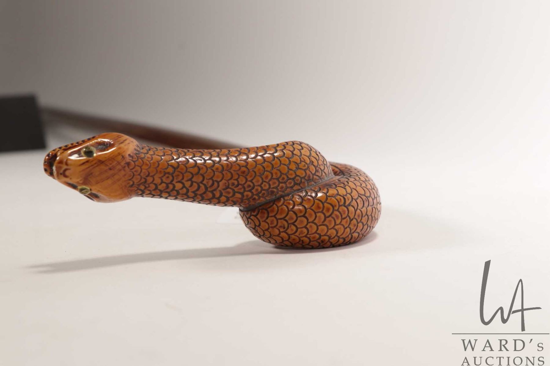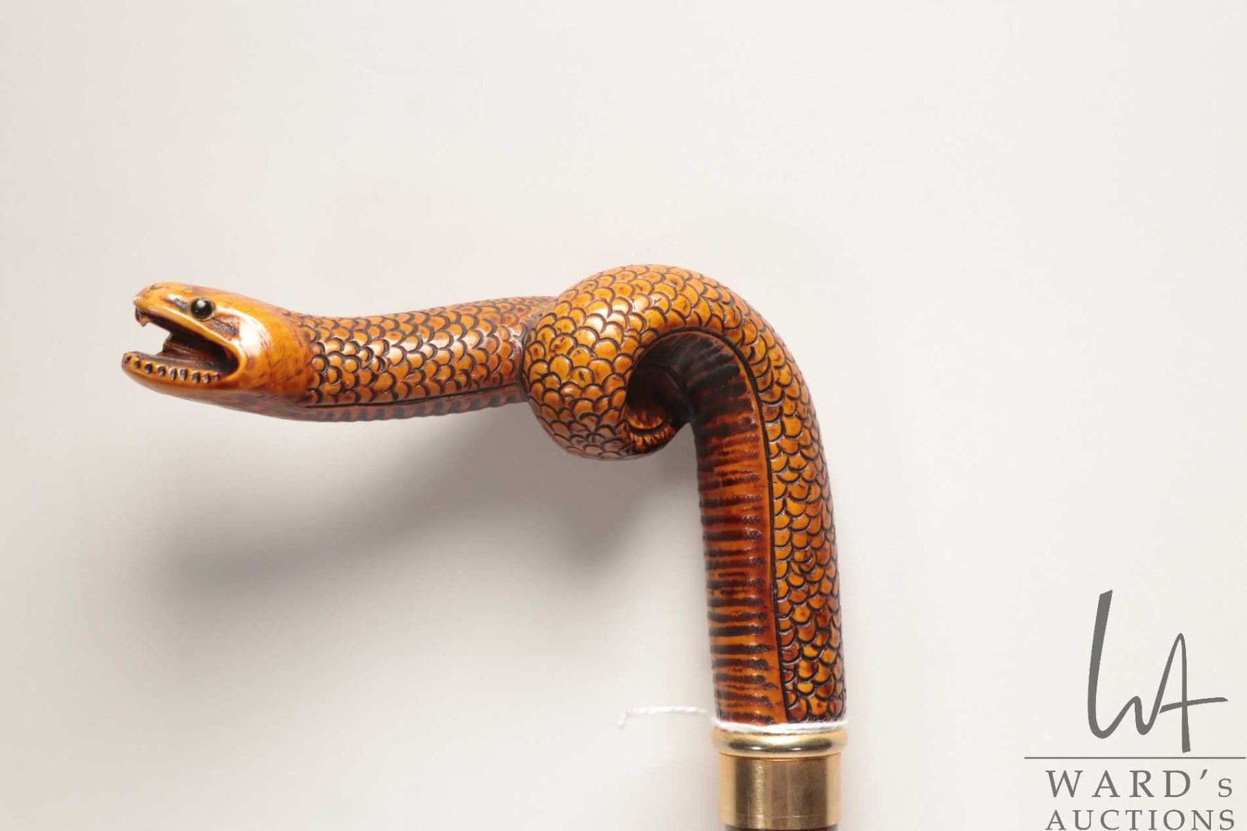 Hardwood walking stick with carved snake handle and brass collar, 35" in height