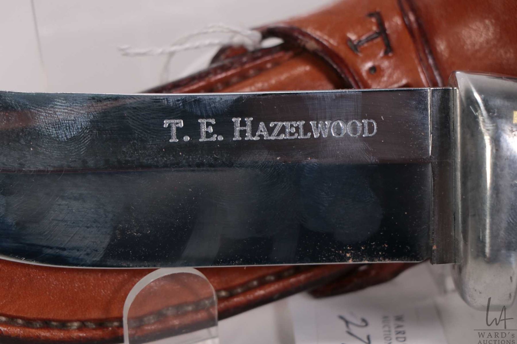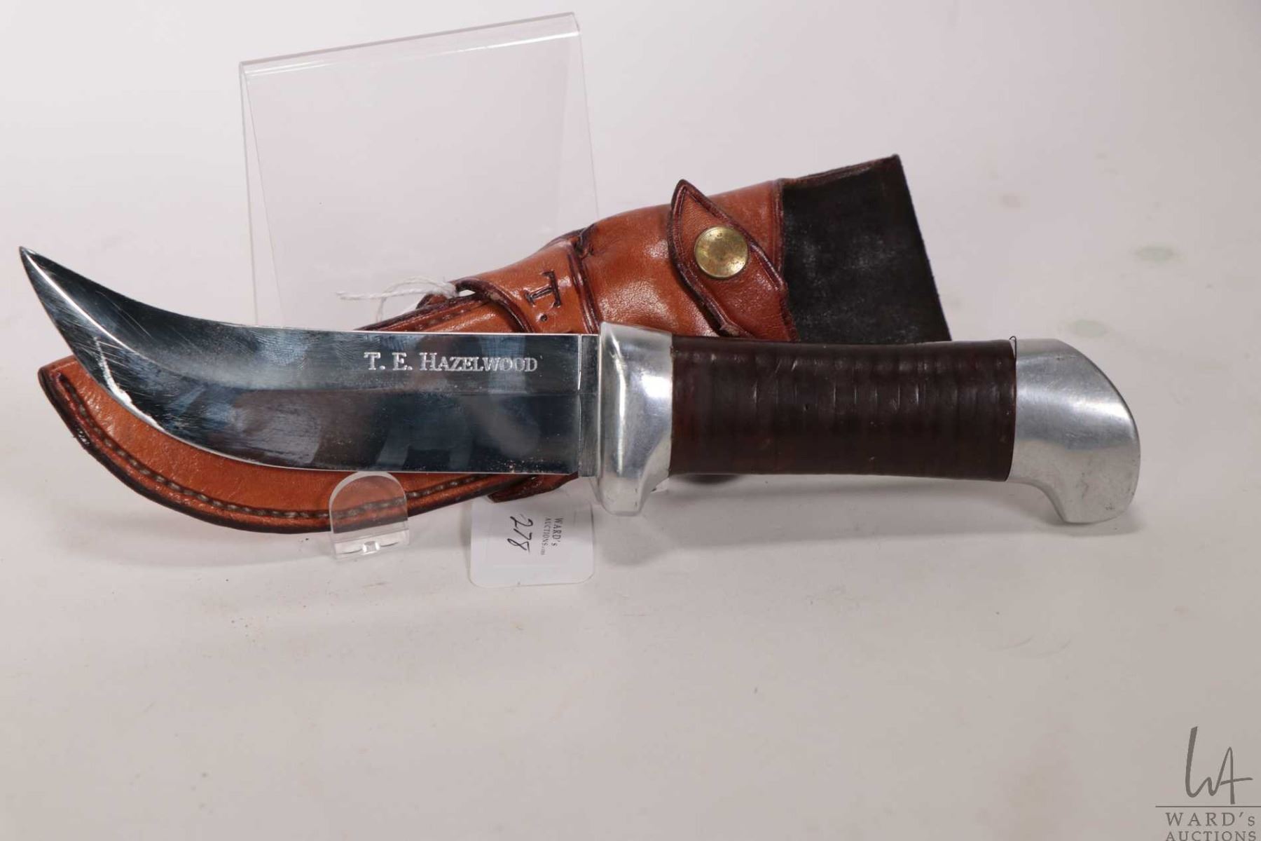 Hazelwood vintage costume left hand skinner with stacked leather grips, aluminium mounts, 5" blade and custom leather sheath