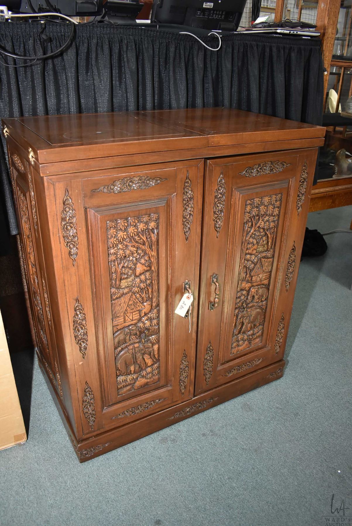 Heavily carved server/bar with carved elephants panels and foliage decoration. Closed up size 36" wi