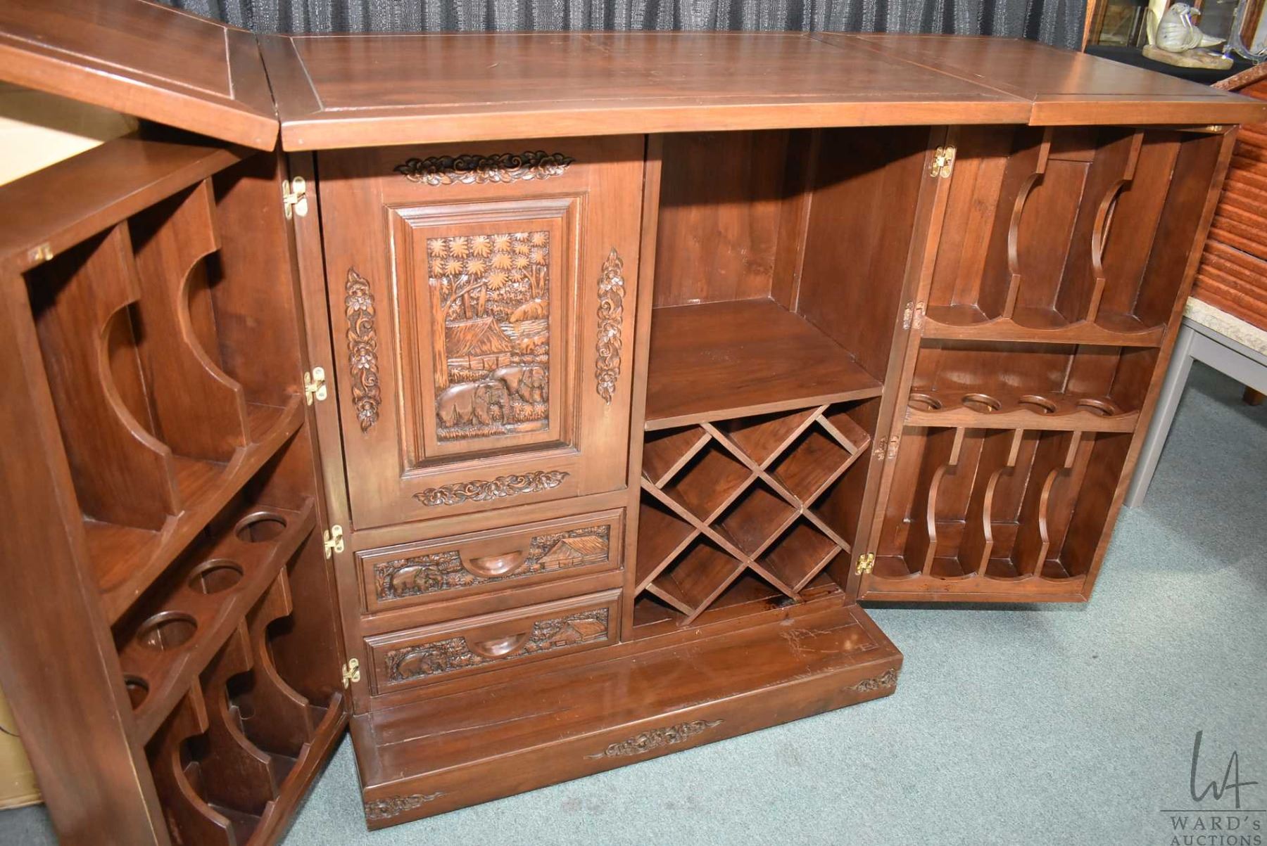 Heavily carved server/bar with carved elephants panels and foliage decoration. Closed up size 36" wide X 22" deep and 41" in height. Has two fold doors, each with bottle storage and flip over top to double the serving size. Interior includes addition bottle storage, rotating section and two drawers. Note- hinges on right door have been replaced