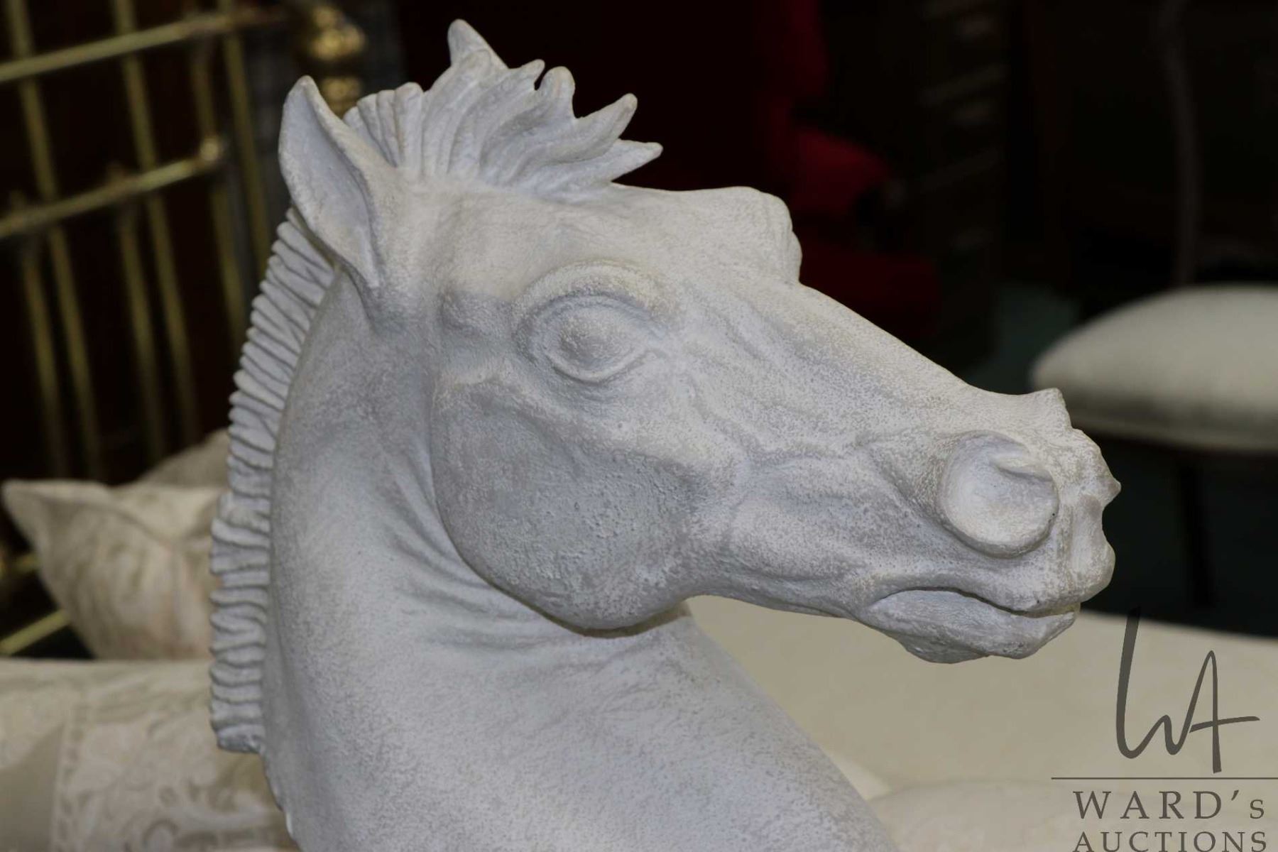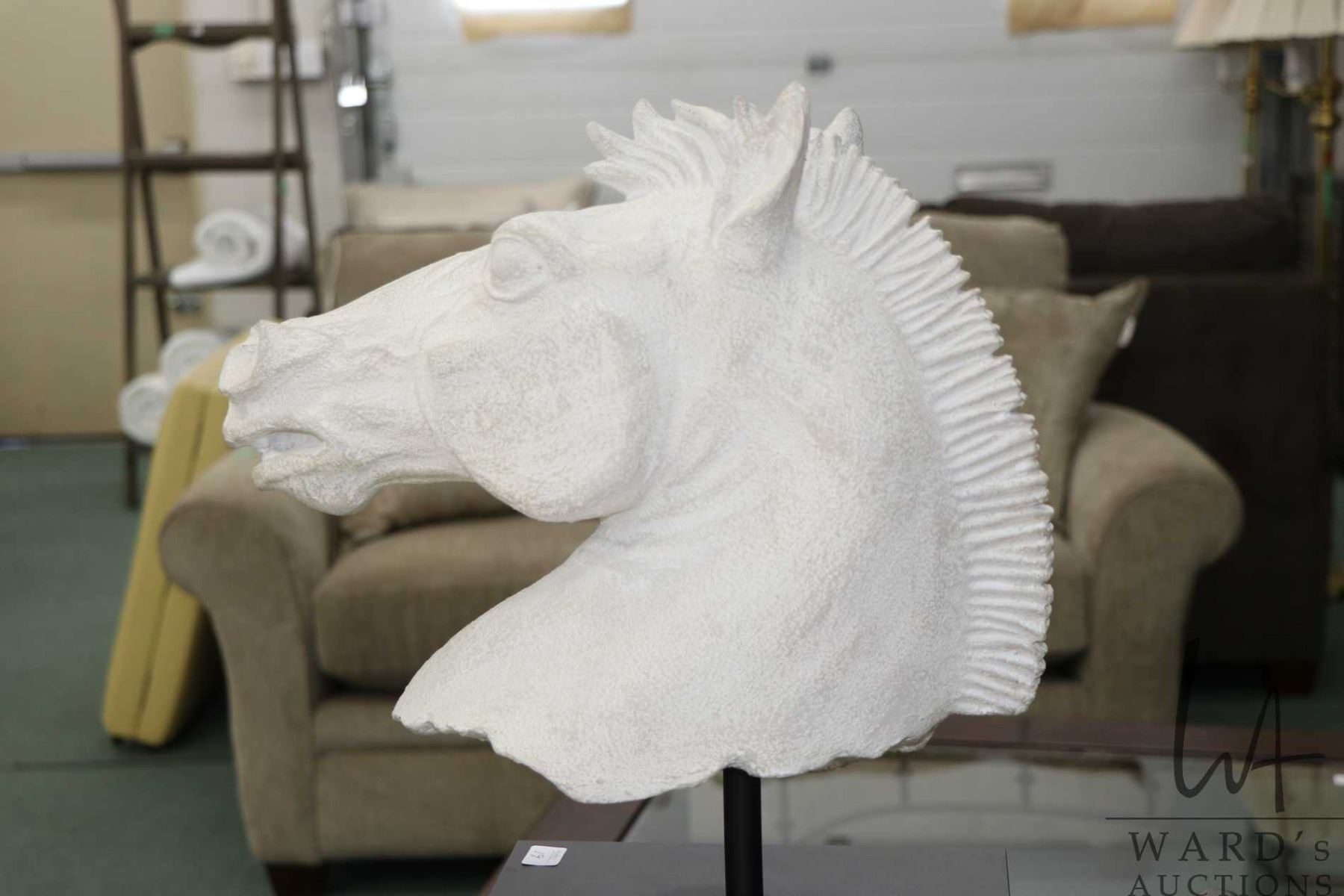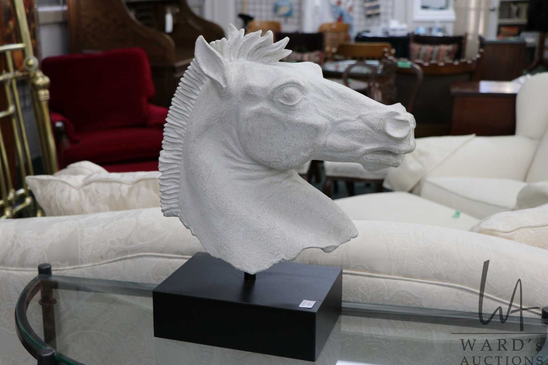 Heavy Austin like horse head on plinth, no signature or markings seen, 18" including base