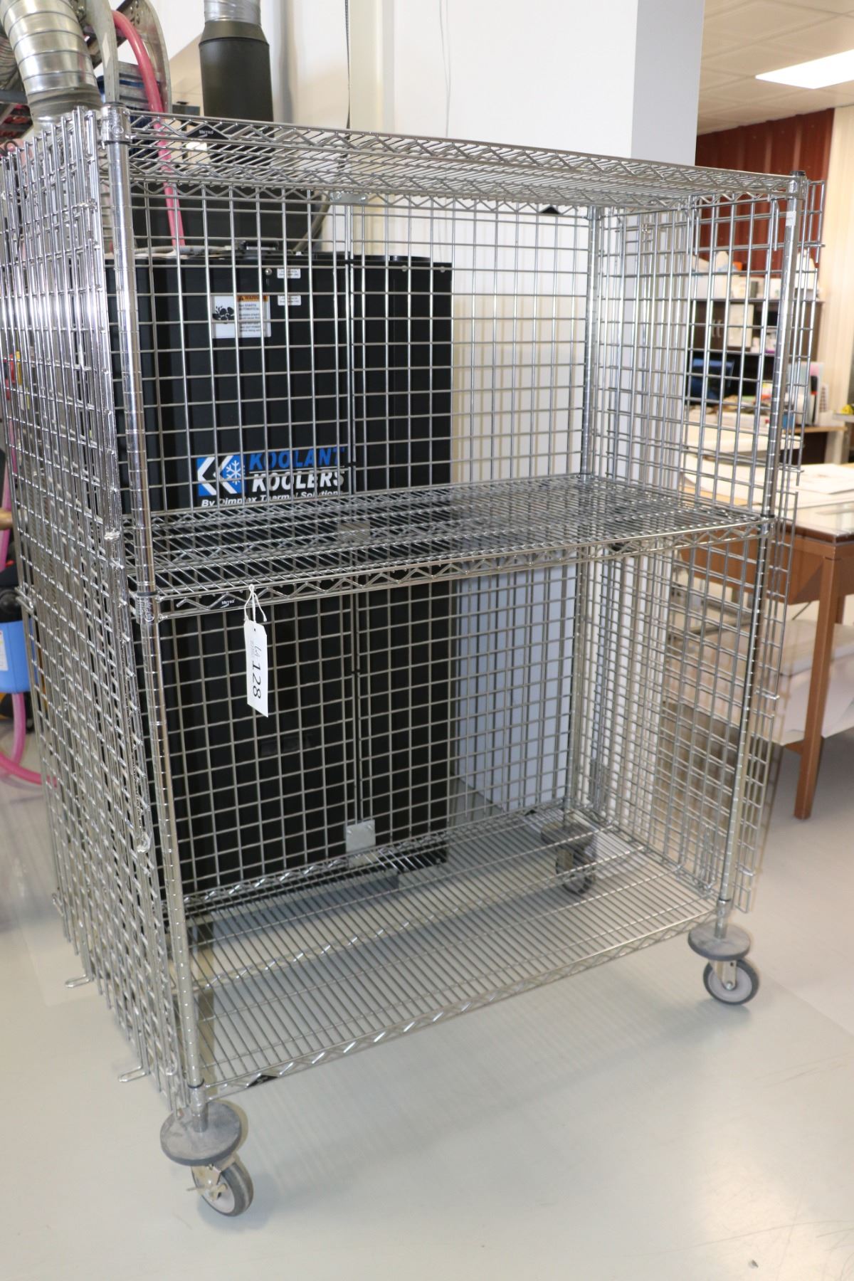 Heavy duty two door, lockable cabinet on castors, one shelf, 68"h x 52"w x 25"d.