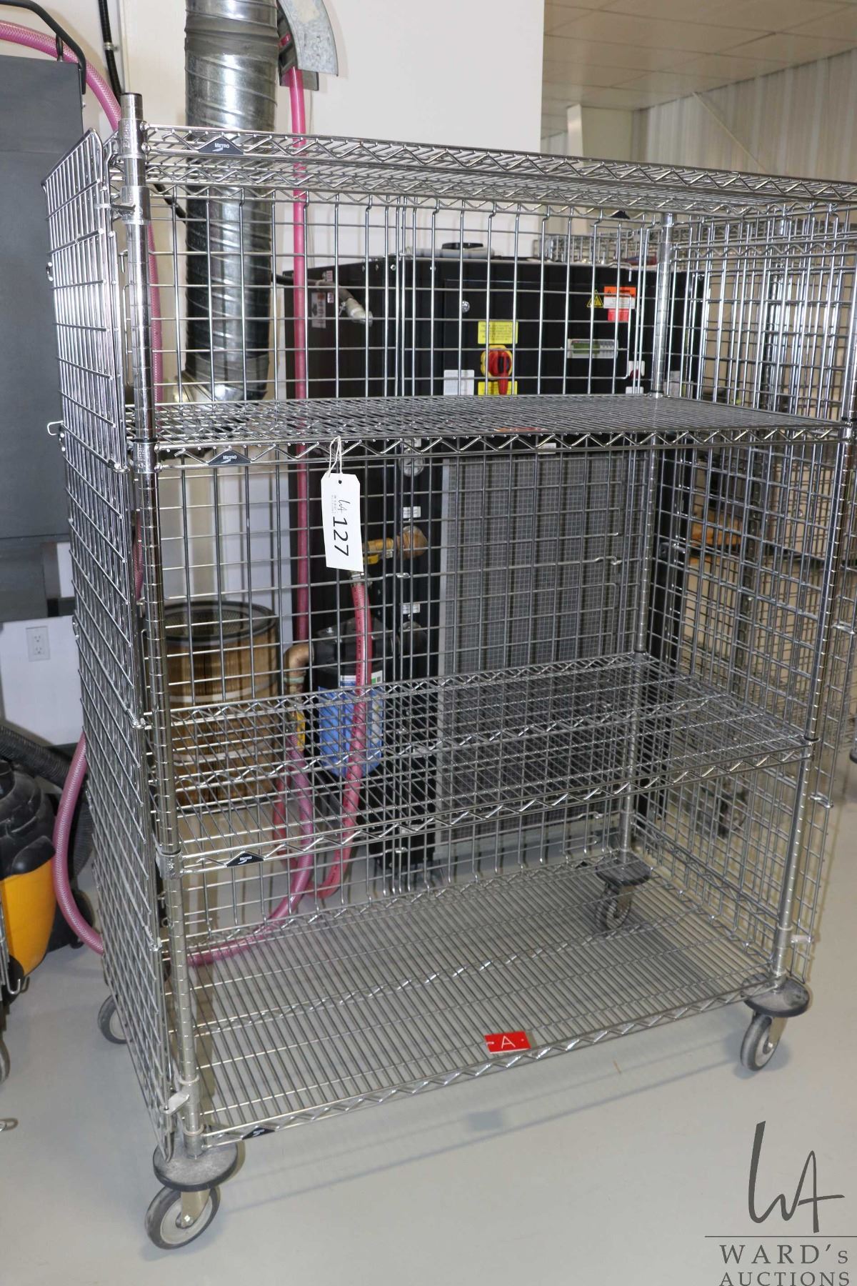 Heavy duty two door, lockable cabinet on castors, two shelves, 68"h x 49"w x 25"d.